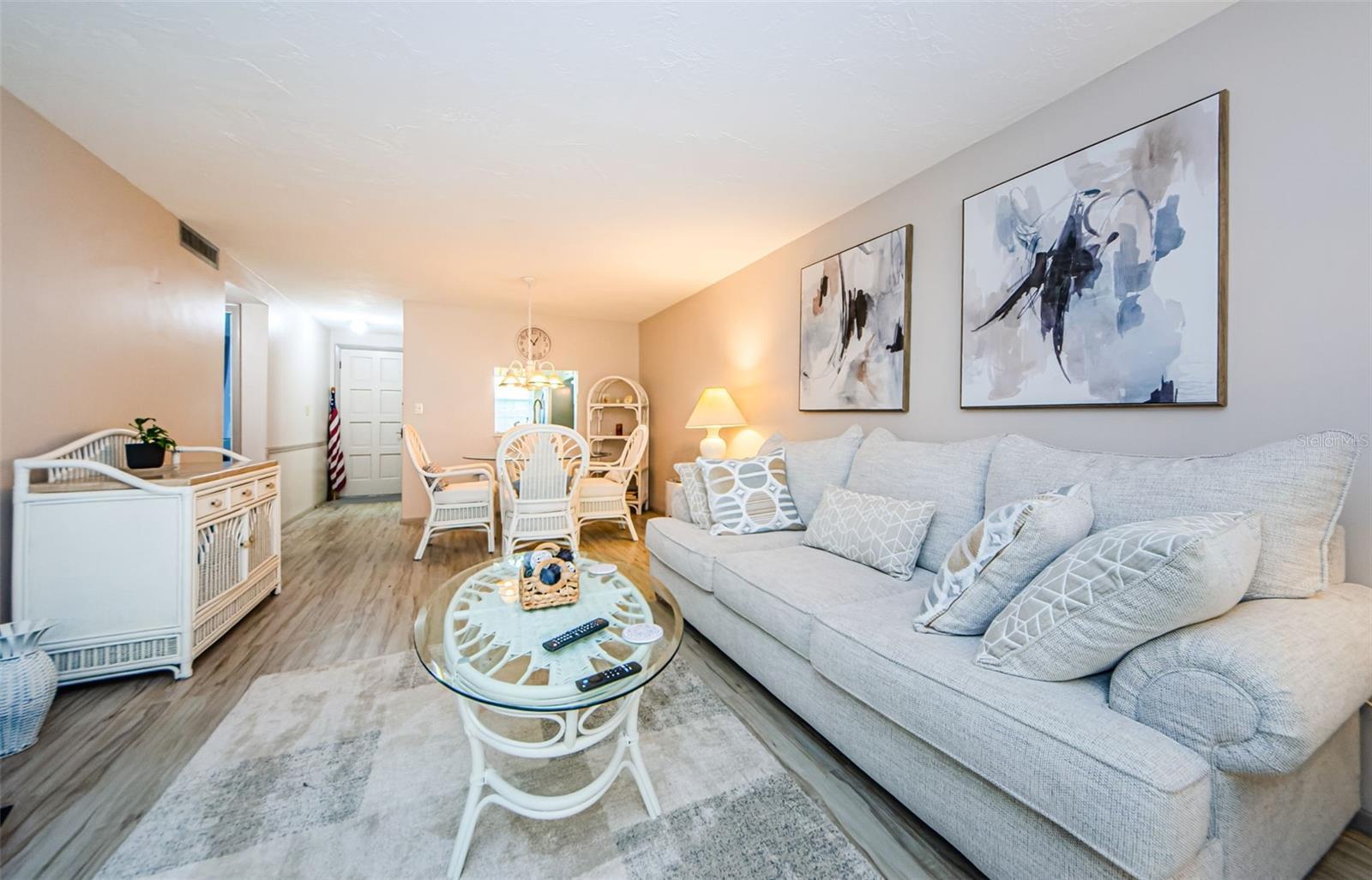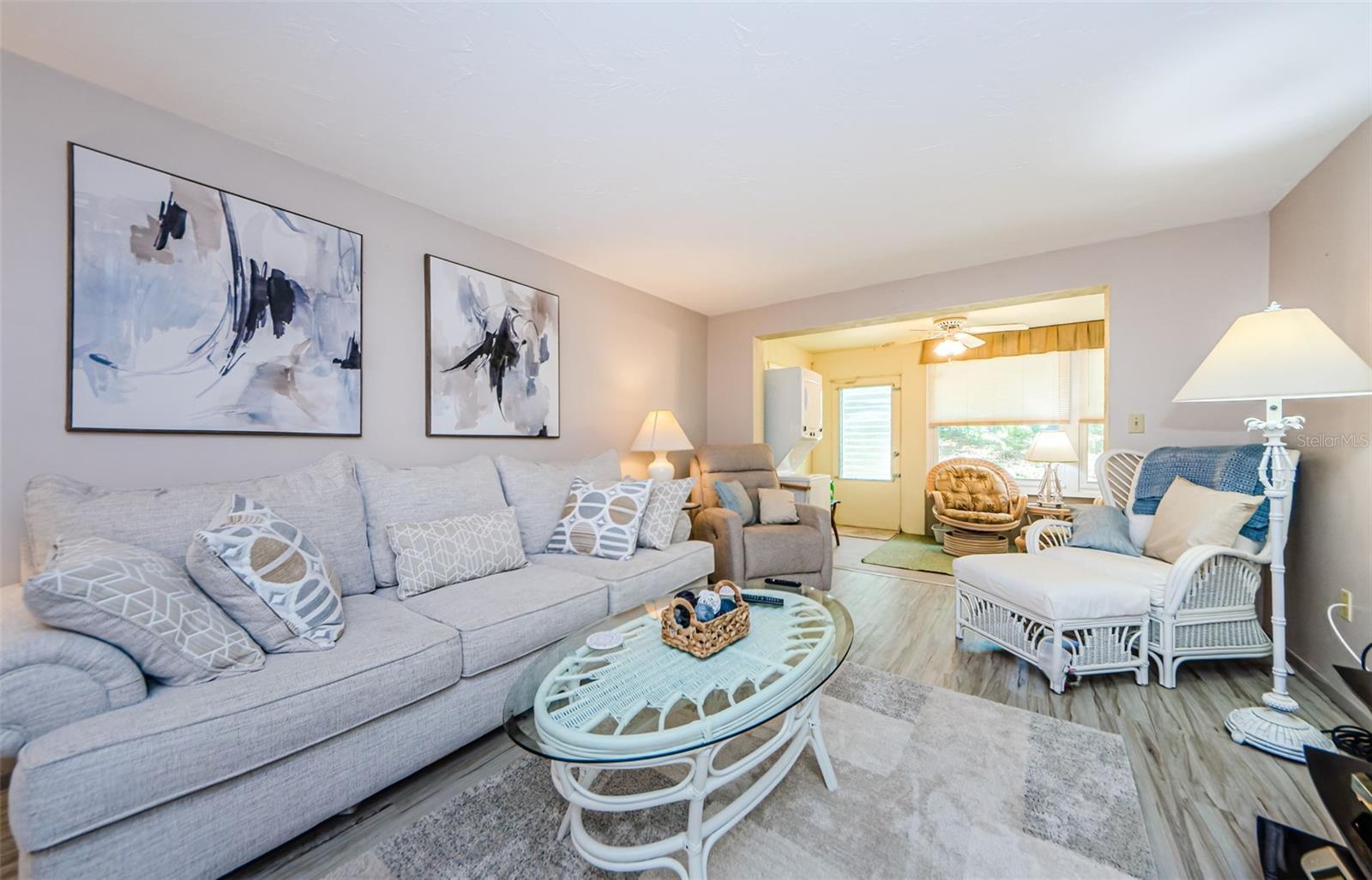 Welcome to this lovely villa with NEW, beautiful luxury vinyl flooring throughout the living area and second bedroom. NO FLOODING OR STORM DAMAGE FROM RECENT HURRICANES. FRESH PAINT AND NEW CARPET JUST INSTALLED IN PRIMARY BEDROOM (JULY 2025). The villa features an open floor plan with a pass-through kitchen window and a new stainless steel double door refrigerator. The villa includes 2 bedrooms and 1 bath, a Florida room, a washer, dryer, and a cozy back patio area. Enjoy the community's amenities that include a clubhouse, shuffleboard, heated pool, and more. The villa is located very close to shopping and restaurants. Garden Beacon Square condos are located 32 miles from Tampa International Airport, approximately 23 miles to the Award-Winning Clearwater Beach, and close to the very desirable cities of Dunedin, Tarpon Springs, & St. Petersburg. Text or call agent for showing requests. No EMAILS. Serious inquiries only please.