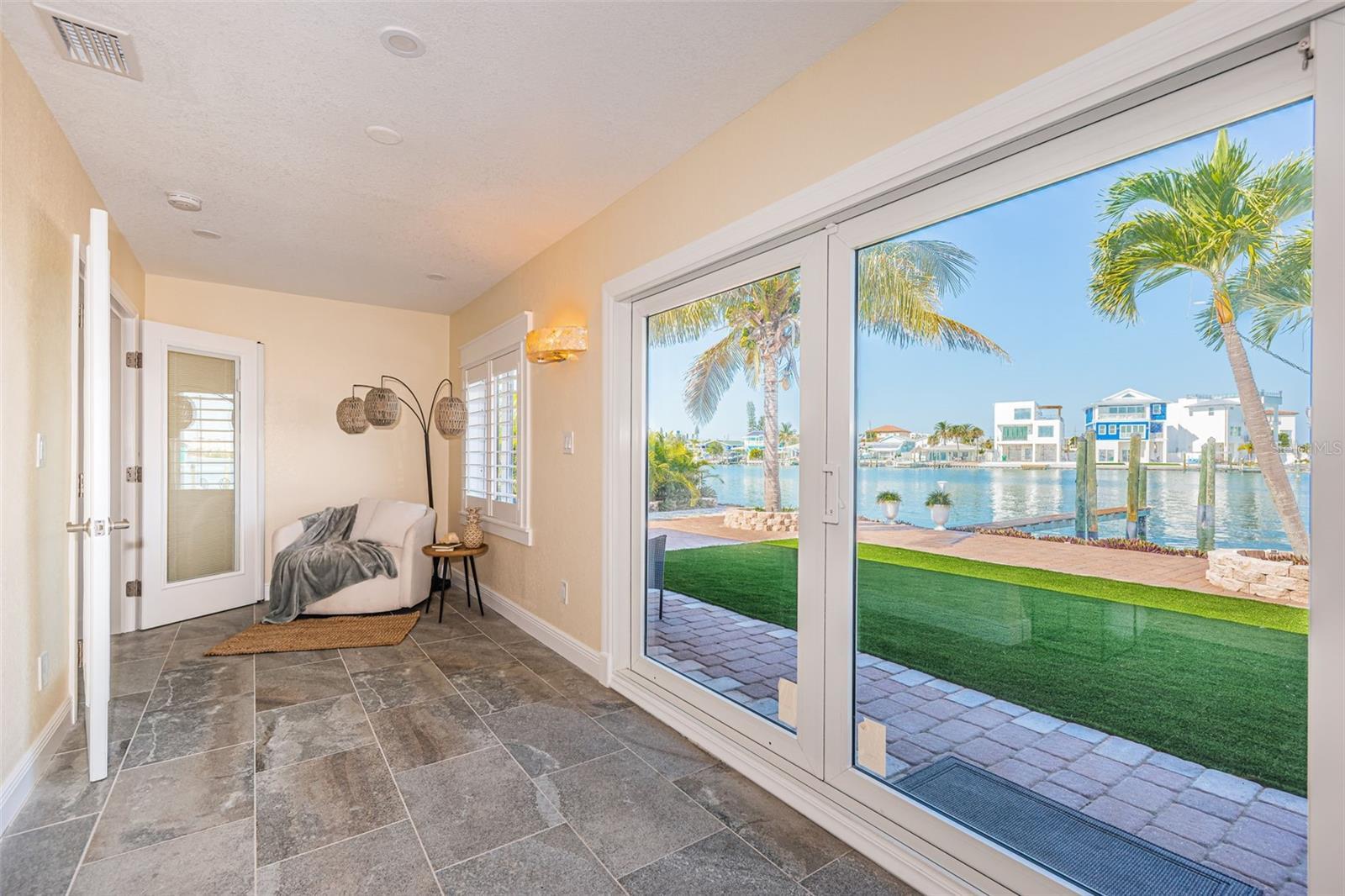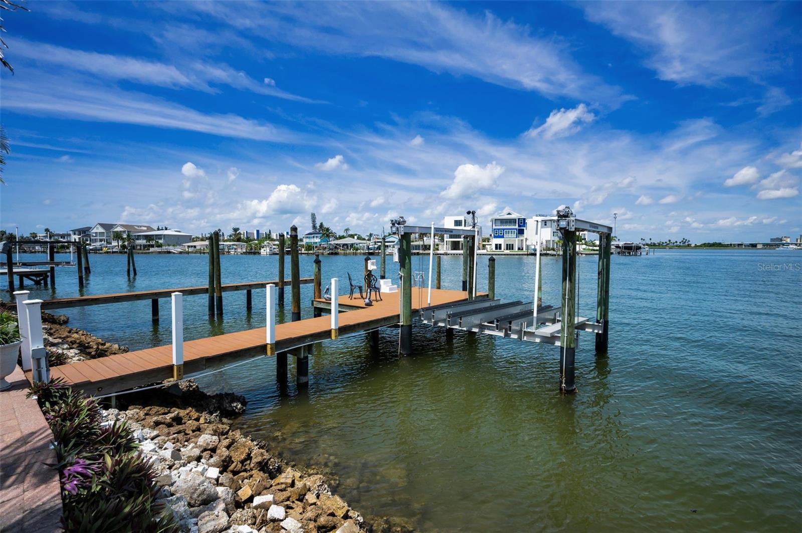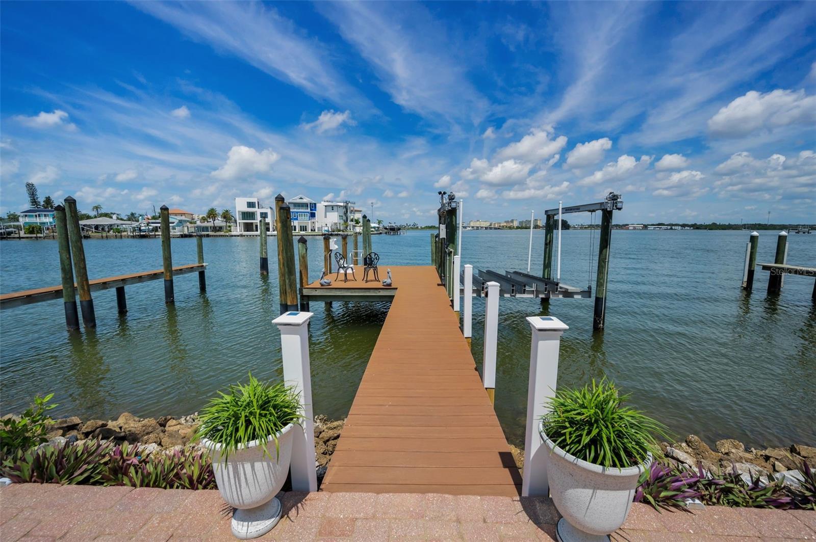 Turn key 4BR and 2BA Madeira Beach waterfront home located directly on the Intracoastal Waterway with deep water, protected dockage, and fast access to open Gulf waters. From your dock, it is about 5 minutes by boat to John’s Pass and then directly out to the Gulf of America. The property includes a 10,000 lb Davit Master lift, a wet berth, and additional moorage that can accommodate a vessel up to 38 feet with a 14-foot beam. The dock is fully equipped with 220 and 110 power, water service, night lighting, and a reinforced seawall with rip rap. Dolphins visit morning and night, and the backyard offers both sunrise and sunset views. The entire waterfront side of the home is lined with impact-rated sliders and windows that bring expansive water views into the main living areas. Interior features include porcelain tile, recessed lighting, plantation shutters, and a 19-by-13 bonus entry room with custom tile. The open living, dining, and kitchen areas flow into a peaceful flex nook outside the primary bedroom, ideal for reading, yoga, meditation, or creative work. The kitchen features waterfall quartz counters, a gas stove, a wine cooler, stainless steel appliances, and a movable stainless steel island that provides flexible prep and entertaining space. The primary suite includes dual vanities, a custom shower, and a large walk-in closet with a skylight. Additional upgrades include a new 200-amp electric panel, central AC, two mini split units, a gas washer and dryer, blown-in attic insulation, a whole-house water purification system, electric roll-down shutters, and new gutters. The garage features a hurricane-rated door, LED lighting, and built-in storage. This home provides rare move-in-ready waterfront living with excellent dockage, deep water, protected mooring, and fast Gulf access. Homes with this combination of features in Madeira Beach are limited. Do not miss this one.