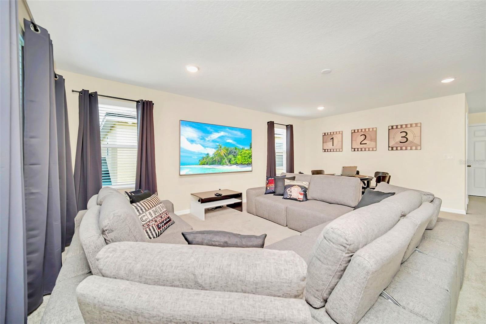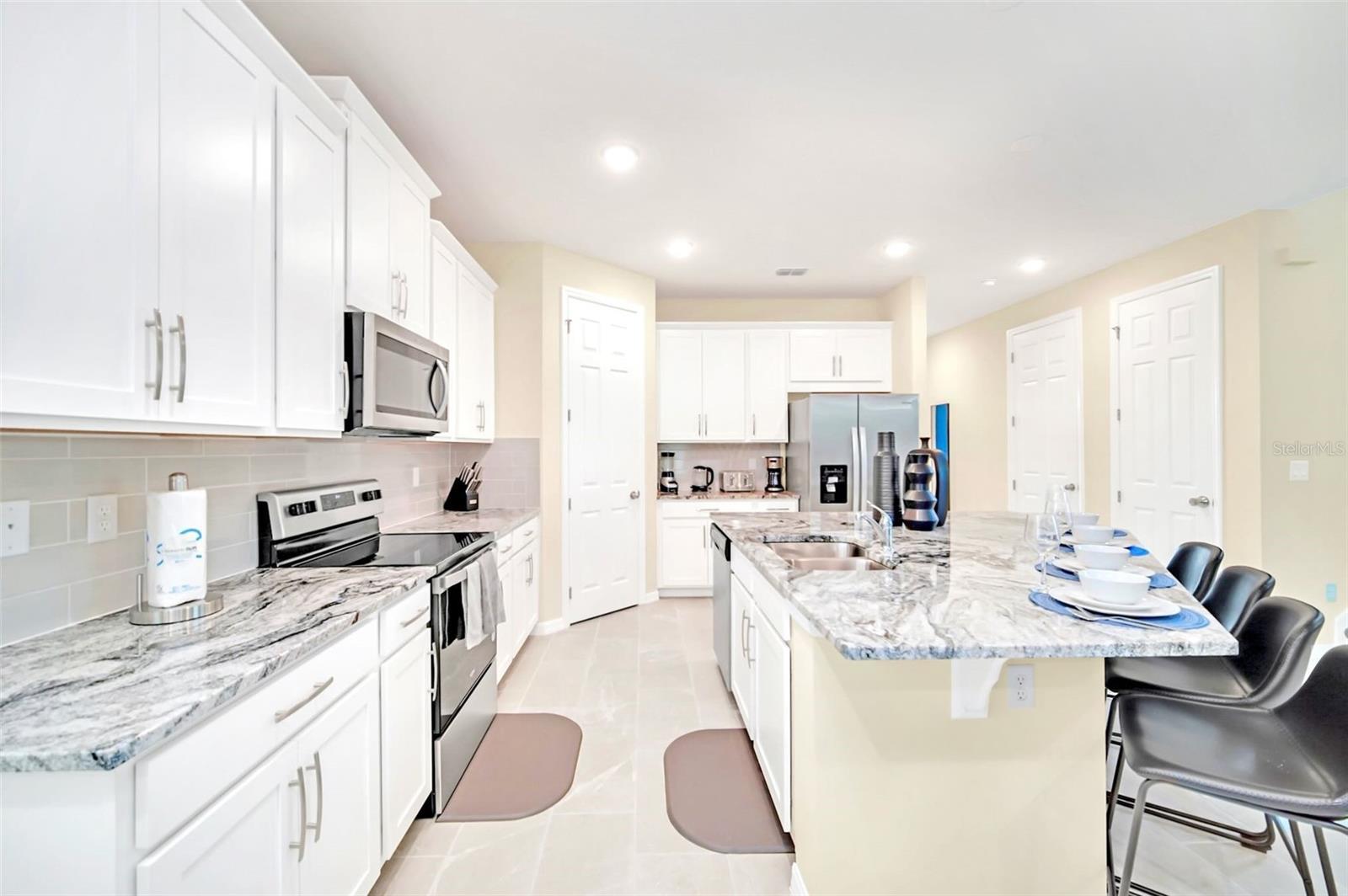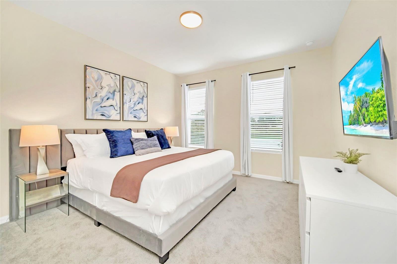 Experience the pinnacle of vacation living in this stunning, fully furnished Solara Resort home. Boasting 7 bedrooms and 6.5 baths, this professionally decorated property offers preserve views from the private, screened-in pool and spa and beautiful lake views from the front. Inside, an open-concept floor plan seamlessly connects a large, gourmet kitchen to a spacious family room, both overlooking the covered patio and resort-style pool area. This premier vacation rental is not only a beautiful retreat but also a proven investment, with a strong rental history and zoning for short-term rentals. As a resident of Solara Resort, you'll enjoy world-class amenities including a grand clubhouse, beach volleyball, and soccer fields. The HOA conveniently covers internet, cable, landscaping, and trash valet. Its prime location off US-192 provides quick and easy access to Walt Disney World, shopping, and dining.