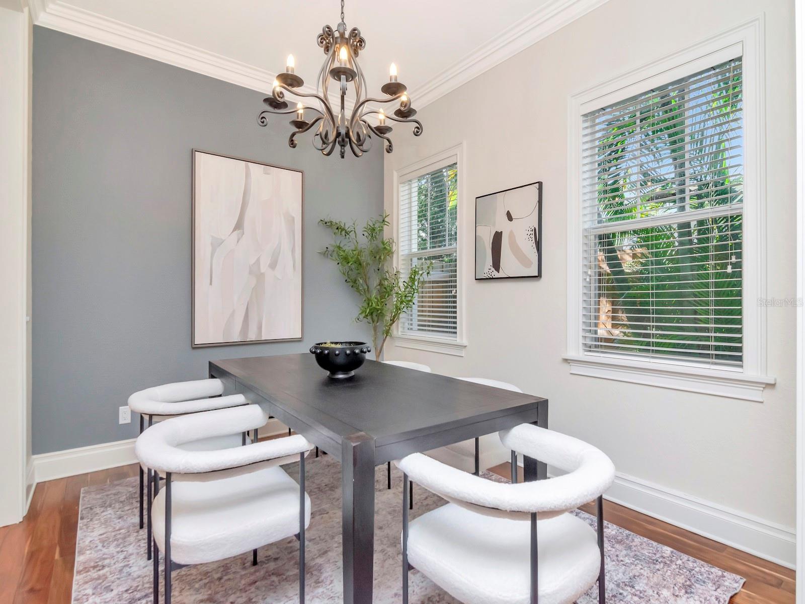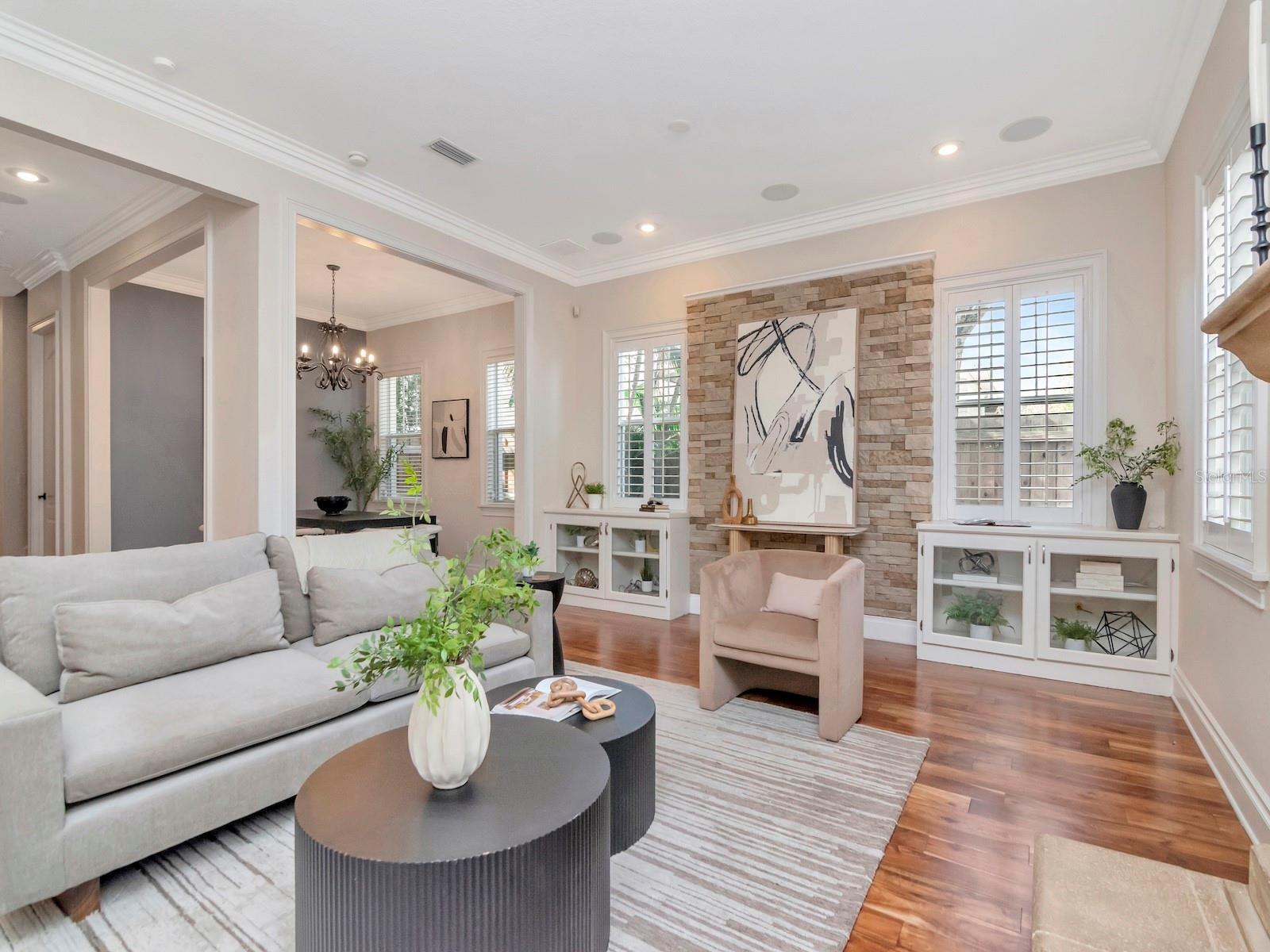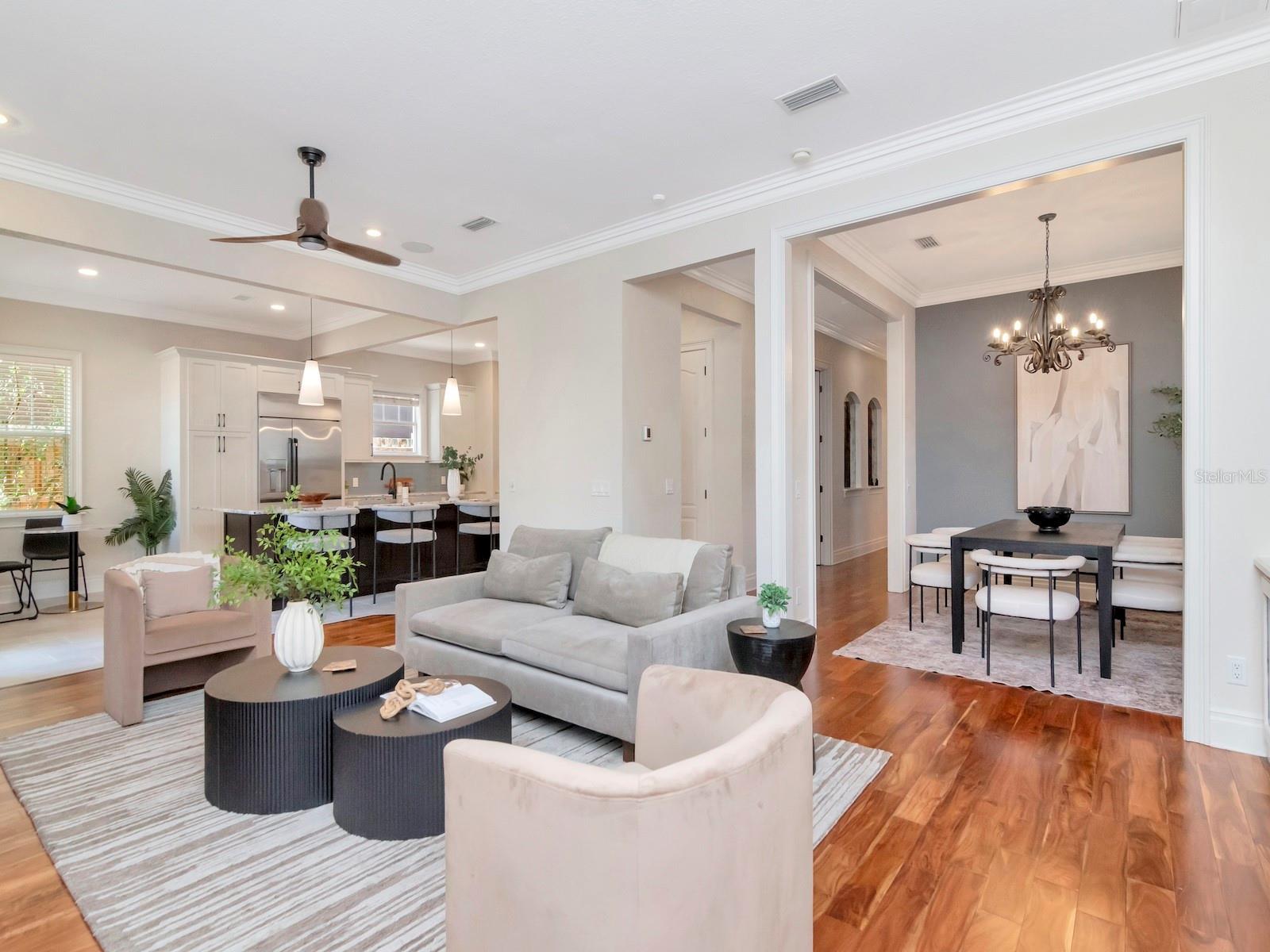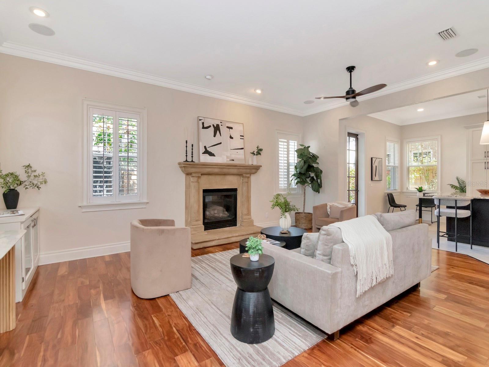 - Crown Molding, Eat-in Kitchen, High Ceilings, Kitchen/Family Room Combo, Open Floorplan, PrimaryBedroom Upstairs, Stone Counters, Walk-In Closet(s), Window Treatments
