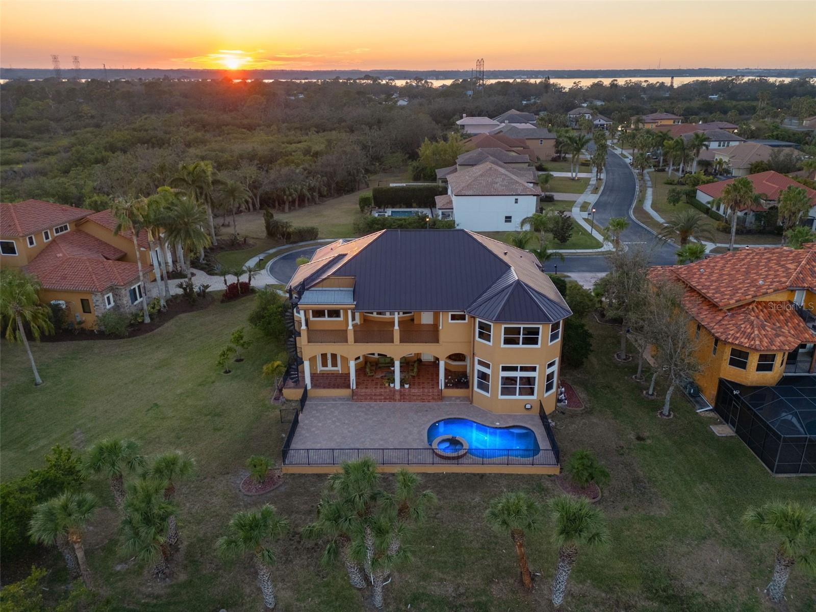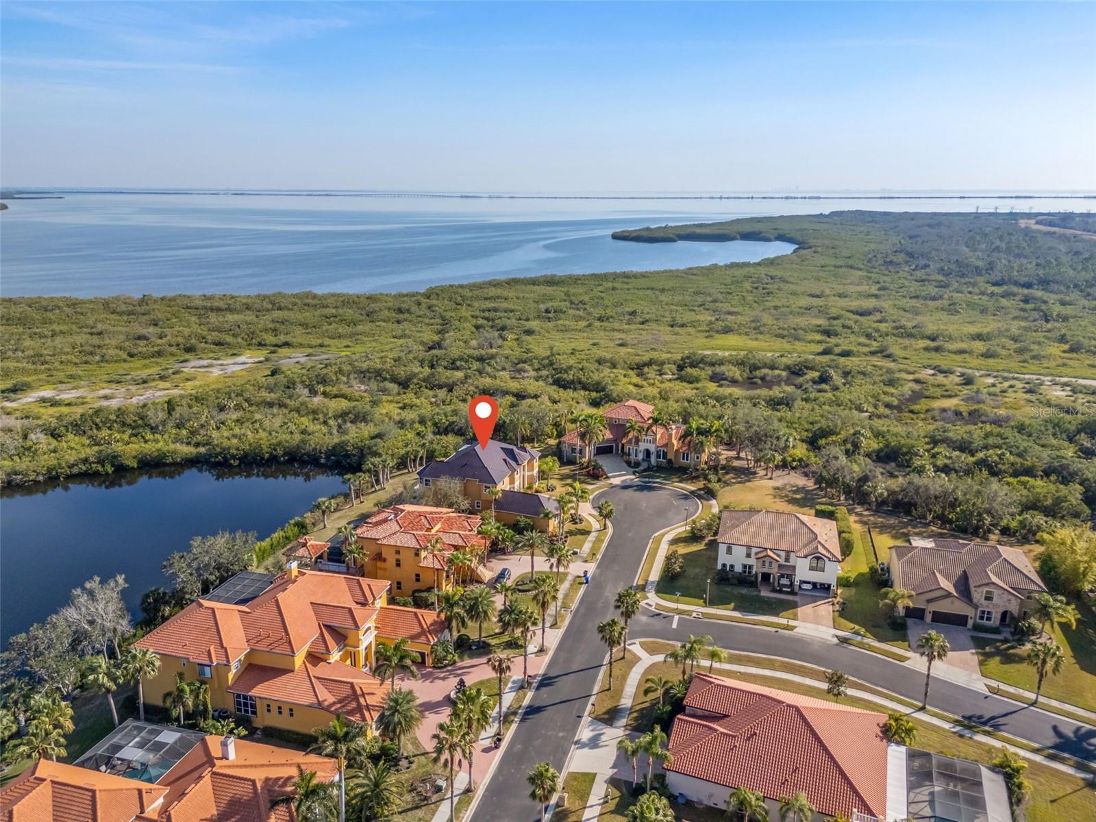 Luxury living with an abundance of privacy, amazing views, an open floor plan, and ample closet space are just a start. This cul-de-sac custom-built home of unparalleled elegance within a gated enclave features breathtaking water views and gleaming natural light without compromising privacy. Spanning 5,260 square feet, this 2 story meticulously designed residence features 4 bedrooms, study, game room, retreat room, 6 bathrooms, an elevator and an extended 3-car garage. Step inside to soaring ceilings, coffered detailing, and expansive windows with abundant light as well as privacy. This gourmet kitchen is a chef’s dream, outfitted with a top of the line Wolf range, stainless steel appliances, built-in ovens, microwave, beverage fridge, and generous walk-in pantry with attached second refrigerator. The open-concept kitchen, family room, breakfast nook, and transitional area provide a seamless flow for both everyday living and entertaining with direct access to covered patio. The main level also hosts spacious living room, bedroom with a full bath, and game area. Hardwood stairs, elevator and exterior spiral staircase connect to the second floor. The primary suite is a private sanctuary featuring an opulent ensuite bath, a custom walk-in closet with an organizing system, and breathtaking, unobstructed bay views with patio access. Large second-floor retreat room offers more opportunities for relaxation and gatherings. Outdoor living is unparalleled with two covered patios and a third-floor crows nest all with panoramic water views of Tampa Bay, and a custom-designed saltwater Pebble-Tec pool & spa to enjoy Florida’s year-round sunshine. The extended garage features larger doors, and built-in closets for maximum storage. Built with both style and security in mind, this home includes hurricane clips, fabric shutters, and remained high & dry during Hurricane Helene & Milton. A brand new high-end aluminum roof (2024) adds lasting durability for years to come. Enjoy your resort-style amenities and a prime central location with less than 30 minutes from St. Pete/Clearwater International Airport, Tampa International Airport and top-rated private and public schools. Within the hidden treasure of Pinellas County, you are close to great shopping, specialty dining, and Florida's beautiful gulf beaches. Discover the pinnacle of Luxury, privacy, and serenity within this unique home that can be yours today.