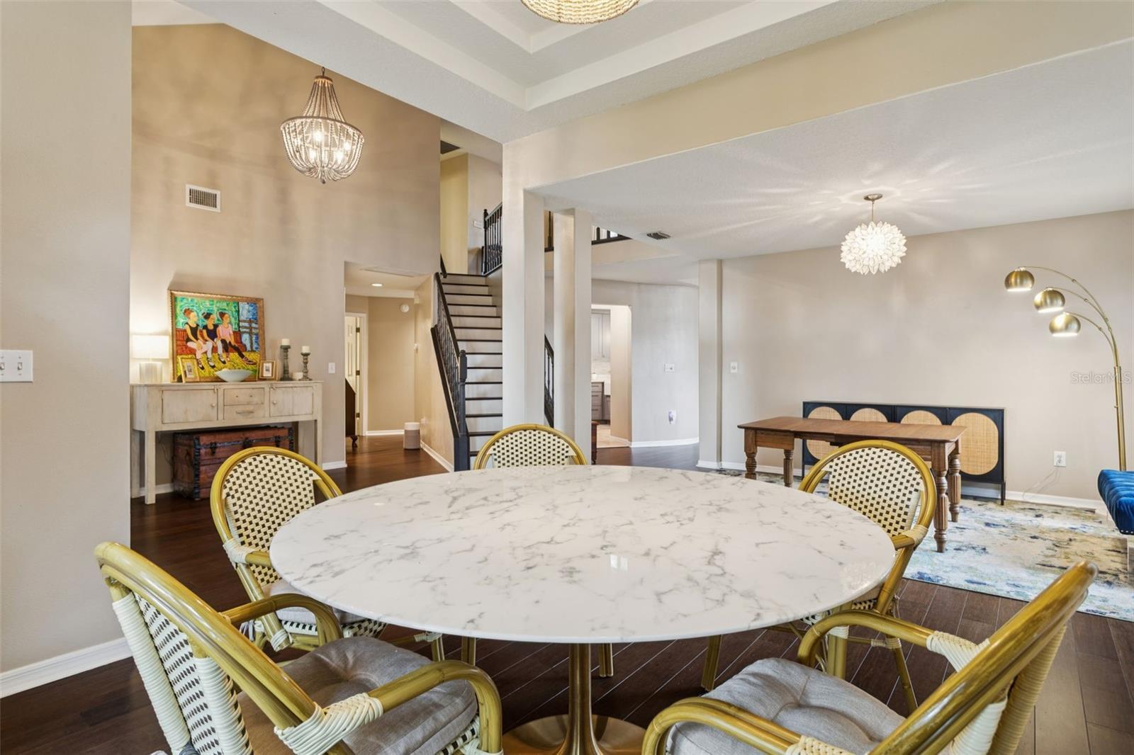 - Cathedral Ceiling(s), Ceiling Fans(s), Eat-in Kitchen, High Ceilings, Living Room/Dining Room Combo, Primary Bedroom Main Floor, Split Bedroom, Stone Counters, Thermostat, Walk-In Closet(s)