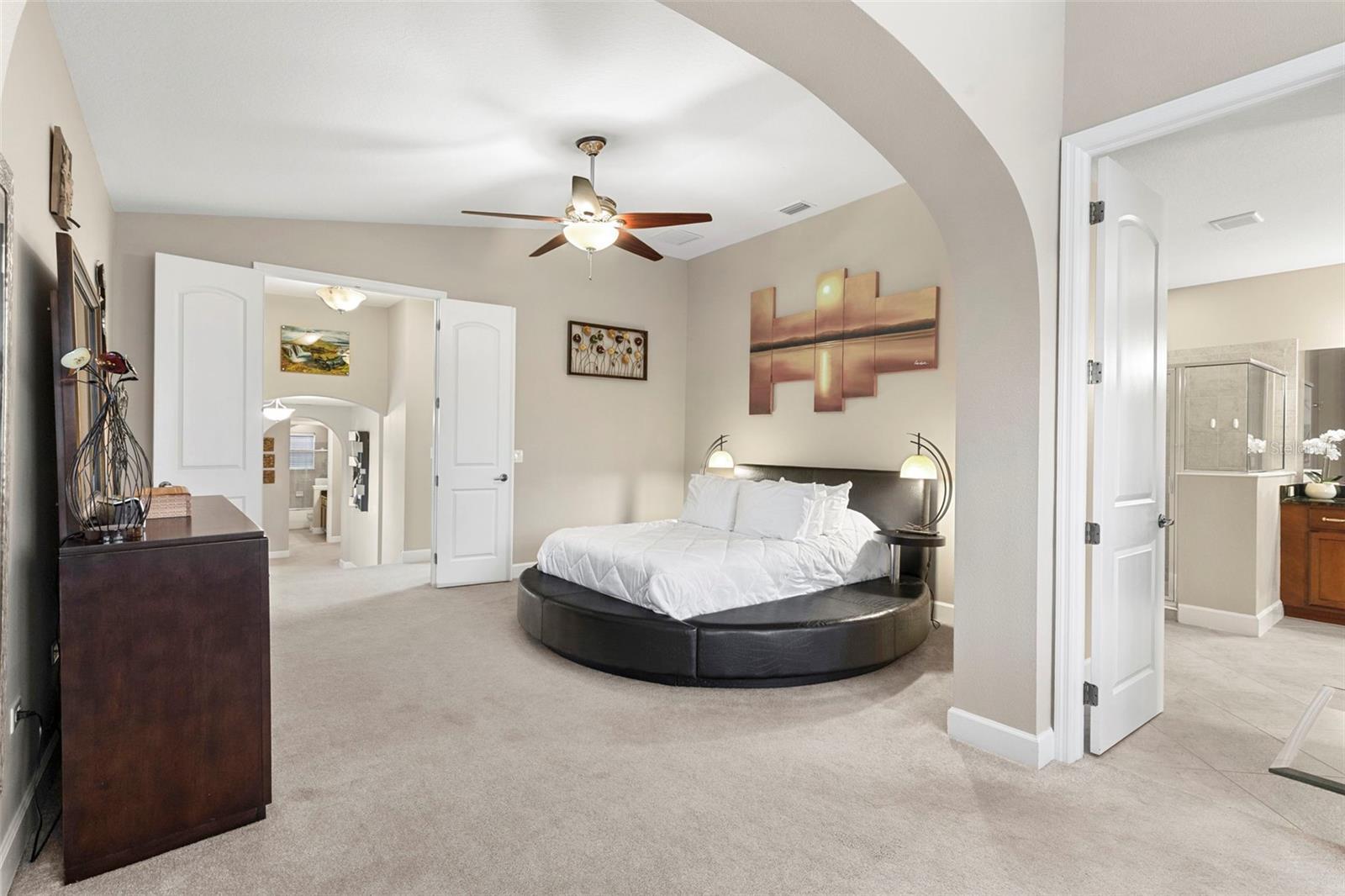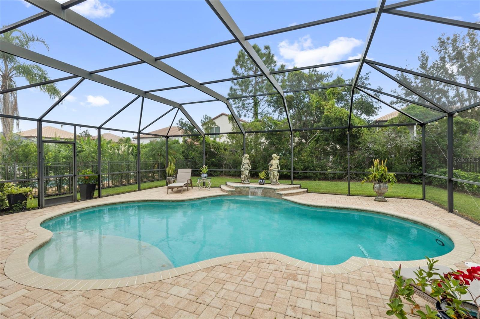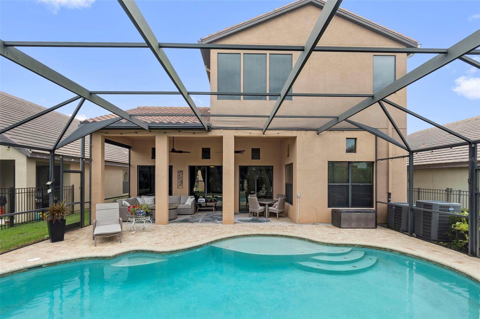This stunning Mercedes-built two-story residence in the sought-after community of Grand Hampton offers 4 bedrooms plus a bonus room, 3 full bathrooms, 1 half bathroom, and 3,251 square feet of living space, complete with a 2-car tandem garage. From the moment you arrive, the curb appeal captivates with its covered balcony, contemporary architectural design, and lush landscaping framing the walkway to the covered entryway and double wood doors. Step inside, where natural light cascades into the grand foyer. Just off the entry, you’ll find a generously sized under-the-stairs storage closet, a custom storage area with granite countertops and cabinetry, and a stylish half bath. Adjacent is a large bonus room, ideal for a home office, media room, or play space. Continuing through the home, the living room impresses with soaring 14-foot ceilings, recessed lighting, and triple glass sliding doors that frame views of your outdoor oasis. The open floor plan flows seamlessly into the chef’s kitchen, thoughtfully appointed with white solid wood cabinetry, granite countertops, a large cooking island with seating, stainless steel appliances, a gas range, modern lighting, and a spacious closet pantry. Just off the kitchen, the dining area enjoys serene views of the outdoor living space, completing the first floor. Ascending the wrought-iron baluster staircase, the second floor reveals a versatile loft area perfect for reading, writing, or relaxing. The first upstairs bedroom offers built-in closets and a private en-suite bathroom. Bedrooms two and three also feature built-in closets and share a well-appointed full bath. A conveniently located laundry room with cabinetry adds function and ease. The primary suite is a true retreat, highlighted by wall-to-wall windows that flood the space with natural light, soaring ceilings, and a cozy seating area. The spa-inspired primary bathroom includes recessed lighting, a garden tub, a walk-in glass shower, dual sink vanity with granite countertops, and modern fixtures, creating the perfect space to unwind. The outdoor living area is breathtaking. Step onto the screened, covered, paved lanai designed for year-round enjoyment, with privacy curtain and multiple seating areas overlooking the sparkling crystal-blue pool accented by a tranquil water feature. Whether hosting gatherings or enjoying quiet evenings, this private outdoor retreat is truly an extension of the home. Notable upgrades include Pool heater (2017), and recent kitchen appliance updates, with a new refrigerator and dishwasher installed in 2025 as well as a fan installed in the garage. The Grand Hampton community provides a wealth of amenities, including a 24-hour manned gate, state-of-the-art clubhouse, fitness center, playgrounds, lake access, and heated pools—including a lagoon-style pool with slide and a lap pool. Additional recreational features include tennis courts and basketball courts. Conveniently located near major highways I-75 and I-275, this property is just a short drive to local attractions such as Advent Hospital, PHSC, AdventHealth Center Ice, The Shops at Wiregrass, and Tampa Premium Outlets. Don’t miss the opportunity to own this exceptional home. Schedule your private showing today! For a virtual tour, click the provided link and experience the beauty of this remarkable property.