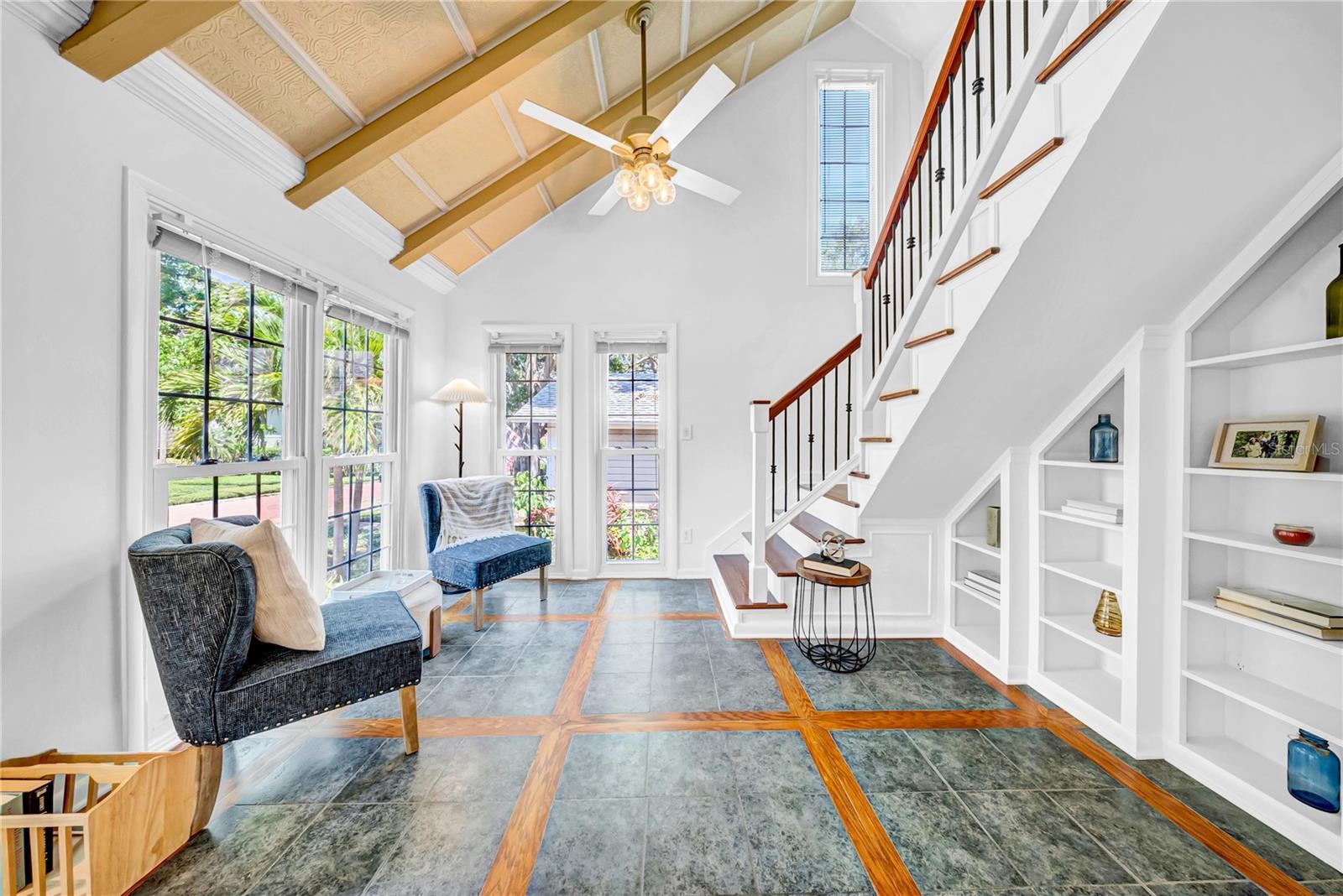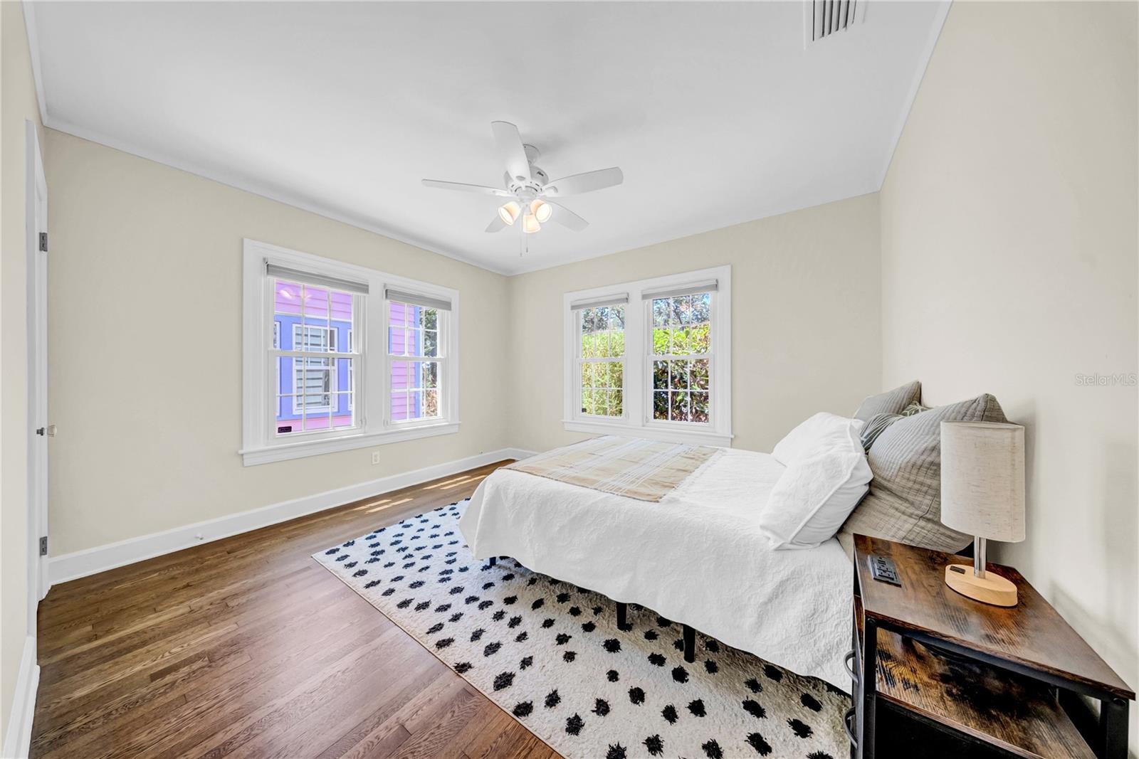 (Property meets requirements for an ADU, offering excellent income or multi-generational living potential.) Welcome to HISTORIC OLD NORTHEAST, LIVE in the most desired neighborhood in ST. PETERSBURG! This beautiful historic 3 Bedroom, 2 Bathroom, DETACHED 2 Car Garage home with alley access sits on the iconic brick paved roads! NO car NO problem, 4 Blocks from Coffee Pot Bayou, 2 blocks from 4Th Street with all of the shopping, restaurants, coffee shops and virtually anything else you could possibly need, and just over a mile from vibrant downtown St. Petersburg. As you enter the living room, a few of the many highlights are the handcrafted staircase, high beamed ceiling, custom built-in book shelves and an abundance of natural light beaming throughout. The refinished hardwood floors, crown molding, and wood burning fireplace make this area peaceful and inviting. The dining area is perfect for entertaining and flows seamlessly into the kitchen which has brand new quartz counter tops and stainless steel appliances, a professional gas range with convection oven and solid cherry cabinets. The indoor laundry area in the mud room at the rear entrance has a newer full size washer and dryer. The downstairs bathroom has recently been completely remodeled. The large upstairs loft has an en suite full bathroom, cherry hardwood floors, custom built-in storage throughout and a separate sitting area with a window overlooking the peaceful brick road that is perfect for enjoying a book or your morning coffee. The home has recently been professionally painted inside and out. Recently professionally landscaped in the front yard with a updated irrigation system, fenced yard. This unique home has been tastefully updated and strikes the perfect balance between modern convenience and historical charm and character. Don't miss out on your chance to live the FLORIDA DREAM in this beautiful home in one of the most sought-after neighborhoods in St. Petersburg. Schedule your tour today! (HURRICANE IMPACT WINDOWS AND DOORS THROUGHOUT THE ENTIRE HOME & GARAGE, ROOF 2014 HVAC 2020 GAS TANKLESS WATER HEATER 2017) 2 BEDROOMS DOWNSTAIRS & 1 BEDROOM UPSTAIRS