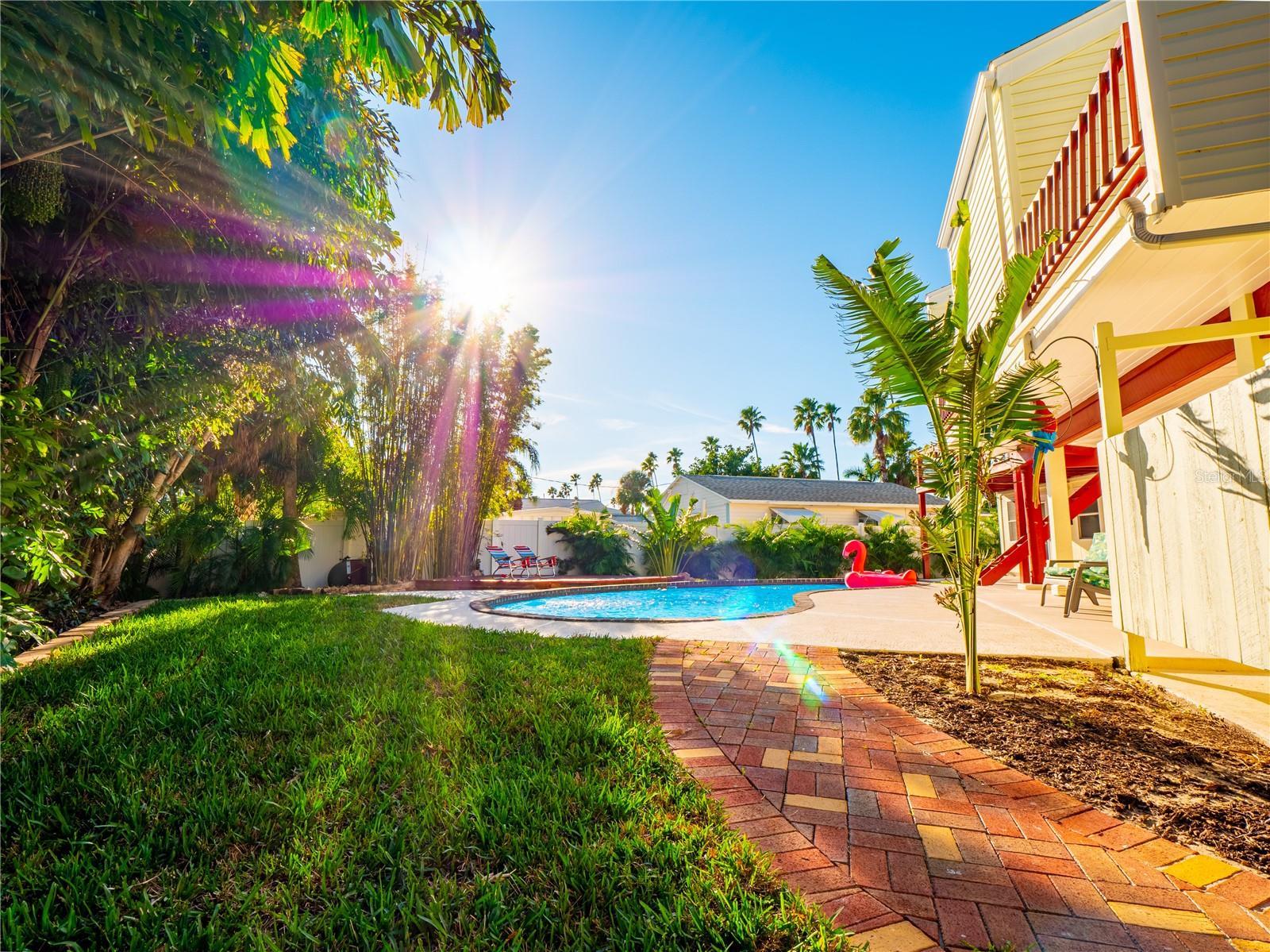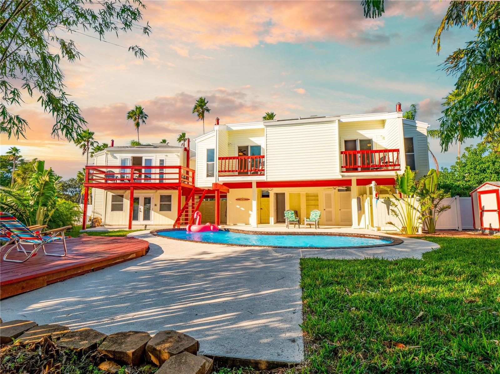 Welcome to the Pier House, a stunning executive home now for sale in the exclusive Don Cesar neighborhood of St. Pete Beach. This uniquely designed residence offers a perfect blend of luxury and tranquility, with its elevated position providing a treehouse-like ambiance. Inside, the open-concept living area is highlighted by vaulted ceilings and a central skylight, offering an abundance of natural light. The chef’s kitchen, complete with quartz countertops and high-end appliances, is a culinary enthusiast's dream. The home features three spacious en-suite bedrooms, each with a private bath and balcony, while the master suite boasts breathtaking views of the Pass-a-Grille Channel. Step outside to enjoy a private pool, expansive backyard with southern exposure, and a lush garden. The outdoor space is perfect for relaxation and entertainment, featuring a propane BBQ, half bathroom, and sunbathing deck. Located near exclusive beaches and the historic Pass-A-Grille neighborhood, this property also offers convenient access to downtown St. Petersburg, just 15 minutes away, where you'll find world-class dining and cultural attractions. Experience resort-like living in this remarkable St. Pete Beach home, where every day feels like a getaway.