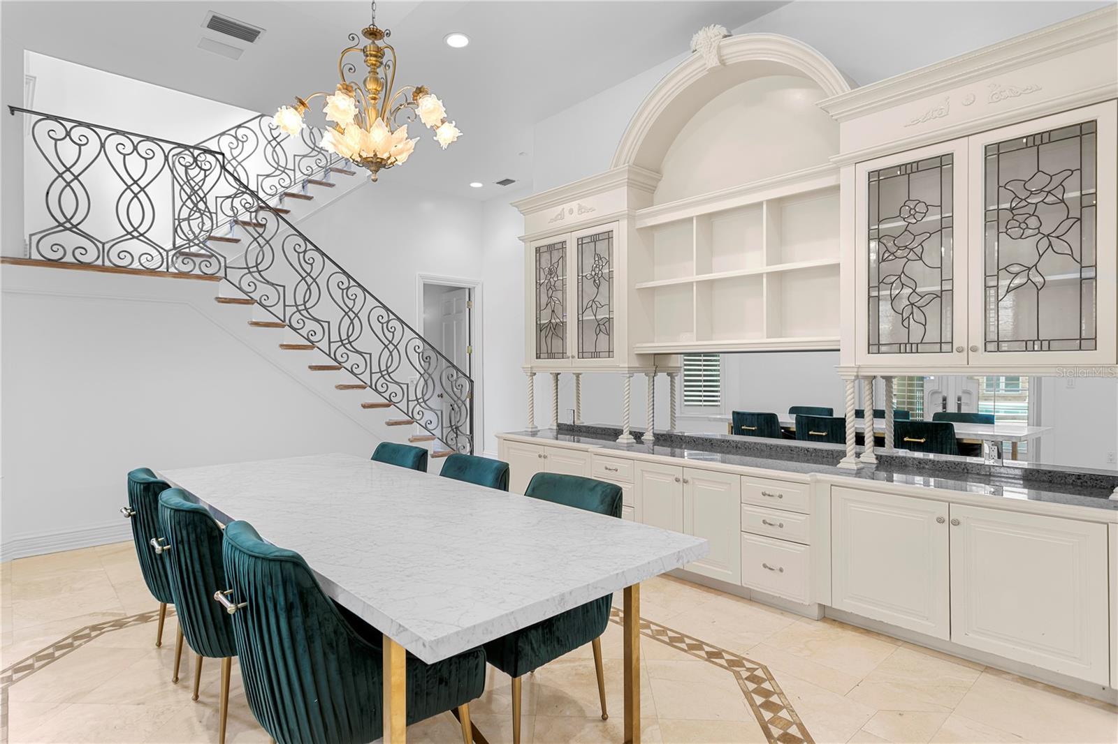 - Built-in Features, Cathedral Ceiling(s), Ceiling Fans(s), Crown Molding, Eat-in Kitchen, Elevator, High Ceilings, Kitchen/Family Room Combo, PrimaryBedroom Upstairs, Solid Wood Cabinets, Split Bedroom, Stone Counters, Tray Ceiling(s), Walk-In Closet(s), Wet Bar