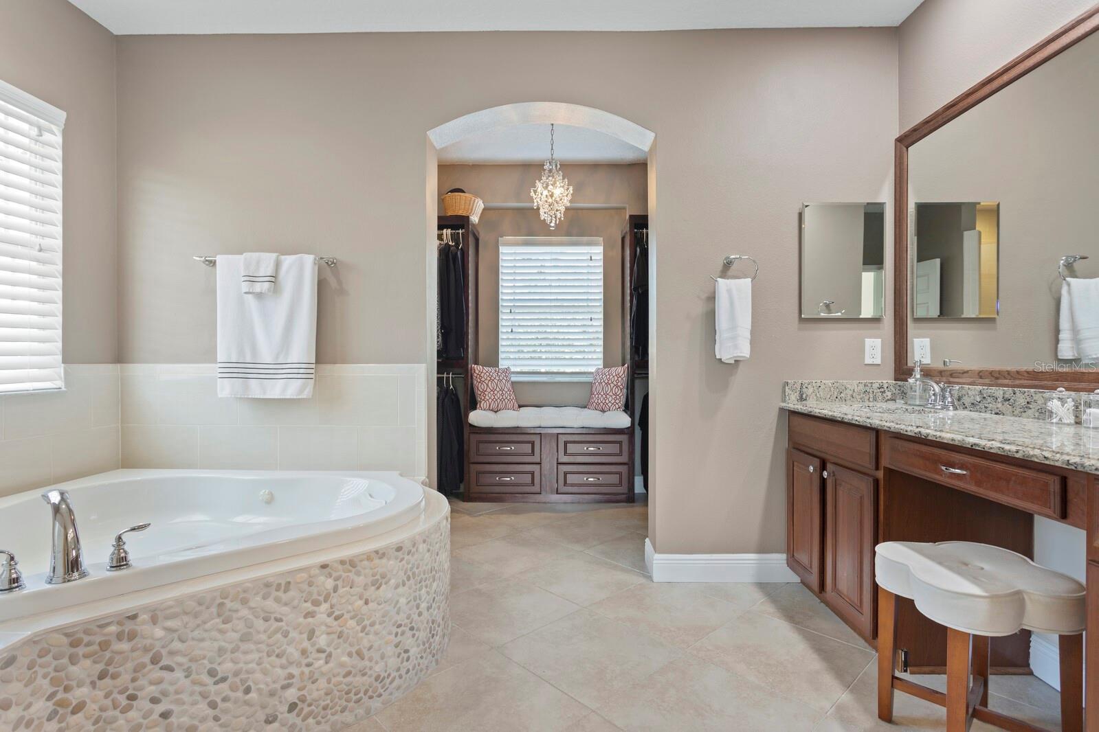 - Ceiling Fans(s), Eat-in Kitchen, High Ceilings, PrimaryBedroom Upstairs, Split Bedroom, Stone Counters, Thermostat, Vaulted Ceiling(s), Walk-In Closet(s), Window Treatments