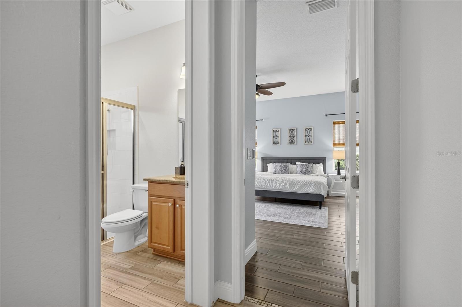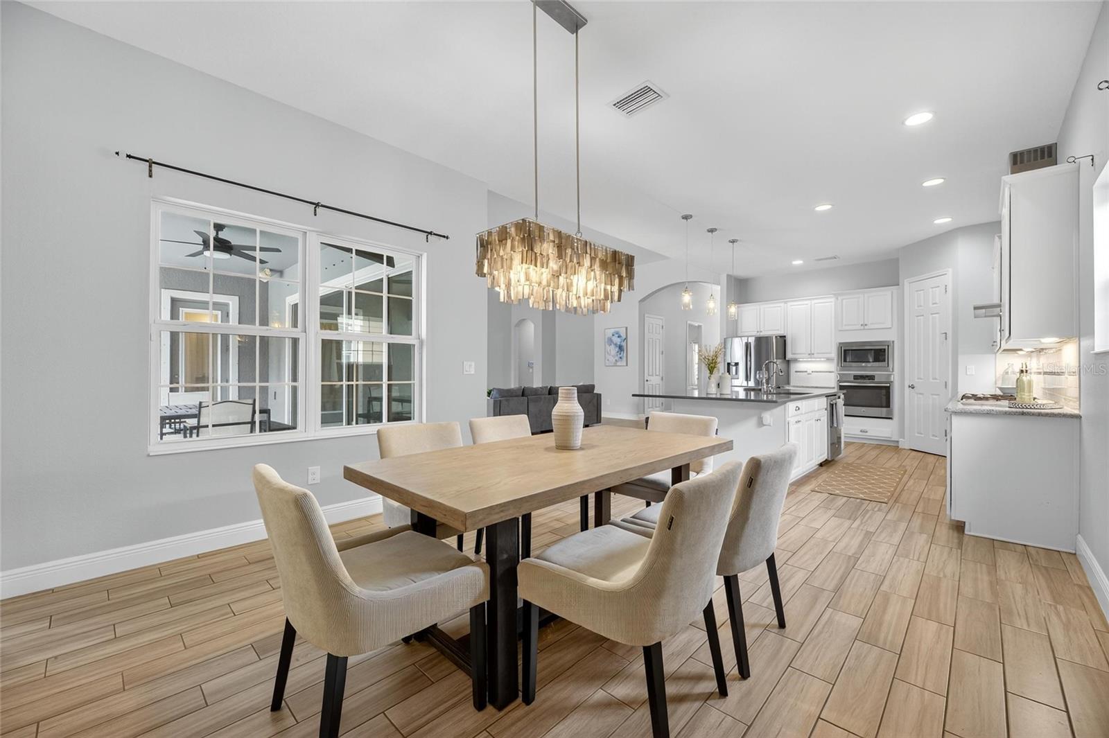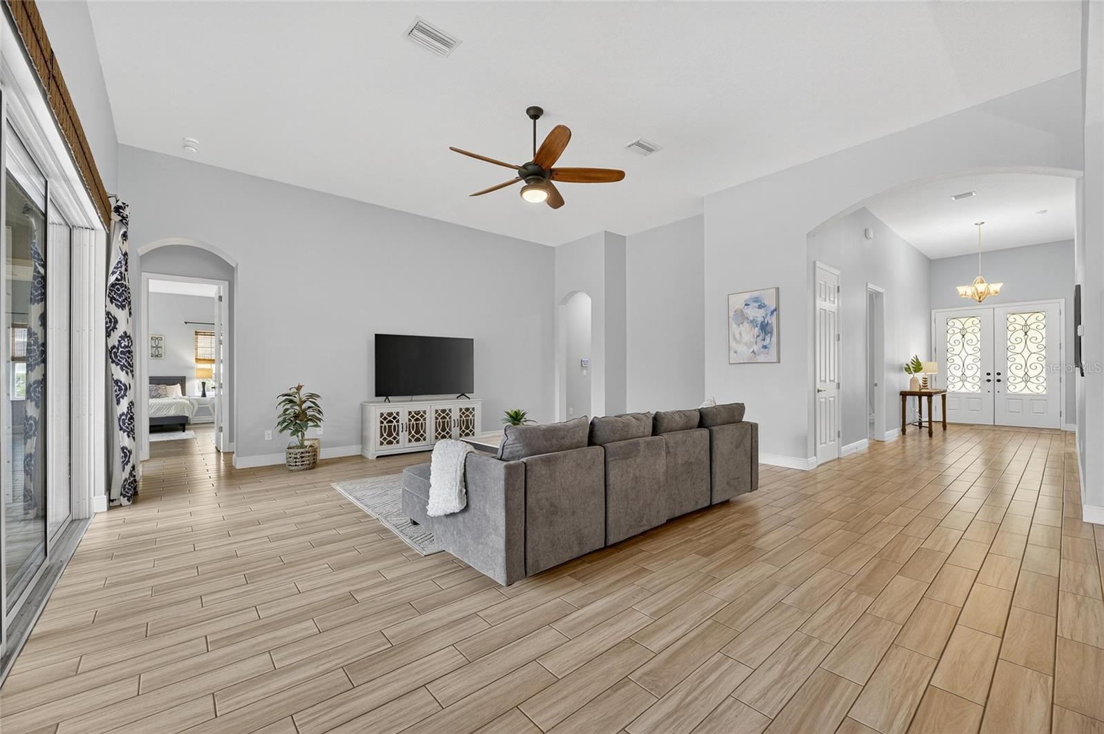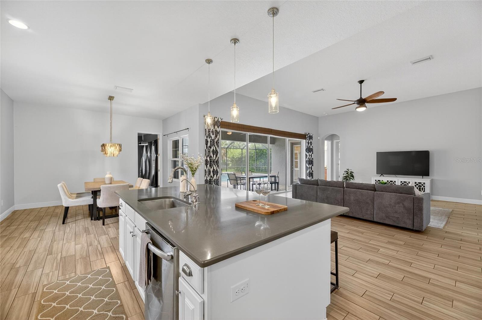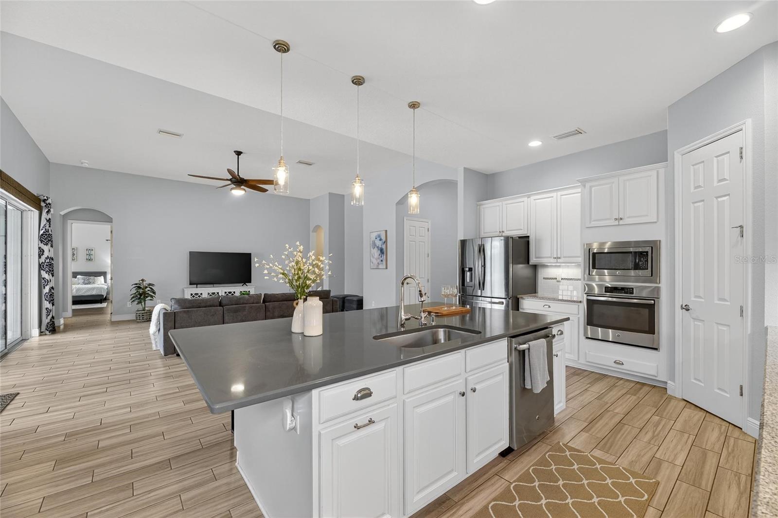- Ceiling Fans(s), Eat-in Kitchen, Kitchen/Family Room Combo, L Dining, Living Room/Dining Room Combo, Open Floorplan, Pest Guard System, Primary Bedroom Main Floor, Solid Surface Counters, Solid Wood Cabinets, Split Bedroom, Stone Counters, Thermostat, Tray Ceiling(s), Vaulted Ceiling(s), Walk-In Closet(s), Window Treatments