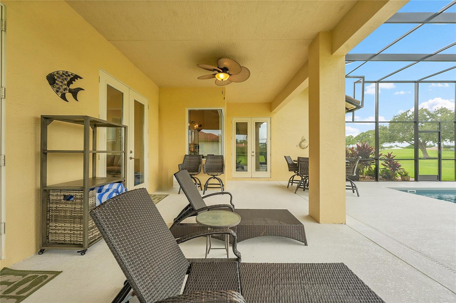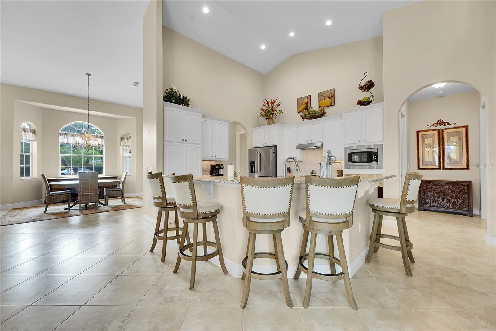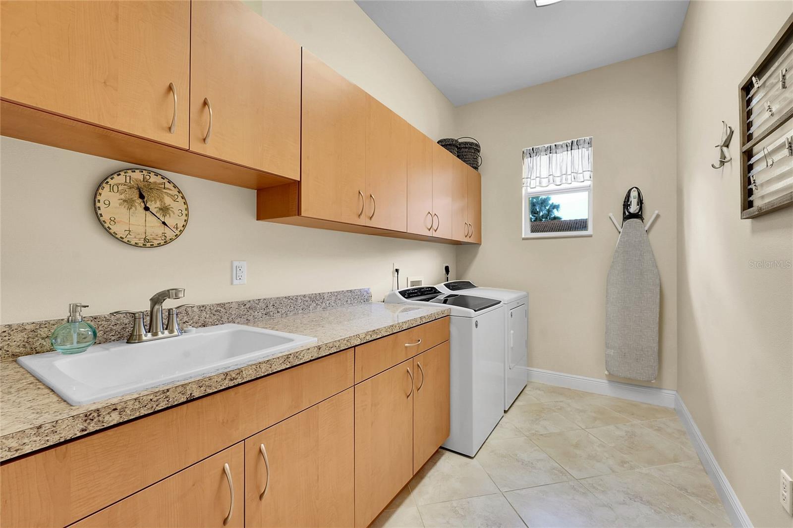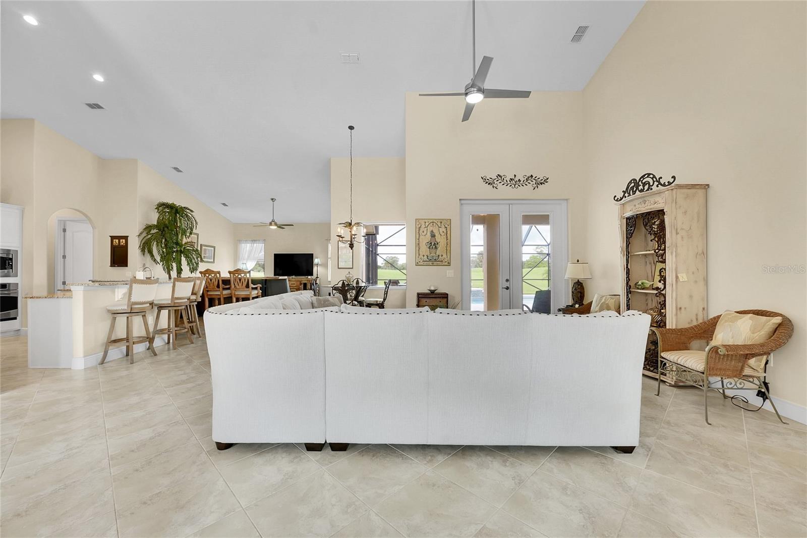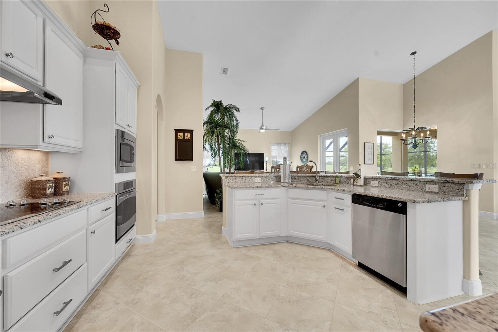 Under contract-accepting backup offers. Sellers are Motivated! Stunning solid block construction home features a split floor plan with three bedrooms, two and a half bathrooms, and a massive three-plus car oversized garage complete with built-in workshop. From the moment you step inside, you'll be captivated by the openness and the bright, cheerful atmosphere created by abundant natural light and expansive windows. Cooking in your spacious island kitchen is a delight, featuring generous granite countertops and stylish cabinets with elegant crown molding, perfect for entertaining. Two spacious living areas provide plenty of room to relax, along with a dining area and a cozy dining nook that overlook the pool for your enjoyment! Slip into your primary bedroom, where you can unwind in the soaking tub, enjoy two spacious walk-in closets, and admire the dual vanities with marble tops and a chandelier that adds a touch of luxury. The home features tile flooring throughout, with cozy carpet in the guest bedrooms. The guest bathroom conveniently connects to the third bedroom and features a door leading to the pool area. Guest bath includes a walk-in shower and a vanity with a marble countertop. Additional perks include impact-resistant windows throughout. This stunning property comes fully furnished and is located on the 1st fairway, offering incredible views of the golf course, pond, and pool just steps from your door. Call today for your own private showing!