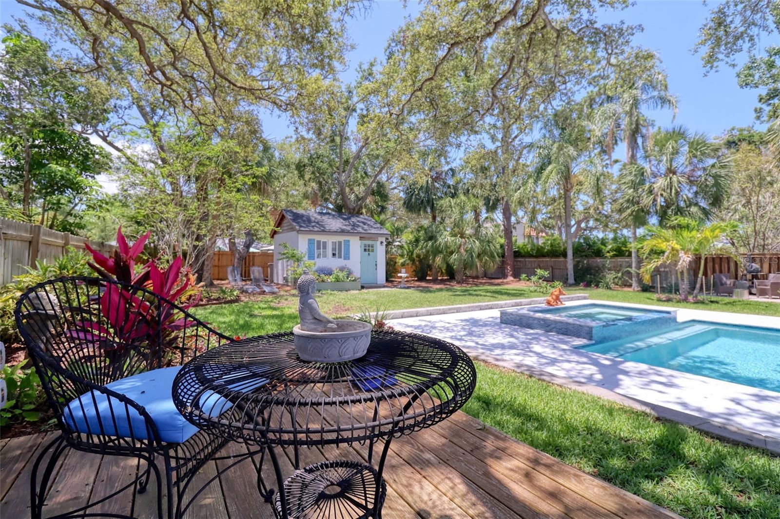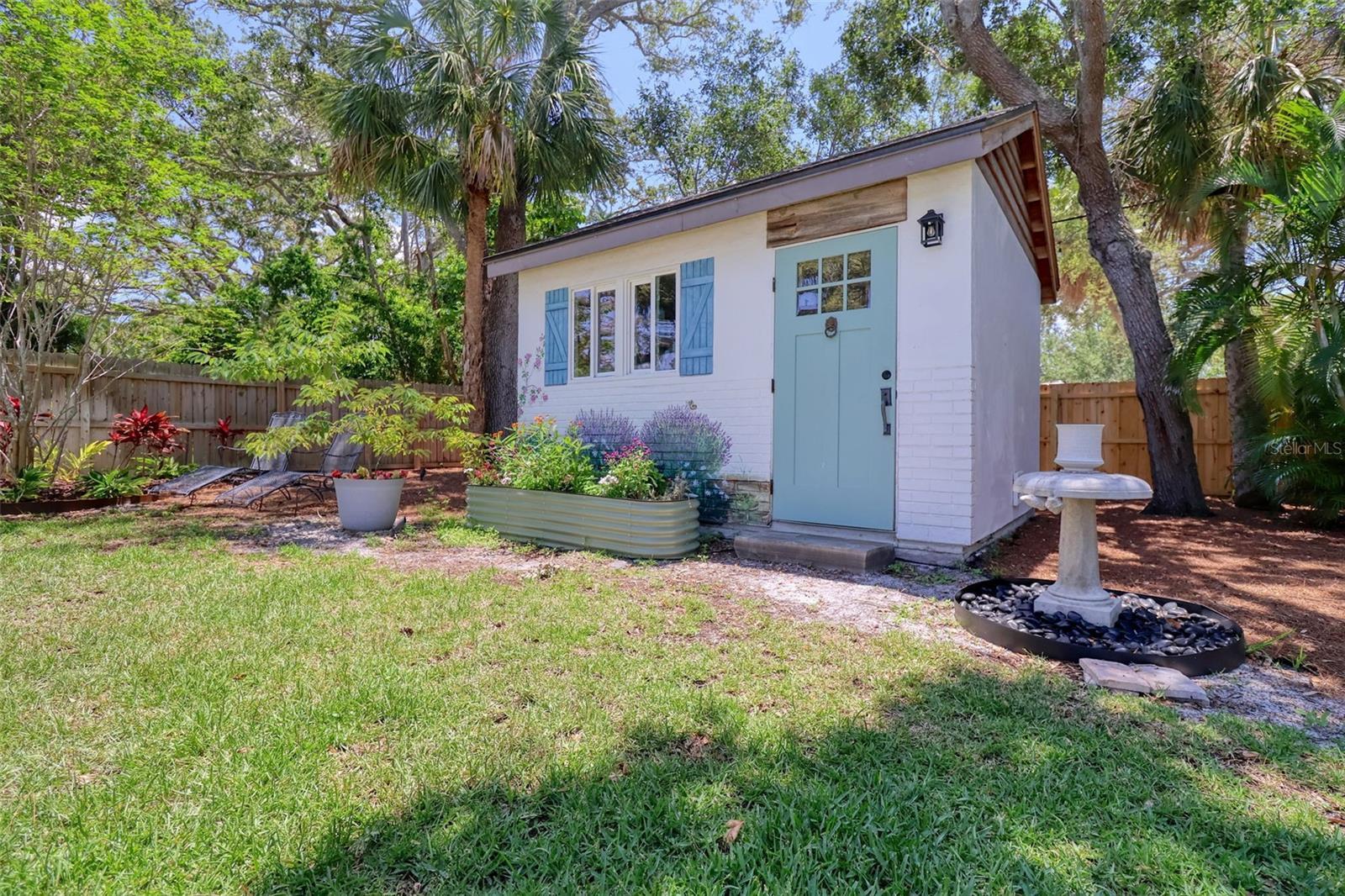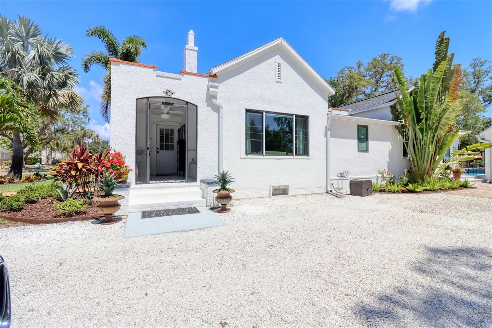 Elegant and sophisticated aptly describes this pristine 1927 Historic Landmark pool home with a Carriage House situated on over a 1/4 acre lot in the highly sought after Downtown Dunedin golf cart friendly Fenway-on-the-Bay neighborhood. This stylish home is for the discerning buyer with every attention to detail being addressed. Built in the same era, and within walking distance of the iconic Fenway Hotel, this home has been meticulously renovated with high-end modern luxuries while retaining its era charm. This delightful home is light and bright. The main home boasts a welcoming living room with gas fireplace, dining room, family room, and a large renovated kitchen with striking granite countertops, a huge kitchen island, farm sink, wood shaker cabinetry, high-end commercial Wolf & Subzero stainless-steel appliances, and a 100+ bottle wine cooler. Off of the kitchen is a charming Butler's pantry with copper sink, vintage window, built-in shelving and more spacious cabinetry. Open to the kitchen enjoy the family room, featuring its original refinished oak floor and unique raised ceilings and unparalleled view of the pool and backyard. The primary bedroom is spacious and bright and offers a built-in closet plus modern extra tall cabinet storage space. The second bedroom is currently being used as an office and it too offers a built-in closet. The pristine primary bathroom has a frameless glass shower surround, vintage-look vanity, lighted mirror, modern tiled floor, and a Vela Plus Self-Cleaning Smart Toilet/Bidet. Off of the dining room is an intimate bespoke cocktail lounge with lighted built ins, mirrored shelving and deep storage cabinets, which could be transformed into an office. The home boasts wide wood plank and distinctive tile flooring, a neutral color palette, unique lighting fixtures, ample storage, all culminating into a truly historic feel with modern, luxurious updates. The fenced backyard is lush, private and offers a view of St Joseph's Sound and a tranquil 15x30 natural gas heated pool and spill over 8-person spa. There is a cabana with electricity and windows, currently used as a work shed. This backyard oasis is awesome and has been the scene of many events and festivities. The meticulous detail and size of this backyard oasis can only be appreciated in person. The light and bright Carriage House is separate from the main home and shares similar high-end finishes, with its tall ceilings, large tiled bathroom, a kitchenette, and spacious, sunny living area and bedroom offering a beachy vibe with ceiling fans, a 2 head mini-split a/c, painted wood flooring, and shiplap wall accents. This stunningly beautiful home is move-in ready and offers many notable efficient & structural features including LOW-E impact windows, whole house Generac generator, encapsulated crawl space, and a UV air purification system. With a home of this vintage, it is refreshing to see the renovations have been permitted through the City of Dunedin. Watch the attached VIDEO to fully appreciate this home. The location is also first class; walk or jump in your golf cart to nearby shops and restaurants; the Pinellas Trail intersects the street and is just a stroll away. Watch the sunset from your own exquisite backyard, or head downtown for dinner or to the many festivals and events. Couple this with excellent schools, pristine beaches and all that fabulous Dunedin has to offer, and you have the ultimate elegant Florida lifestyle home!