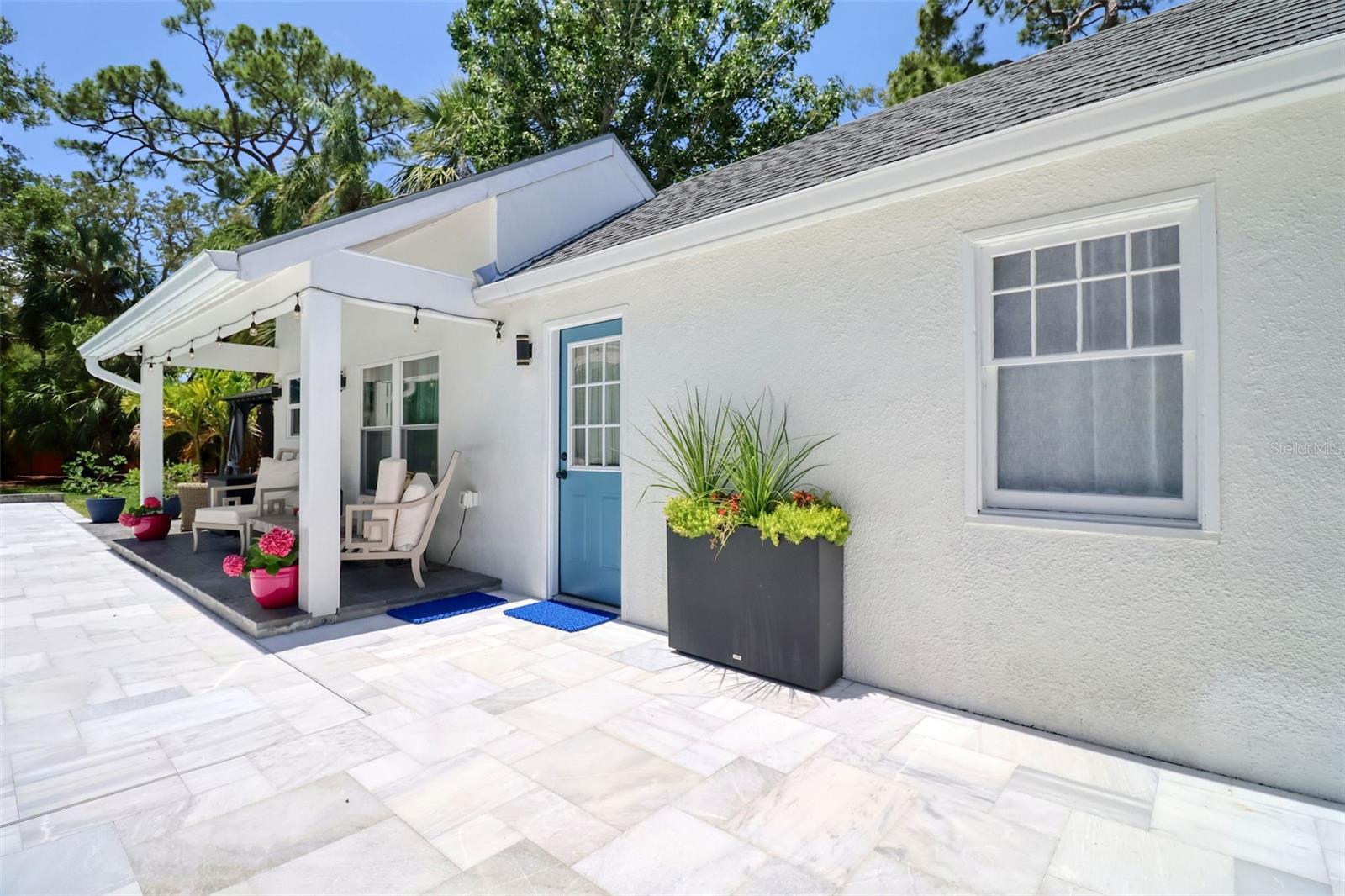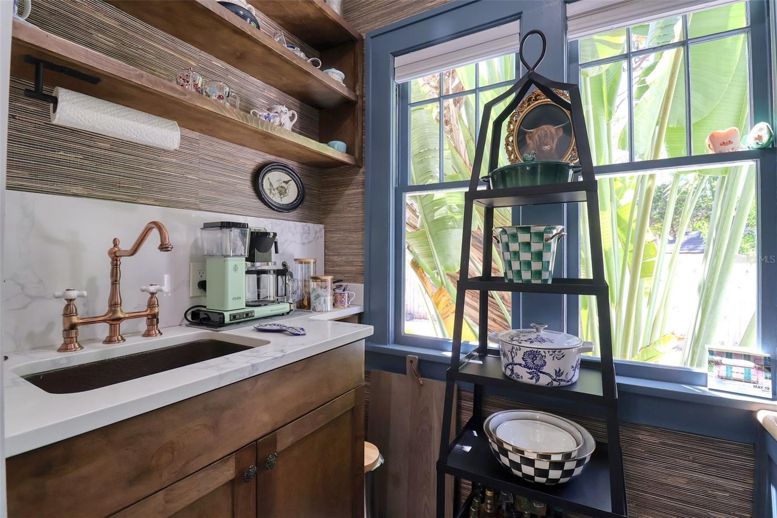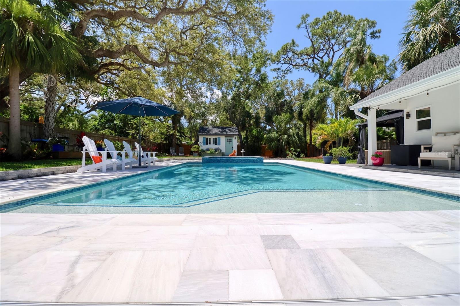 Elegant and sophisticated aptly describes this pristine 1927 Historic Landmark pool home with a Carriage House situated on over a 1/4 acre lot in the highly sought after Downtown Dunedin golf cart friendly Fenway-on-the-Bay neighborhood. This stylish home is for the discerning buyer with every attention to detail being addressed. Built in the same era, and within walking distance of the iconic Fenway Hotel, this home has been meticulously renovated with high-end modern luxuries while retaining its era charm. This delightful home is light and bright. The main home boasts a welcoming living room with gas fireplace, dining room, family room, and a large renovated kitchen with striking granite countertops, a huge kitchen island, farm sink, wood shaker cabinetry, high-end commercial Wolf & Subzero stainless-steel appliances, and a 100+ bottle wine cooler. Off of the kitchen is a charming Butler's pantry with copper sink, vintage window, built-in shelving and more spacious cabinetry. Open to the kitchen enjoy the family room, featuring its original refinished oak floor and unique raised ceilings and unparalleled view of the pool and backyard. The primary bedroom is spacious and bright and offers a built-in closet plus modern extra tall cabinet storage space. The second bedroom is currently being used as an office and it too offers a built-in closet. The pristine primary bathroom has a frameless glass shower surround, vintage-look vanity, lighted mirror, modern tiled floor, and a Vela Plus Self-Cleaning Smart Toilet/Bidet. Off of the dining room is an intimate bespoke cocktail lounge with lighted built ins, mirrored shelving and deep storage cabinets, which could be transformed into an office. The home boasts wide wood plank and distinctive tile flooring, a neutral color palette, unique lighting fixtures, ample storage, all culminating into a truly historic feel with modern, luxurious updates. The fenced backyard is lush, private and offers a view of St Joseph's Sound and a tranquil 15x30 natural gas heated pool and spill over 8-person spa. There is a cabana with electricity and windows, currently used as a work shed. This backyard oasis is awesome and has been the scene of many events and festivities. The meticulous detail and size of this backyard oasis can only be appreciated in person. The light and bright Carriage House is separate from the main home and shares similar high-end finishes, with its tall ceilings, large tiled bathroom, a kitchenette, and spacious, sunny living area and bedroom offering a beachy vibe with ceiling fans, a 2 head mini-split a/c, painted wood flooring, and shiplap wall accents. This stunningly beautiful home is move-in ready and offers many notable efficient & structural features including LOW-E impact windows, whole house Generac generator, encapsulated crawl space, and a UV air purification system. With a home of this vintage, it is refreshing to see the renovations have been permitted through the City of Dunedin. Watch the attached VIDEO to fully appreciate this home. The location is also first class; walk or jump in your golf cart to nearby shops and restaurants; the Pinellas Trail intersects the street and is just a stroll away. Watch the sunset from your own exquisite backyard, or head downtown for dinner or to the many festivals and events. Couple this with excellent schools, pristine beaches and all that fabulous Dunedin has to offer, and you have the ultimate elegant Florida lifestyle home!