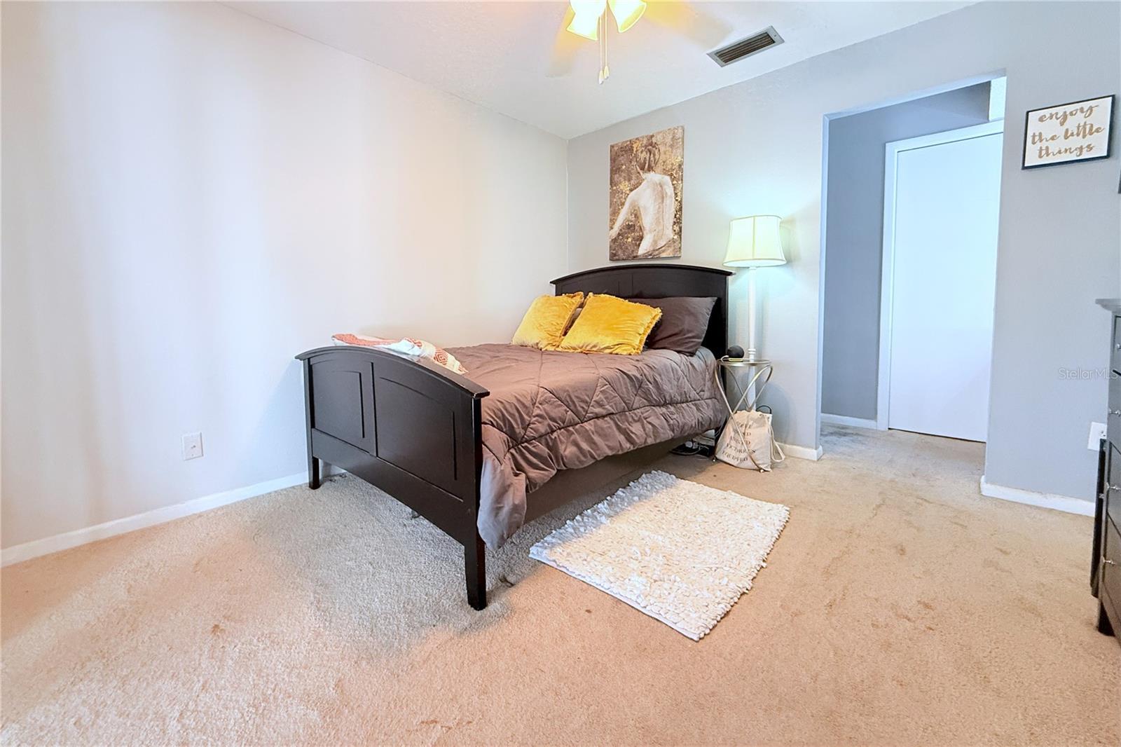 - Ceiling Fans(s), Living Room/Dining Room Combo, Primary Bedroom Main Floor, Solid Wood Cabinets, Stone Counters, Thermostat, Walk-In Closet(s)