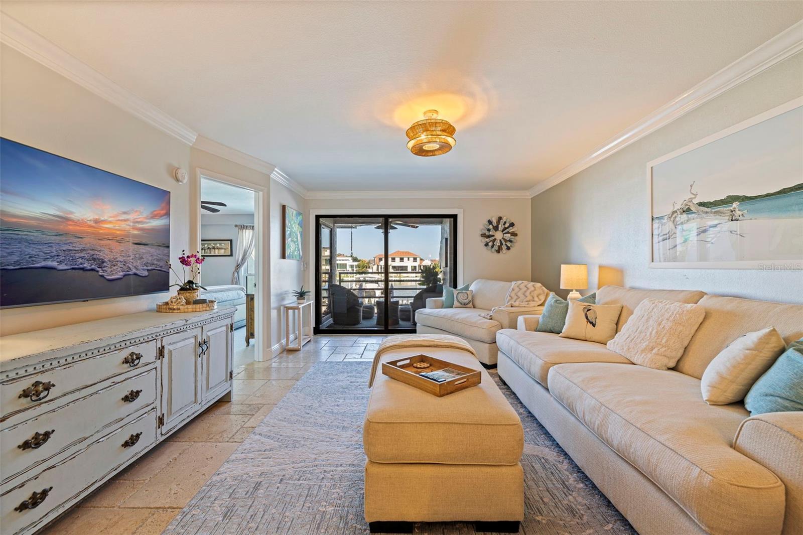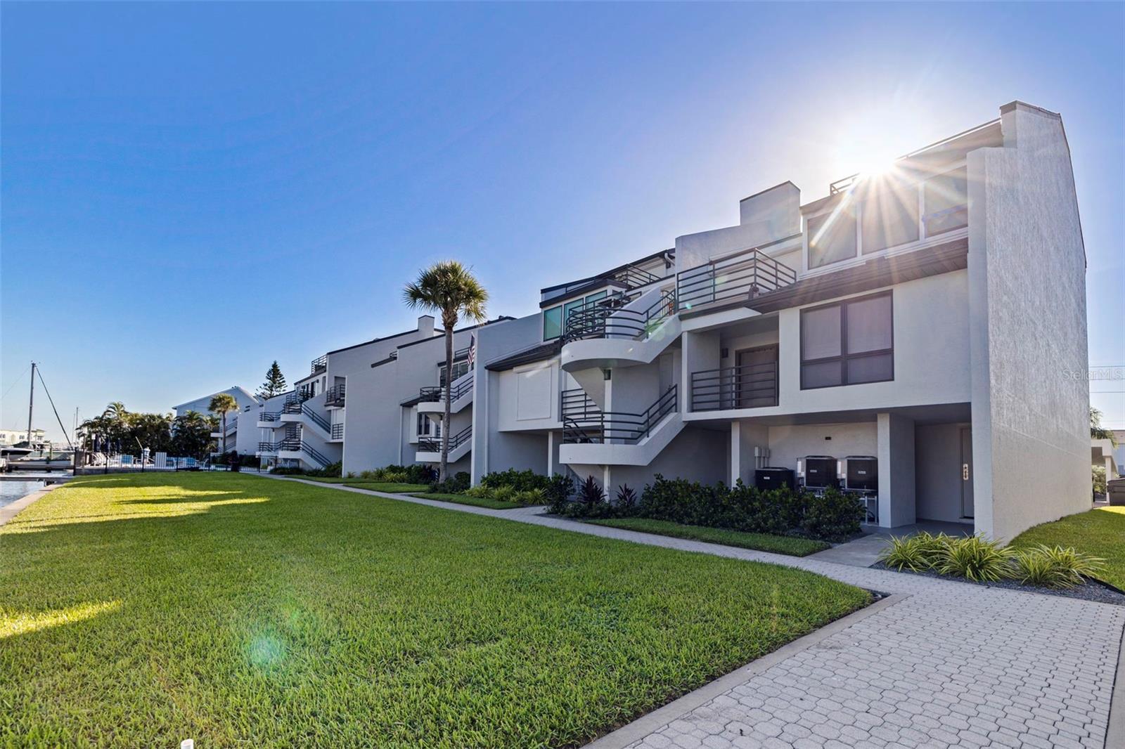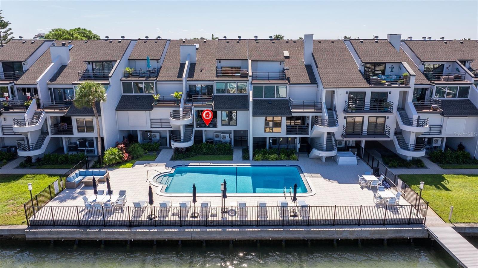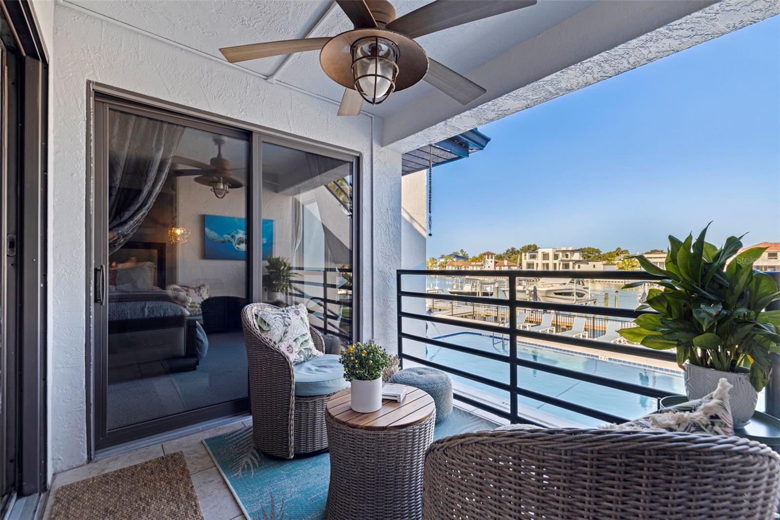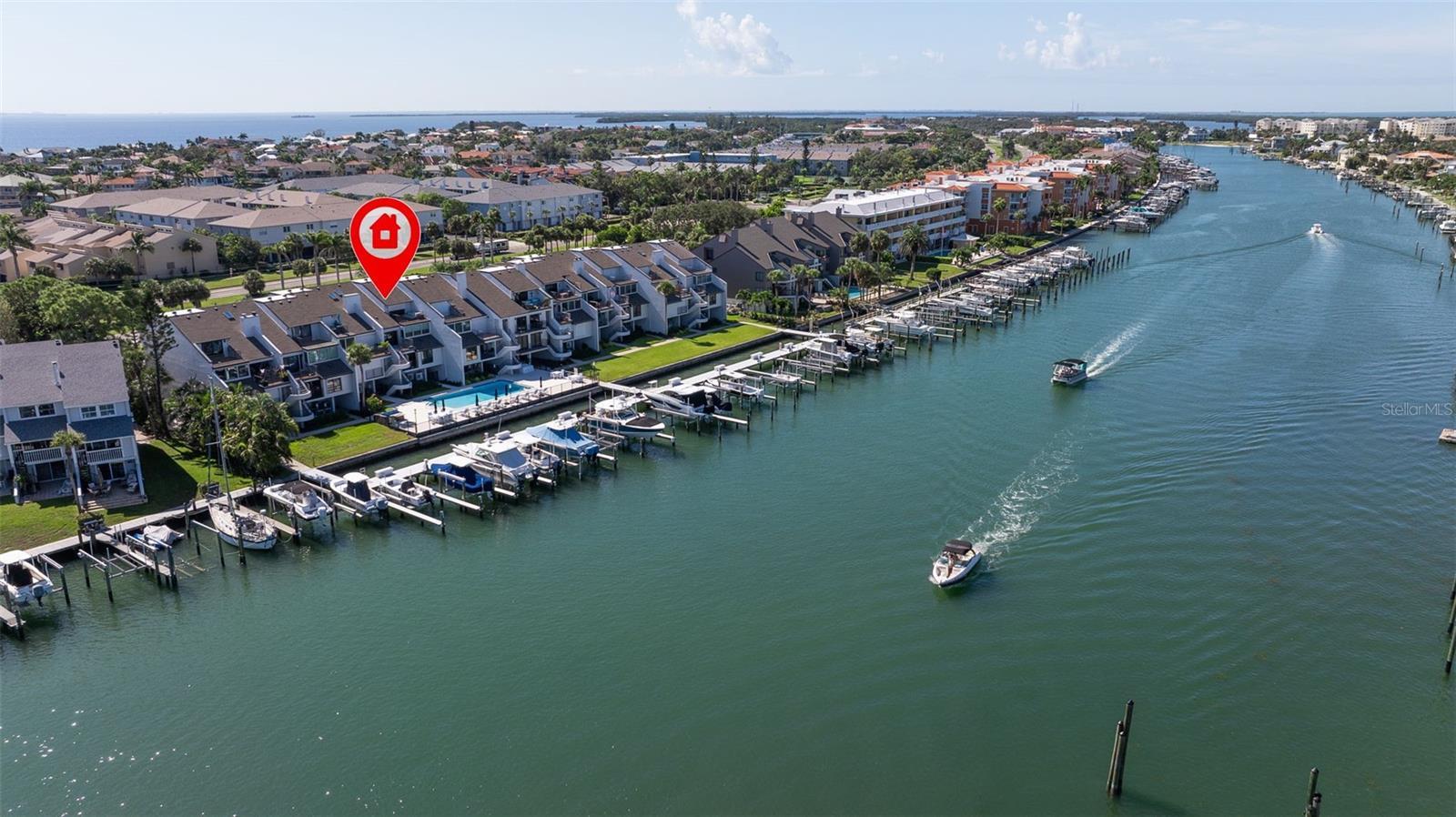 Coming home every evening to magical sunsets over Tierra Verde’s Grand Canal — this is the waterfront lifestyle you’ve been dreaming about. Spacious, open, and thoughtfully designed, this 2-bedroom, 2-bath condo offers effortless coastal living in a vibrant, welcoming community. The friendly entry with inviting porch greets you even before you step inside, showcasing the warmth of island life. As you enter, the elegant coastal-inspired kitchen on your right features soft blue cabinetry, quartz counters, and a breakfast bar with seating for casual dining. On the left, the dining area includes a custom built-in wood bar and beverage fridge — perfect for serving to the dining table next to and entertaining guests. The tiled living area flows naturally with space for your sofa and TV while overlooking the balcony and sparkling Grand Canal, with a private back door entry staircase down to the heated pool for added convenience. The primary suite is a true resort-style retreat with sweeping water views, custom lighting, an oversized walk-in closet, two separate vanities, and a fabulous spa-like walk-in shower. The guest bedroom, enjoys ample daylight, a spacious walk-in closet, and an updated bath. Full-size side-by-side washer and dryer plus additional large storage room downstairs with new water softener to complete the unit. Easy to maintain and lock-and-leave, it’s perfect for full-time living or as a second home. 2 assigned parking spots plus available guest parking spots in this waterfront, pet friendly, freshly painted and landscaped community. Featured amenities include a recently updated pool and fitness center. Enjoy waking or biking: designated bike and walk trail along Pinellas Bayway or downtown Tierra Verde, which offers several island restaurants. Scenic walk or ride across the bridge brings you to Isla del Sol Golf and Country Club. with close proximity to Fort De Soto Park and best local beaches, only 10 mins to Downtown St. Pete, and 40 mins to Tampa International Airport. Complete your lifestyle package with the deeded boat slip and 13,000 lb lift. Furniture is optional, and the boat can be included— simply make an offer.