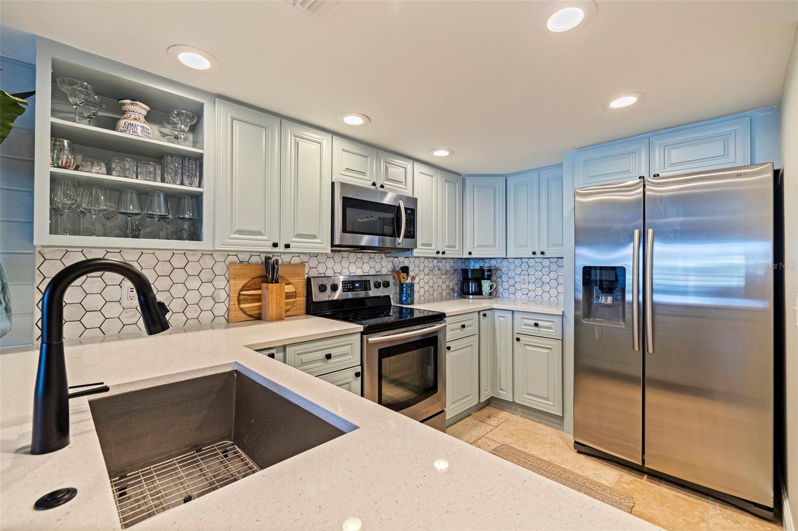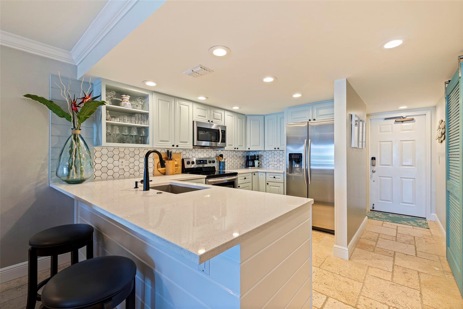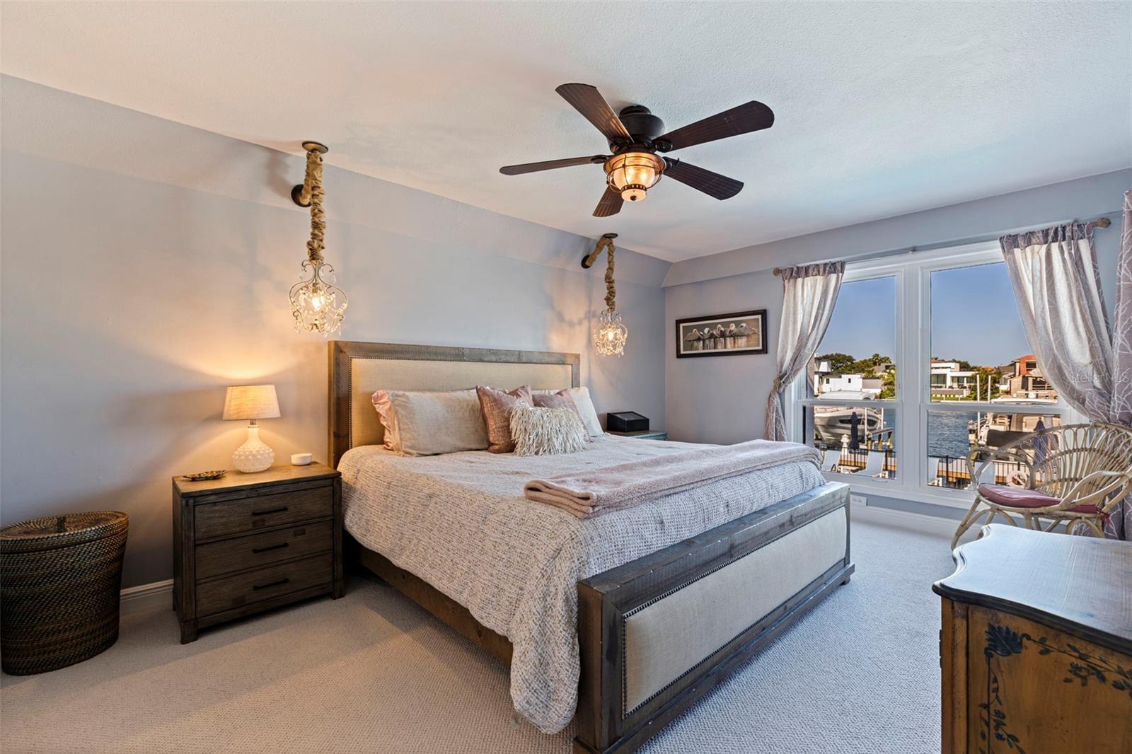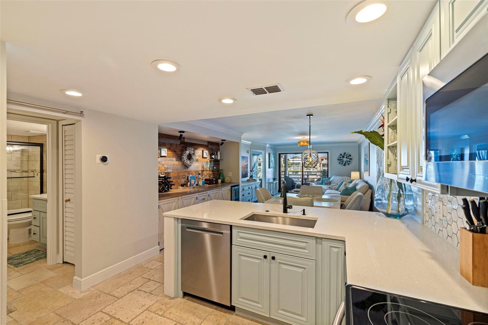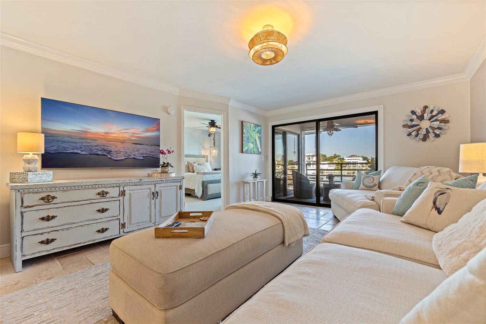 Coming home every evening to magical sunsets over Tierra Verde’s Grand Canal — this is the waterfront lifestyle you’ve been dreaming about. Spacious, open, and thoughtfully designed, this 2-bedroom, 2-bath condo offers effortless coastal living in a vibrant, welcoming community. The friendly entry with inviting porch greets you even before you step inside, showcasing the warmth of island life. As you enter, the elegant coastal-inspired kitchen on your right features soft blue cabinetry, quartz counters, and a breakfast bar with seating for casual dining. On the left, the dining area includes a custom built-in wood bar and beverage fridge — perfect for serving to the dining table next to and entertaining guests. The tiled living area flows naturally with space for your sofa and TV while overlooking the balcony and sparkling Grand Canal, with a private back door entry staircase down to the heated pool for added convenience. The primary suite is a true resort-style retreat with sweeping water views, custom lighting, an oversized walk-in closet, two separate vanities, and a fabulous spa-like walk-in shower. The guest bedroom, enjoys ample daylight, a spacious walk-in closet, and an updated bath. Full-size side-by-side washer and dryer plus additional large storage room downstairs with new water softener to complete the unit. Easy to maintain and lock-and-leave, it’s perfect for full-time living or as a second home. 2 assigned parking spots plus available guest parking spots in this waterfront, pet friendly, freshly painted and landscaped community. Featured amenities include a recently updated pool and fitness center. Enjoy waking or biking: designated bike and walk trail along Pinellas Bayway or downtown Tierra Verde, which offers several island restaurants. Scenic walk or ride across the bridge brings you to Isla del Sol Golf and Country Club. with close proximity to Fort De Soto Park and best local beaches, only 10 mins to Downtown St. Pete, and 40 mins to Tampa International Airport. Complete your lifestyle package with the deeded boat slip and 13,000 lb lift. Furniture is optional, and the boat can be included— simply make an offer.