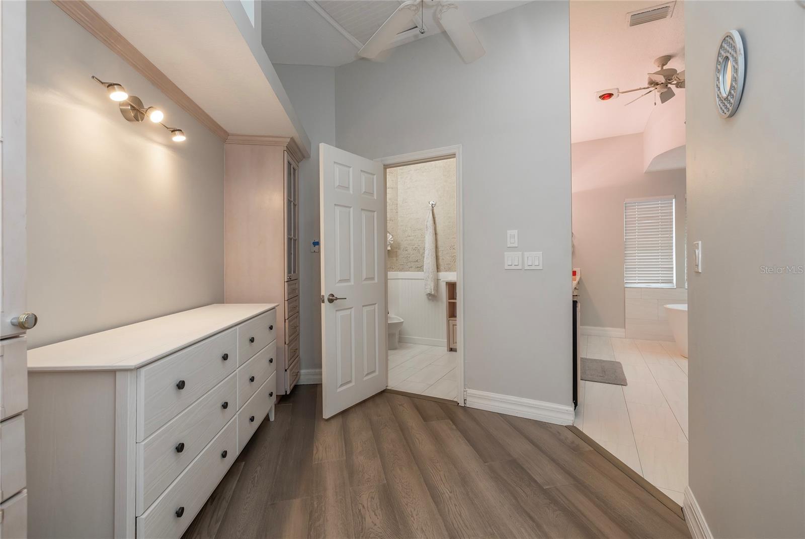 - Built-in Features, Ceiling Fans(s), Eat-in Kitchen, Elevator, High Ceilings, Living Room/Dining Room Combo, Open Floorplan, Primary Bedroom Main Floor, PrimaryBedroom Upstairs, Solid Wood Cabinets, Split Bedroom, Stone Counters, Tray Ceiling(s), Walk-In Closet(s), Window Treatments