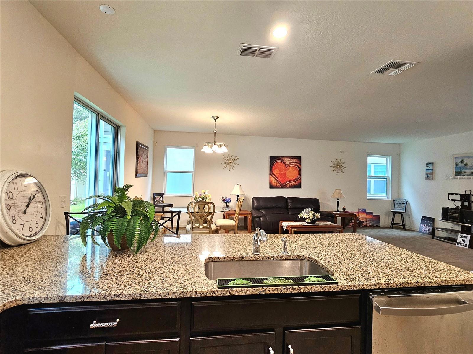 - Ceiling Fans(s), Eat-in Kitchen, High Ceilings, Kitchen/Family Room Combo, Living Room/Dining Room Combo, Open Floorplan, PrimaryBedroom Upstairs, Split Bedroom, Stone Counters, Walk-In Closet(s), Window Treatments