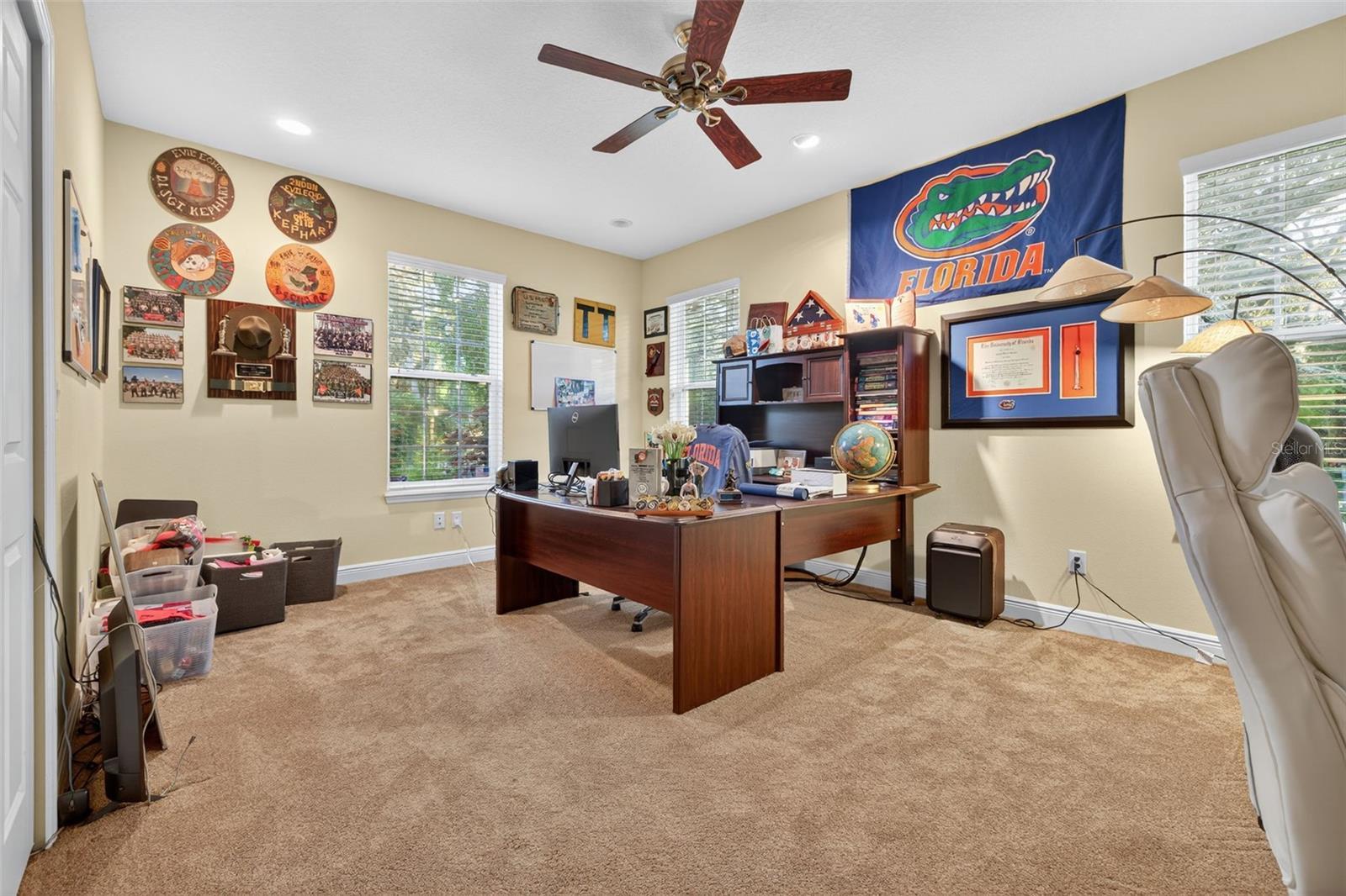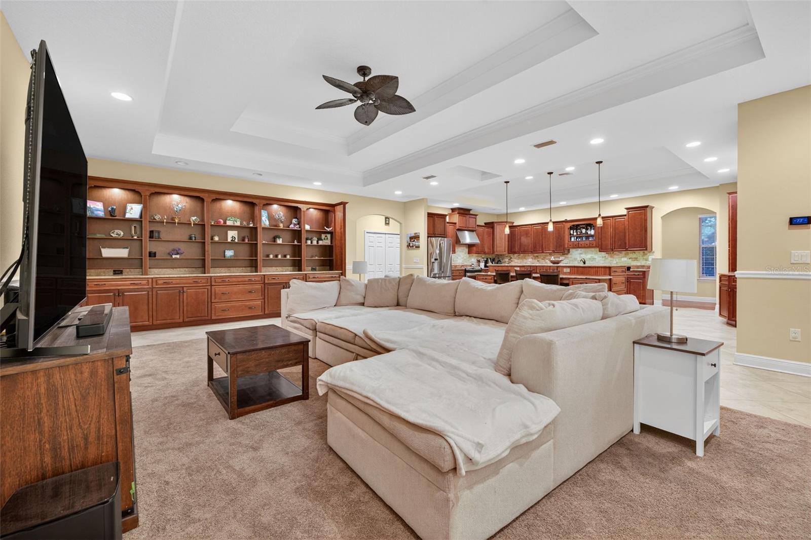 Welcome to one of the most rare finds in the peaceful Forest Oaks subdivision. Custom-built in 2014, this home sits on a half-acre corner lot framed by 16 beautiful oak trees. With over 3,200 square feet of living space, plus 4 bedrooms, 2 bathrooms, an office/den, and a 315 sq. ft. flex space above the garage that could easily be a 5th bedroom, media room, or gym, you’ll quickly see how unique this opportunity really is and the never ending opportunities this property provides. The kitchen is designed to function with ease and entertain a large crowd with an oversized granite island, custom 42” cabinets with roll-outs, premium granite counters, stone inlay backsplash, and stainless steel appliances (including a newer dishwasher). Open to the spacious living room which is just as inviting, featuring custom Armstrong built-ins, tray ceilings, recessed lighting, and a skylight that brings in natural light. The primary suite features French doors out to the lanai, a coffered ceiling, and a spa-like bathroom complete with a soaking tub, dual-head walk-in shower, and custom cabinetry. Three additional bedrooms, a formal dining room, and an updated guest bath mean there’s plenty of room for everyone. Even the laundry room is thoughtfully designed with plenty of space and elevated with granite counters, cabinets, and a utility sink. The outdoor spaces are what make this property truly special. A 20x16 screened lanai, a 16x12 Trex deck with retractable awning, a shed for additional storage and over 3,000 sq. ft. of pavers give you endless options for entertaining. Add in a 20x18 workshop, climate-controlled storage upstairs, and a 15x50 parking area with full RV/boat hookups, and you’ll see why homes like this rarely come available. The oversized garage with an 8-ft tall door fits large SUVs with ease, and the Tesla fast charger is already in place. Recent updates include a new electronic gate motor, dishwasher, washer/dryer, kitchen sink heater, HVAC improvements, and a Ring doorbell. With three high-efficiency AC units, double-pane windows, 10 designer fans, security cameras, and a full alarm system, all with no HOA or CDD, this home is the perfect blend of comfort, function, and peace of mind. Now let's talk LOCATION! This one is hard to beat, just minutes to I-275 and Babe Zaharis Golf Course, close to USF, VA and Advent Health Hospitals, Ybor City, Downtown Tampa, Raymond James Stadium, and only about 40 minutes to the award-winning Gulf beaches. Unique opportunities like this don’t come along often, don’t miss your chance to make this incredible property your own.
