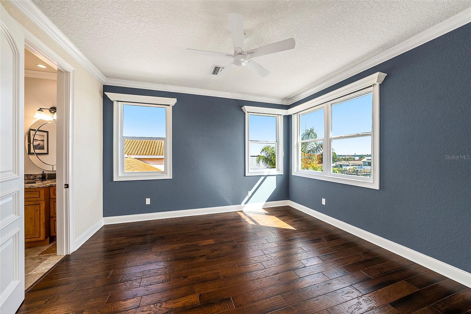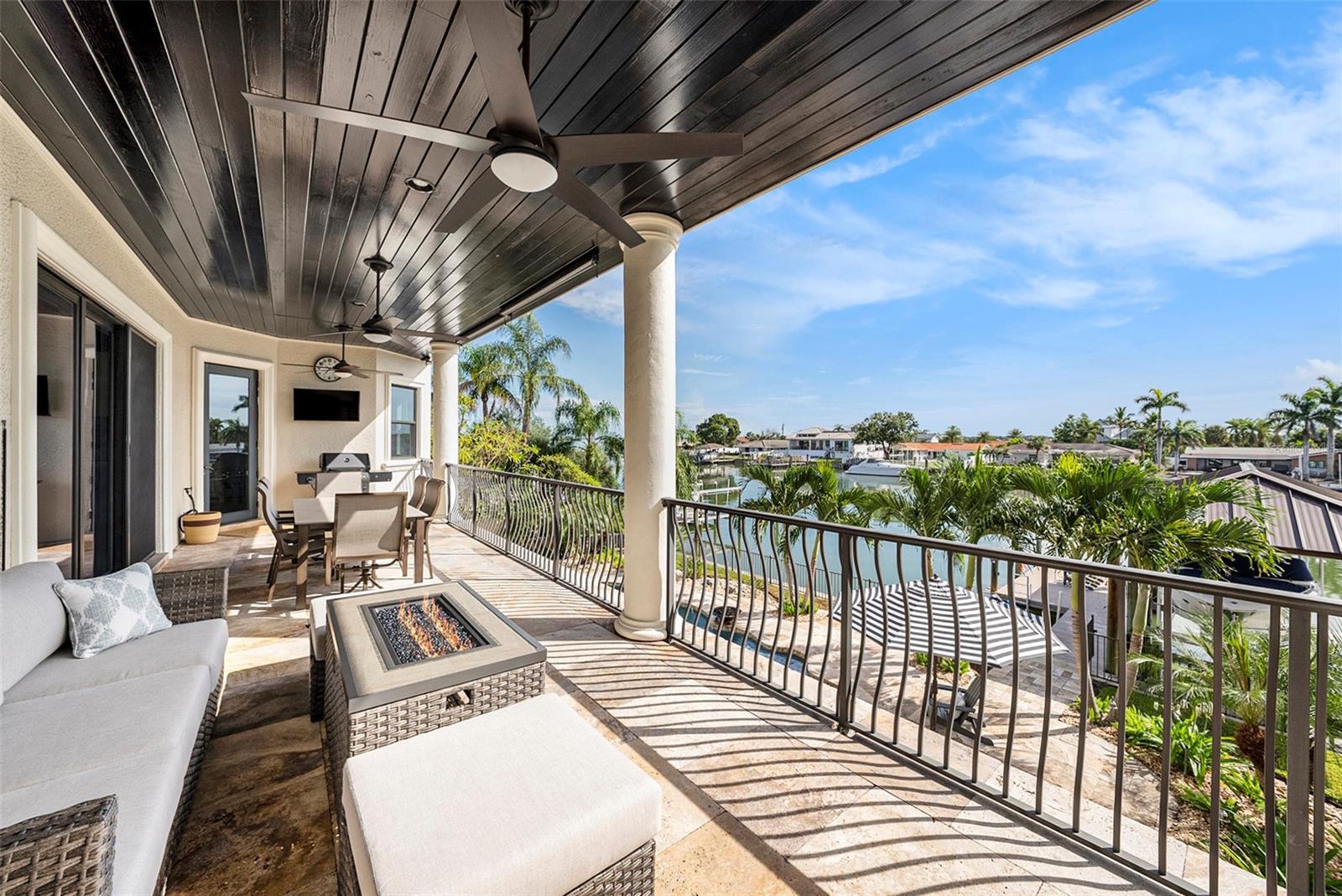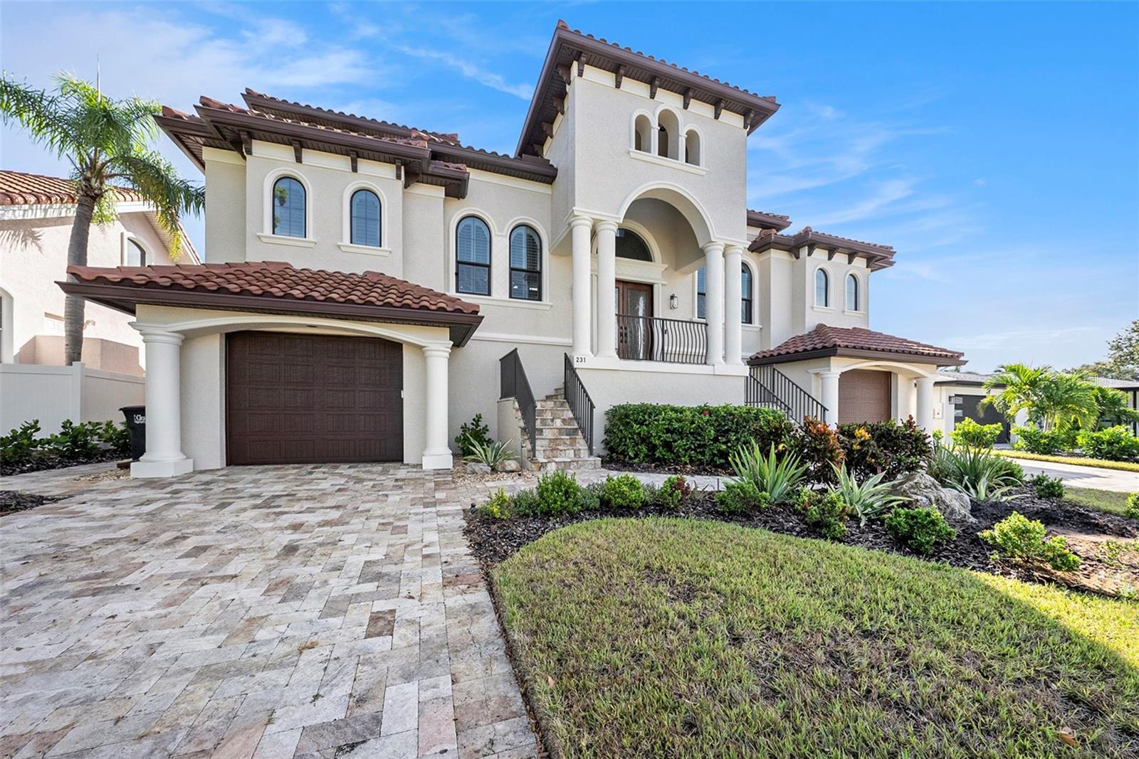 This elegant Spanish Mediterranean residence captures the heart of true coastal living with luxurious finishes throughout. Perfectly positioned on the sparkling Intracoastal waters of Clearwater Bay, it welcomes you with airy, sunlit spaces and extensive custom millwork, including coffered ceilings, layered crown molding, tray ceilings, and wainscoting that lend timeless character to every room. An elevator glides to each level, pairing everyday convenience with sophistication. The gourmet kitchen is a true centerpiece for gathering, featuring custom solid wood cabinetry with seeded glass display cabinets, granite countertops and backsplashes, a breakfast bar, a farmhouse sink, and premium appliances that include a six burner Wolf range with pot filler, Sub Zero refrigerator, dishwasher, built in microwave, ice maker, beverage fridge, and wine fridge, plus a casual eat in nook perfect for morning coffee or evening wine. A convenient half bath on the main level is perfectly placed for guests. The main level primary suite is a serene retreat with a spa-inspired bath offering a dual vanity, a standalone soaking tub, and a separate walk-in shower. Three closets provide exceptional storage, including a dressing closet that was formerly a designated office with its own private entrance and can easily be converted back for work or quiet retreat. Upstairs, two additional bedrooms each enjoy a private en suite bath and walk-in closet, with one serving as a secondary primary suite with dual closets for added comfort and privacy. Outdoor living shines, starting when you are greeted by the travertine driveway and a dual staircase leading to a stunning double door entrance, and continues with three expansive travertine terraces overlooking a sparkling saltwater pool and spillover spa. The pool area features two fire pits with cascading waterfalls and accent lighting, creating a dramatic evening ambience. Lush tropical landscaping and a fenced backyard create a private oasis for al fresco dining, quiet reading, or sunset gatherings. Boaters will appreciate the composite deep water dock with full water and electrical service, a 16-ton boat lift, and dual floating jet ski docks. The finished 4-car garage features paver flooring and a large finished flex area currently used as a gym, complete with a closet and half bath, ideal as a fourth bedroom, cabana lounge, craft studio, or media room. Blending old-world Mediterranean charm with the breezy elegance of coastal Florida, this exceptional Clearwater Bay home delivers a lifestyle where every day feels like a seaside getaway and every detail reflects thoughtful design for relaxed waterfront living.