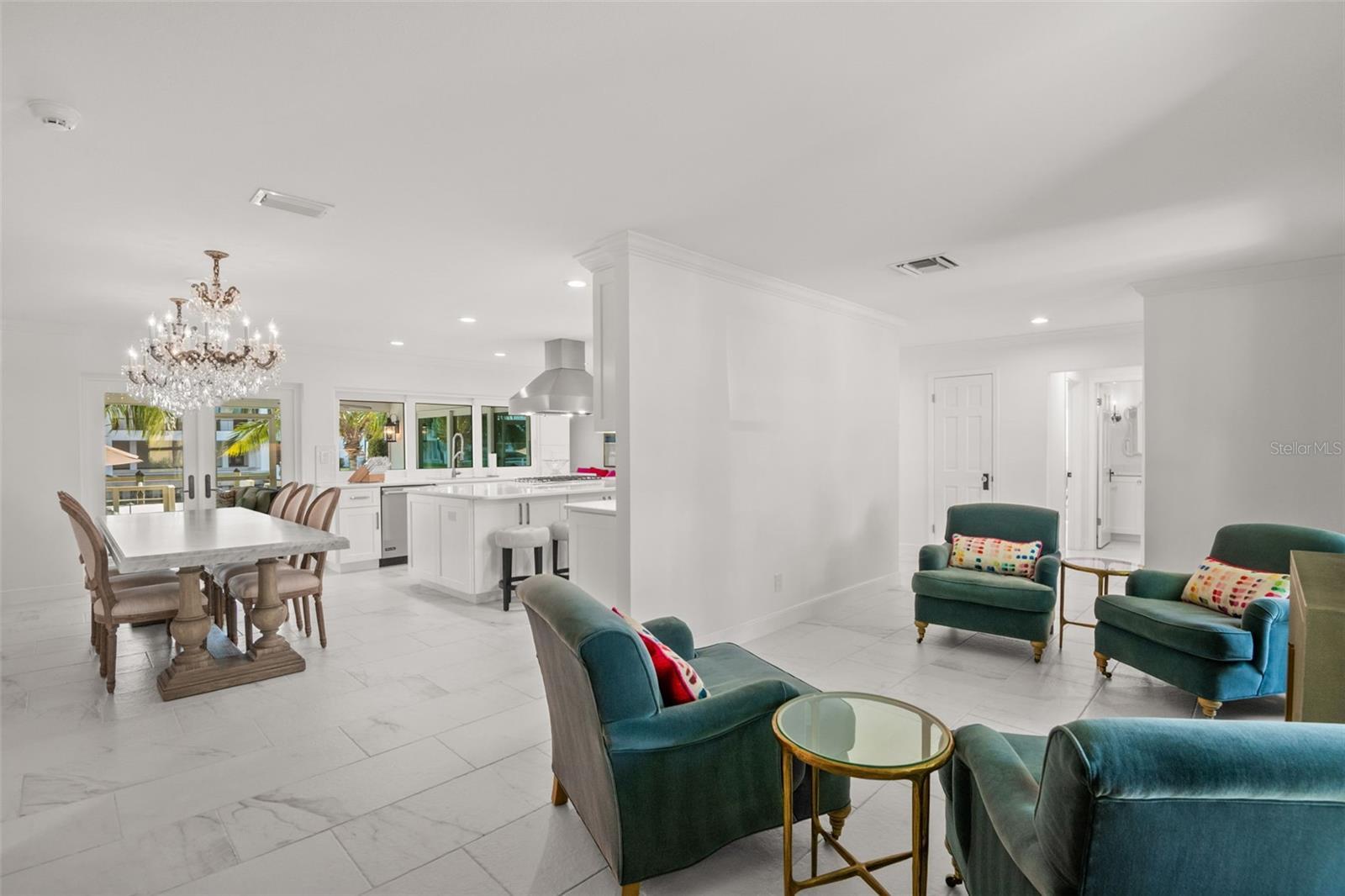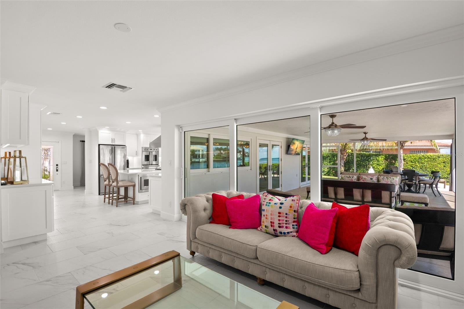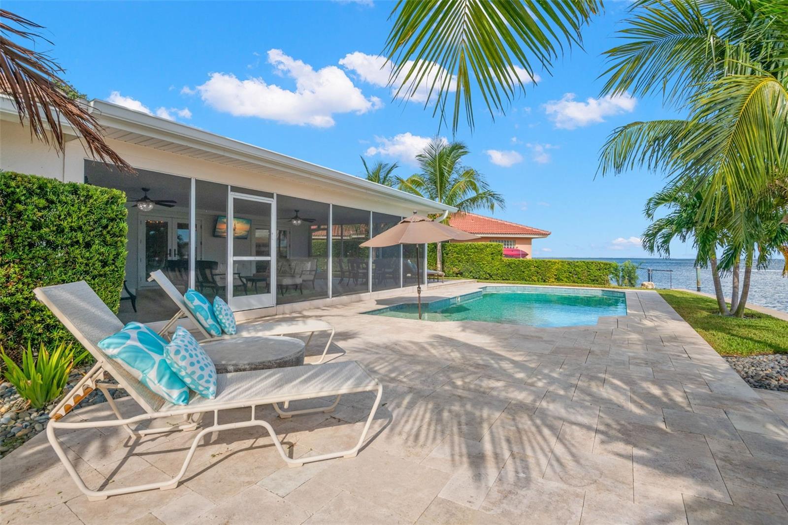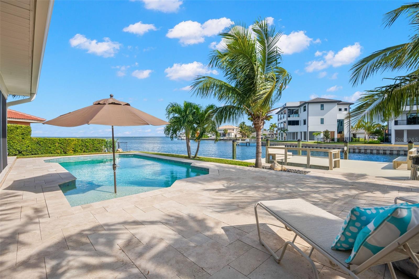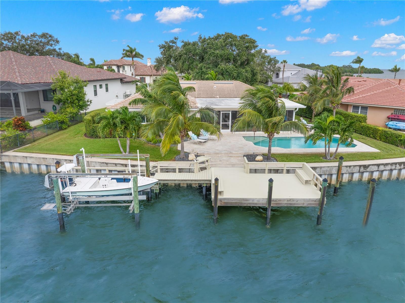 Under contract-accepting backup offers. Welcome to your private paradise located on Mermaid Point NE, a secluded street within the highly desirable waterfront neighborhood of Venetian Isles. The home was completely renovated in 2017/2018 with attention to every detail. It features a split-bedroom floor plan with 2,229 sq. ft. of living space, including 3 bedrooms, 2 ½ bathrooms, and an all-purpose utility room. The heart of the home is the Chef’s kitchen, featuring Viking appliances including a double French door wall oven, warming drawer, French door refrigerator, gas cooktop and hood, dishwasher, and microwave. The oversized full-slab island hosts the cooktop, microwave, seating, and plenty of countertop space. The kitchen also offers abundant storage, including three double pantries with custom rollout trays. A triple impact sliding glass window highlights the water views from every angle. The living space includes a formal sitting area, dining room, and a family room with a gas fireplace and a triple impact sliding glass door to capture sweeping bay views. The Owner’s suite features a large picture window overlooking the water, crown molding, custom window treatments, and an expanded spa-like bathroom with a large walk-in shower, slipper tub, private water closet, and double sinks. The enlarged walk-in closet includes custom cabinetry and a back door for easy access to the laundry room. The east side of the home offers two guest bedrooms, a guest bathroom, and a hall closet. The backyard has also undergone a complete transformation, creating a tropical oasis highlighted by open water views. It features a custom heated saltwater swimming pool with LED lighting, a swim shelf with bubblers and umbrella holder. A large travertine deck surrounds the pool. An additional outdoor entertaining area includes a large dock (20x12) with a walkway (4x30) leading to your boat lift. The dock features built-in benches, railings, a fish-cleaning table, lighting, power, and water. A large screened in patio (32x18) completes the entertaining area of the backyard. Additional improvements include: a raised seawall with oversized cap, aluminum black fencing, landscape lighting, and mature tropical landscaping. House systems have also been upgraded and added, including: a Generac whole-house generator, Carrier A/C system, impact windows, French doors, sliding glass door, and front door, Halo water system, Honeywell alarm system, upgraded electric panel, Rheem gas water heater, new hot and cold water plumbing lines, Turner Pest Control monitoring system, seamless gutters, sprinkler system, exterior lighting, and a stamped concrete driveway and walkway. You can also grab your kayak or paddleboard for a short trip to Weedon Island. The location allows for easy access to Downtown St. Petersburg, the beaches, and Tampa International Airport, which is just a short drive away.