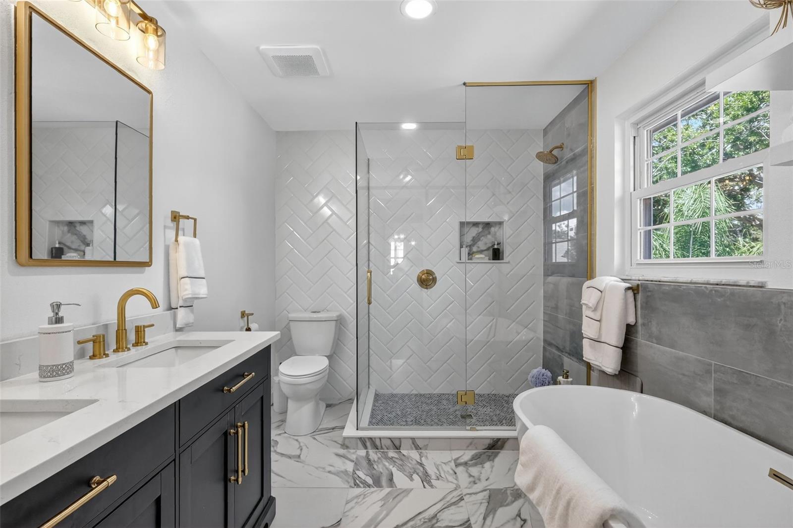 Welcome to the well-established community of Oak Forest, where tree-lined streets and a highly desirable location come together to create the perfect setting for your next home. Zoned for the coveted A-Rated Bauder Elementary School, this tri-level residence offers 3 bedrooms plus an office, 3 full bathrooms, and nearly 2,400 square feet of living space on a large corner lot of over a quarter acre. Mature, lush landscaping enhances the curb appeal, drawing you into a home that balances charm, function, and modern updates. Step inside to find crown molding accenting the formal living room, complete with a cozy wood-burning fireplace. A few steps up, the formal dining room sets the stage for gatherings, while the first-level office with a charming window seat offers versatility as a 4th bedroom if desired. The updated kitchen features wood cabinetry, granite countertops, stainless steel appliances, a gas range, and vent hood, flowing seamlessly to a spacious outdoor deck overlooking the backyard. The large family room adds another layer of comfort, with its own full bathroom—conveniently accessible from the pool area—perfect for entertaining. An indoor laundry room with storage, utility sink, and included washer and dryer adds everyday convenience. French doors open to a screened-in patio adorned with a stunning wood ceiling, creating yet another inviting space to relax. Upstairs, the oversized guest bedrooms share a full hallway bath, while the primary suite is a retreat all its own, featuring a large walk-in closet and three additional closets. The ensuite bathroom has been completely transformed, with a sliding barn door leading into a spa-like sanctuary offering dual quartz vanities, a freestanding soaking tub, and a massive frameless glass shower with floor-to-ceiling tile. The backyard is a true tropical oasis with a pavered deck surrounding the oversized in-ground pool, abundant green space, and a fully fenced yard for both privacy and play. Just minutes from Indian Shores Beach and not in a flood zone, the location couldn’t be better. Nearby Boca Ciega Millennium Park offers a 35-foot observation tower overlooking Boca Ciega Bay, fishing piers, kayak launches, picnic shelters, a barrier-free playground, and even a dog park. With A-rated schools, proximity to shopping, dining, and white-sand beaches, this home truly offers something for everyone.