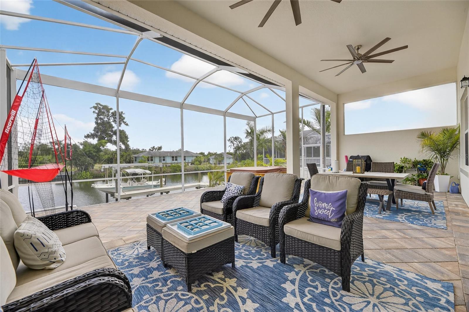 Welcome to Marisol Pointe at MiraBay—your final opportunity to own an almost-new home in SouthShore’s premier master-planned community. This beauty comes with a new boat dock and amazing water views, both front and back. The featured Cristo Floor Plan is a stunning single-story home with 4 bedrooms and 3 bathrooms, offering 2,983 square feet of open-concept living flooded with natural light and luxury vinyl flooring throughout the home (no carpet). It boasts a grand 13-foot foyer ceiling and 12-foot ceilings throughout the main living areas and bedrooms with upgraded ceiling fans and light fixtures, adding both comfort and contemporary flair to every room. This home offers a host of modern enhancements designed for comfort, convenience, and style. Outside, you'll find a pre-plumbed outdoor kitchen equipped with water, gas, electric ready for your new outdoor kitchen design—ideal for entertaining. Brand-new gutters improve both function and curb appeal, while a smart home package with security cameras adds peace of mind. The garage features a sleek new epoxy floor and includes 50 AMP EV charging outlets, making it ready for electric vehicles. A thoughtfully designed paver walkway leads from the front of the house directly to the boat lift, ensuring easy waterfront access. The landscaping has been upgraded with all-rock flower beds bordered by stone edging, offering a clean, low-maintenance aesthetic that complements the home's overall appeal. The home overlooks a serene saltwater canal and sits on a deep homesite with extended outdoor living space, including a screen enclosure and oversized spa. Enjoy evenings on your private deck—perfect for fishing—and take advantage of the 10,000 lb. boatlift, seawall, and full utility access with water and electricity. This vibrant coastal community features world-class amenities and direct access to boating adventures on the bay, all just minutes from Tampa and St. Petersburg’s top shopping, dining, and entertainment. Marisol Pointe offers the perfect blend of luxury and lifestyle, nestled within the sought-after waterfront enclave of MiraBay. Launch kayaks, paddleboards, or simply relax in your waterfront oasis. As a resident of MiraBay, you’ll also enjoy access to a clubhouse, fitness center, resort-style pool, pickleball courts, parks, tennis courts, basketball courts, scenic walking trails, and much more. This is your last chance to buy new in this exclusive community—don’t miss the opportunity to live where every day feels like a getaway.