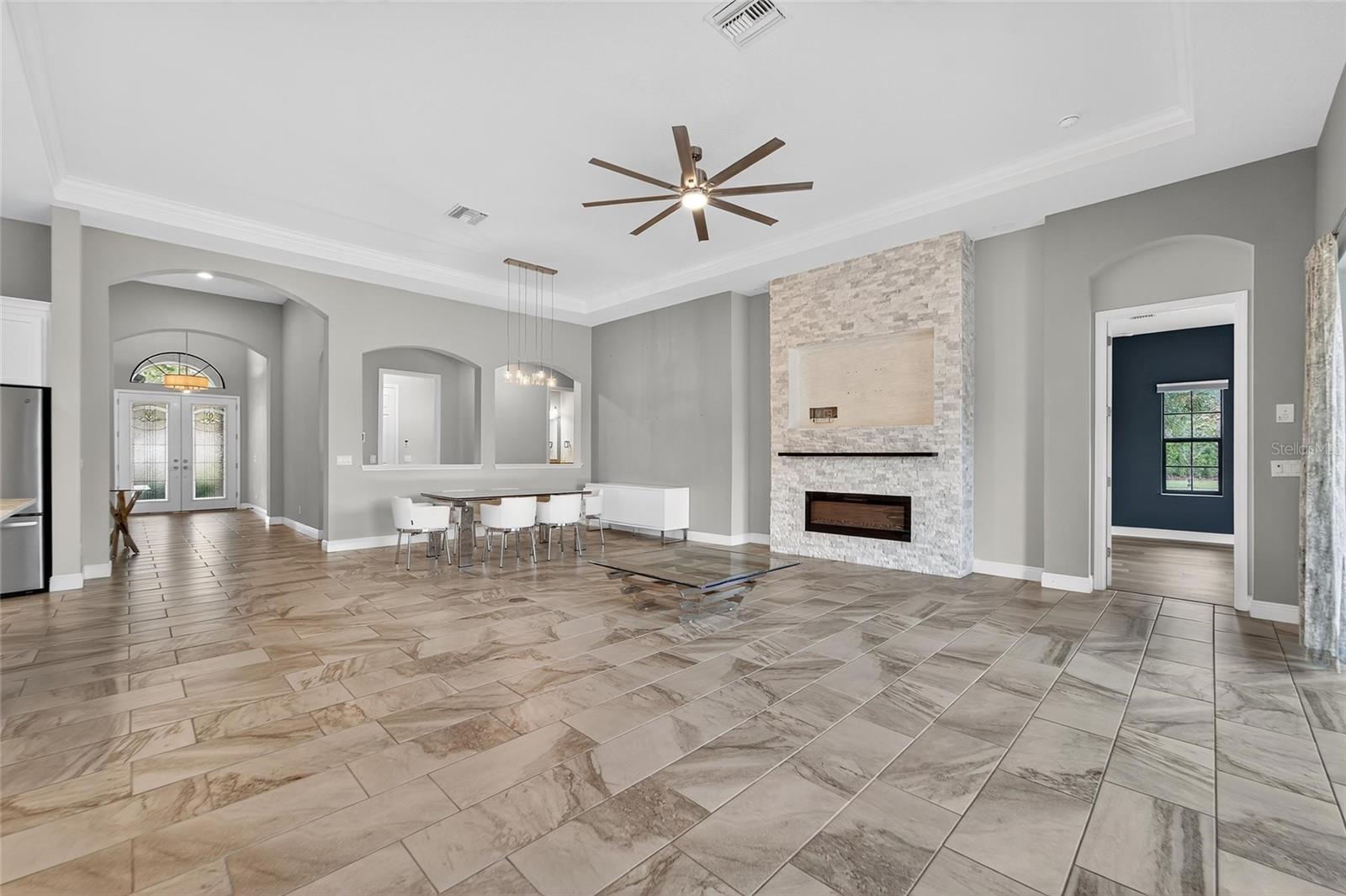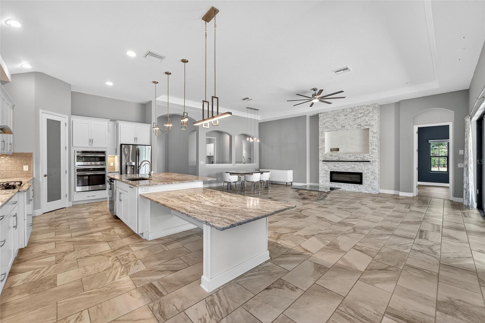- Ceiling Fans(s), Central Vaccum, Eat-in Kitchen, High Ceilings, Kitchen/Family Room Combo, Living Room/Dining Room Combo, Open Floorplan, Split Bedroom, Stone Counters, Tray Ceiling(s), Walk-In Closet(s), Window Treatments