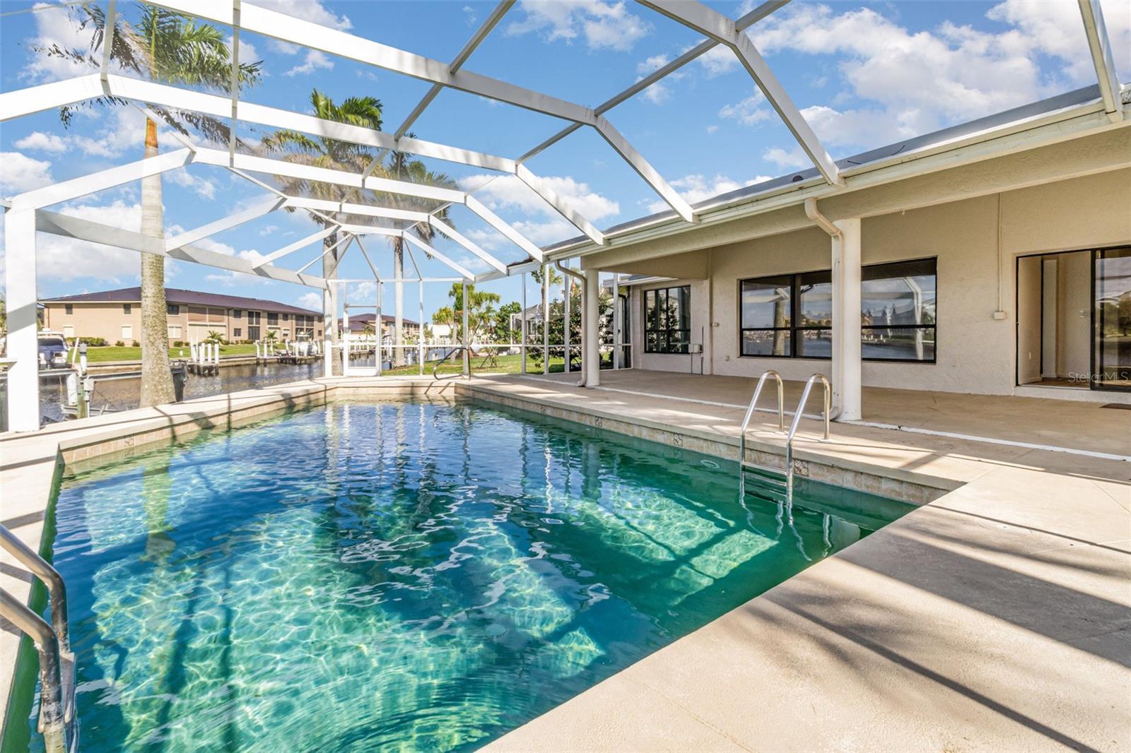 One or more photo(s) has been virtually staged. Welcome home to this exceptional 3-bedroom, 3-bathroom waterfront estate in the highly desirable Punta Gorda Isles community, a true boater’s paradise with no HOA fees. This single-story residence blends privacy, luxury, and convenience, offering quick access to Charlotte Harbor and the Gulf of Mexico with only one high-clearance bridge to navigate. Set on an oversized waterfront parcel with expansive basin views, the home welcomes you with abundant natural light, vaulted wood-beam cathedral ceilings, neutral tones, and an open floorplan designed to showcase serene water and pool vistas. The great room flows into an informal dining space and a generously sized chef’s kitchen with ample storage and a comfortable breakfast bar. The executive-style master suite features an updated ensuite bathroom with dual vanities, a jetted tub, a Roman shower, and refreshed finishes, while both guest bedrooms provide excellent natural light and spacious closets. A flexible interior laundry room offers potential as an office or hobby space. A standout feature of this home is the rare 5-car garage, ideal for car enthusiasts, craftsmen, or collectors, complete with multiple bays, overhead storage, epoxy flooring, and its own bathroom. Outside, enjoy a clear-view screened pool enclosure, stamped pool decking, and a concrete dock overlooking wide, tranquil waterfront vistas. Recent updates include a standing seam metal roof, new flooring, refreshed bathrooms, upgraded electrical components, updated hardware, epoxy-coated garage floors, fresh interior and exterior paint, and a newer water heater. Additional highlights include a circular paver driveway, crown molding, built-in storage, multiple linen closets, and a bright, welcoming layout throughout. Conveniently located near waterfront dining, pristine beaches, world-class fishing, Fishermen’s Village, parks, golf courses, shopping, entertainment, Punta Gorda Airport, and major roadways, this move-in ready home offers an unmatched combination of lifestyle and location. Sold AS-IS for seller convenience; seller has never occupied the home and no disclosures are available. Virtual furnishings may have been added to listing photos to help illustrate the home’s potential.