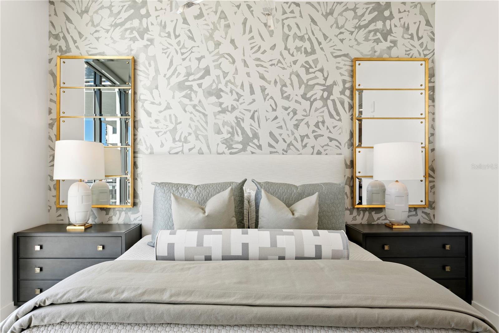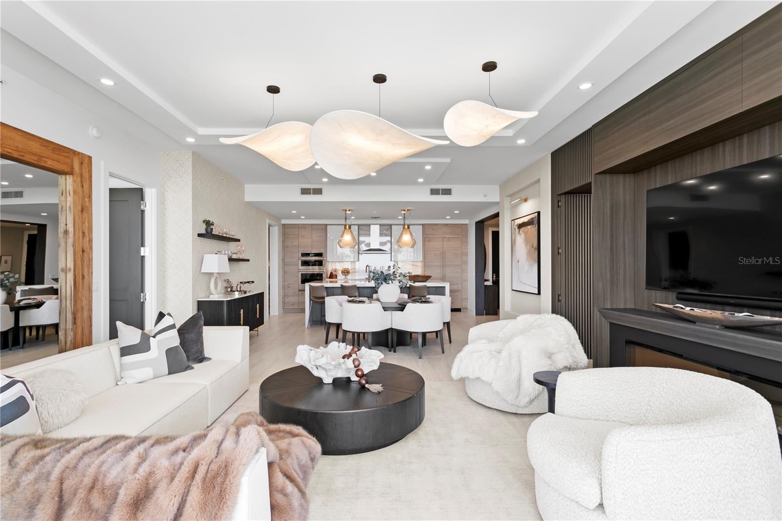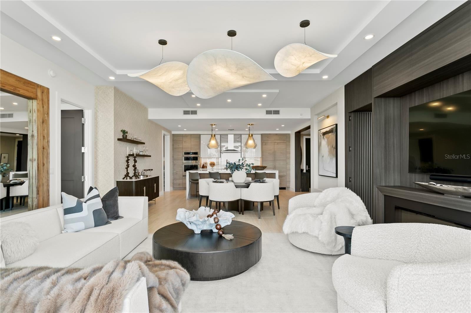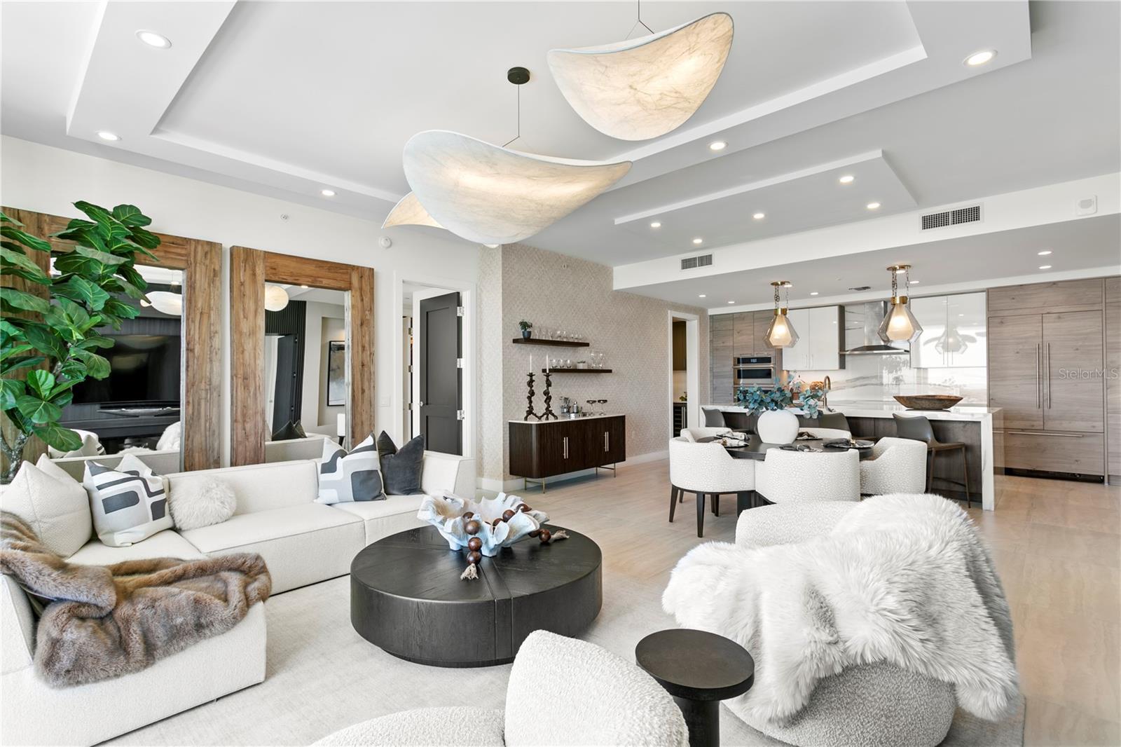 Fully Reimagined and designed in 2024, this new condo is a true masterpiece where every inch has been thoughtfully curated for the most discerning tastes. From the moment you step through the custom archway, the level of craftsmanship is evident, setting the tone for what's to come. The OPEN-CONCEPT LIVING SPACES are an absolute showstopper, featuring exquisite, HAND-SELECTED DESIGNER TOUCHES that elevate the space to another level of elegance. The main attraction is the CUSTOM MEDIA WALL WITH HIDDEN GUEST ROOM DOOR. The tone in the living room is set with THREE SILK-WRAPPED CHANDELIERS that illuminate, while a FRAMED ART WALL with TEXTURED WALLPAPER creates a bold statement. The ELEGANT TRAY CEILING with RECESSED LIGHTING enhances the sense of grandeur throughout the home. At the heart of this residence is a CHEF'S KITCHEN that is as beautiful as it is functional. The approx. 5'x11' EXPANDED ISLAND WITH A DOUBLE WATERFALL EDGE and concealed cabinetry, all WRAPPED IN SLEEK PORCELAIN, is a true work of art. The matching backsplash ties the entire space together in perfect harmony. The BUTLER'S PANTRY is a fusion of practicality and indulgence, complete with a WINE COOLER, QUARTZ COUNTERTOPS, CUSTOM CABINETRY, and laundry space, offering an unparalleled level of convenience. The DEN IS AN OASIS OF FUNCTIONALITY AND ELEGANCE, equipped with FULL-HEIGHT CUSTOM CABINETRY, an oversized chandelier that demands attention, and wallpapered accents for a refined, personalized touch. The OWNER'S SUITE OFFERS THE ULTIMATE RETREAT, combining peace and luxury with a WALLPAPERED ACCENT WALL, a DESIGNER CHANDELIER, and CUSTOM CLOSETS that are as stunning as they are spacious. The SPA-LIKE EN-SUITE BATH takes relaxation to the next level, boasting a CUSTOM LINEN CLOSET illuminated to highlight its beauty, along with three luxurious pendant lights. Every aspect of this home has been meticulously upgraded, from TILE FLOORING and LUTRON ELECTRIC BLINDS to thoughtfully curated designer finishes on walls, trim, and ceilings. As a resident of Saltaire, you'll enjoy world-class amenities including a resort-style pool, a state-of-the-art fitness center, expansive club rooms surrounded by glass that bring the outdoors in, and a pet-friendly dog park with a washing station. The 7th-floor terrace offers breathtaking panoramic views of the bay and downtown skyline, while the vibrant city life is just steps away from your front door. This is truly an extraordinary opportunity to live in a LUXURY HOME WHERE UNPARALLELED DESIGN MEETS EXTRAORDINARY CONVENIENCE. With the added peace of mind of the builder's warranty, this is a rare find in the heart of downtown.