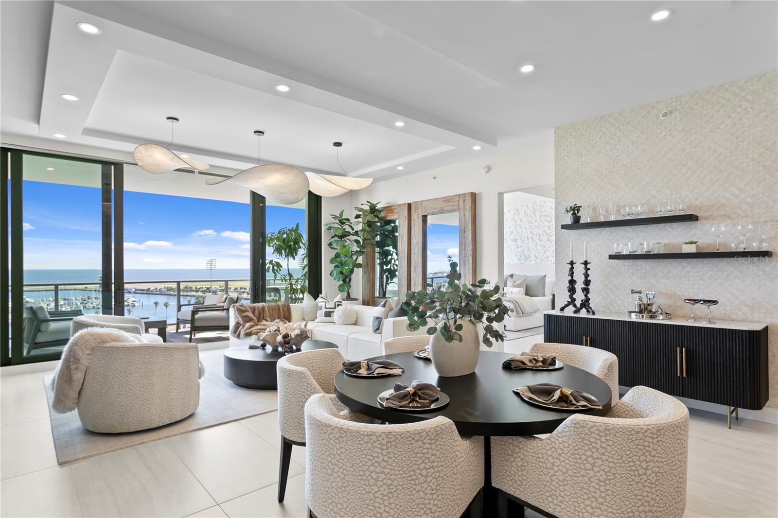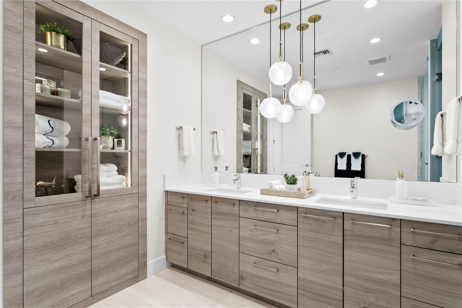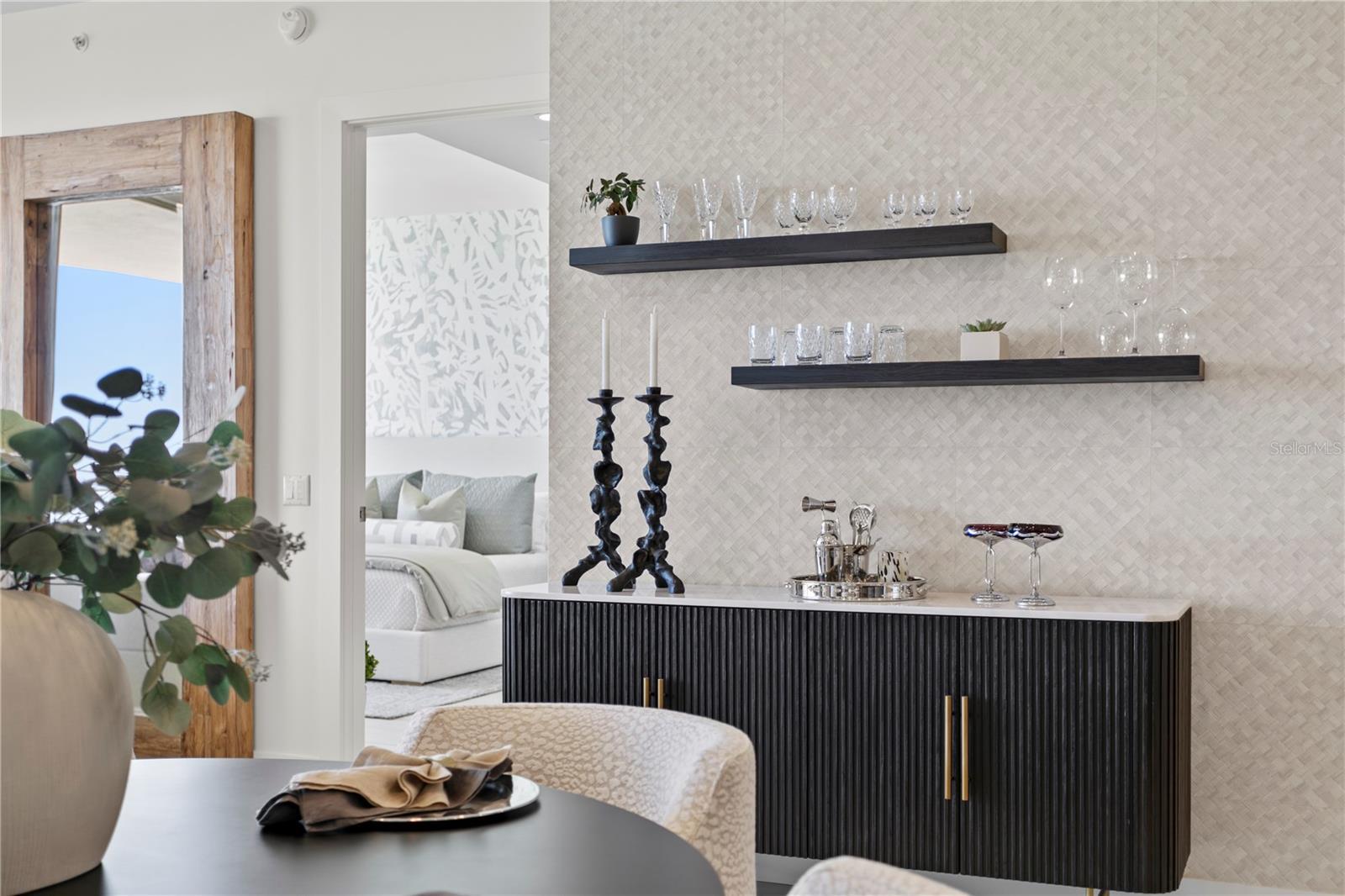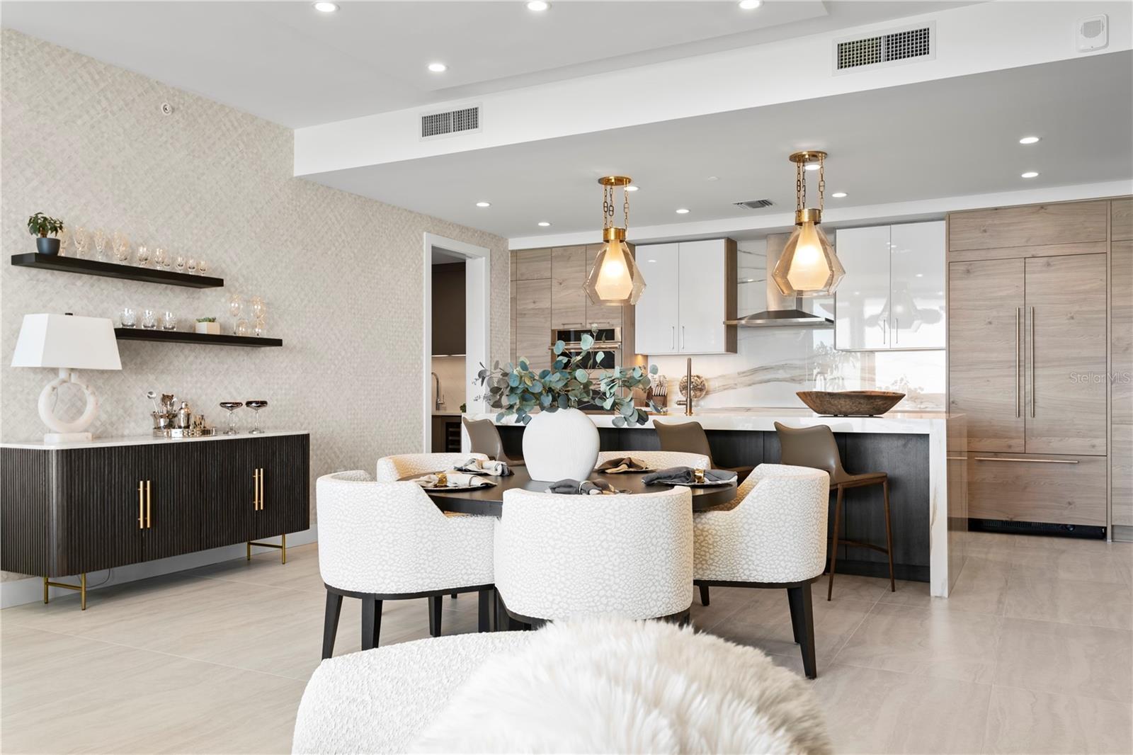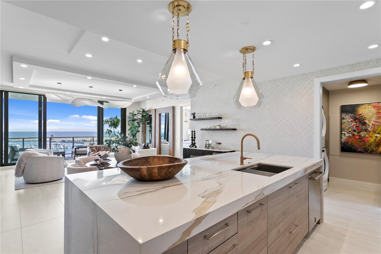 Fully Reimagined and designed in 2024, this new condo is a true masterpiece where every inch has been thoughtfully curated for the most discerning tastes. From the moment you step through the custom archway, the level of craftsmanship is evident, setting the tone for what's to come. The OPEN-CONCEPT LIVING SPACES are an absolute showstopper, featuring exquisite, HAND-SELECTED DESIGNER TOUCHES that elevate the space to another level of elegance. The main attraction is the CUSTOM MEDIA WALL WITH HIDDEN GUEST ROOM DOOR. The tone in the living room is set with THREE SILK-WRAPPED CHANDELIERS that illuminate, while a FRAMED ART WALL with TEXTURED WALLPAPER creates a bold statement. The ELEGANT TRAY CEILING with RECESSED LIGHTING enhances the sense of grandeur throughout the home. At the heart of this residence is a CHEF'S KITCHEN that is as beautiful as it is functional. The approx. 5'x11' EXPANDED ISLAND WITH A DOUBLE WATERFALL EDGE and concealed cabinetry, all WRAPPED IN SLEEK PORCELAIN, is a true work of art. The matching backsplash ties the entire space together in perfect harmony. The BUTLER'S PANTRY is a fusion of practicality and indulgence, complete with a WINE COOLER, QUARTZ COUNTERTOPS, CUSTOM CABINETRY, and laundry space, offering an unparalleled level of convenience. The DEN IS AN OASIS OF FUNCTIONALITY AND ELEGANCE, equipped with FULL-HEIGHT CUSTOM CABINETRY, an oversized chandelier that demands attention, and wallpapered accents for a refined, personalized touch. The OWNER'S SUITE OFFERS THE ULTIMATE RETREAT, combining peace and luxury with a WALLPAPERED ACCENT WALL, a DESIGNER CHANDELIER, and CUSTOM CLOSETS that are as stunning as they are spacious. The SPA-LIKE EN-SUITE BATH takes relaxation to the next level, boasting a CUSTOM LINEN CLOSET illuminated to highlight its beauty, along with three luxurious pendant lights. Every aspect of this home has been meticulously upgraded, from TILE FLOORING and LUTRON ELECTRIC BLINDS to thoughtfully curated designer finishes on walls, trim, and ceilings. As a resident of Saltaire, you'll enjoy world-class amenities including a resort-style pool, a state-of-the-art fitness center, expansive club rooms surrounded by glass that bring the outdoors in, and a pet-friendly dog park with a washing station. The 7th-floor terrace offers breathtaking panoramic views of the bay and downtown skyline, while the vibrant city life is just steps away from your front door. This is truly an extraordinary opportunity to live in a LUXURY HOME WHERE UNPARALLELED DESIGN MEETS EXTRAORDINARY CONVENIENCE. With the added peace of mind of the builder's warranty, this is a rare find in the heart of downtown.