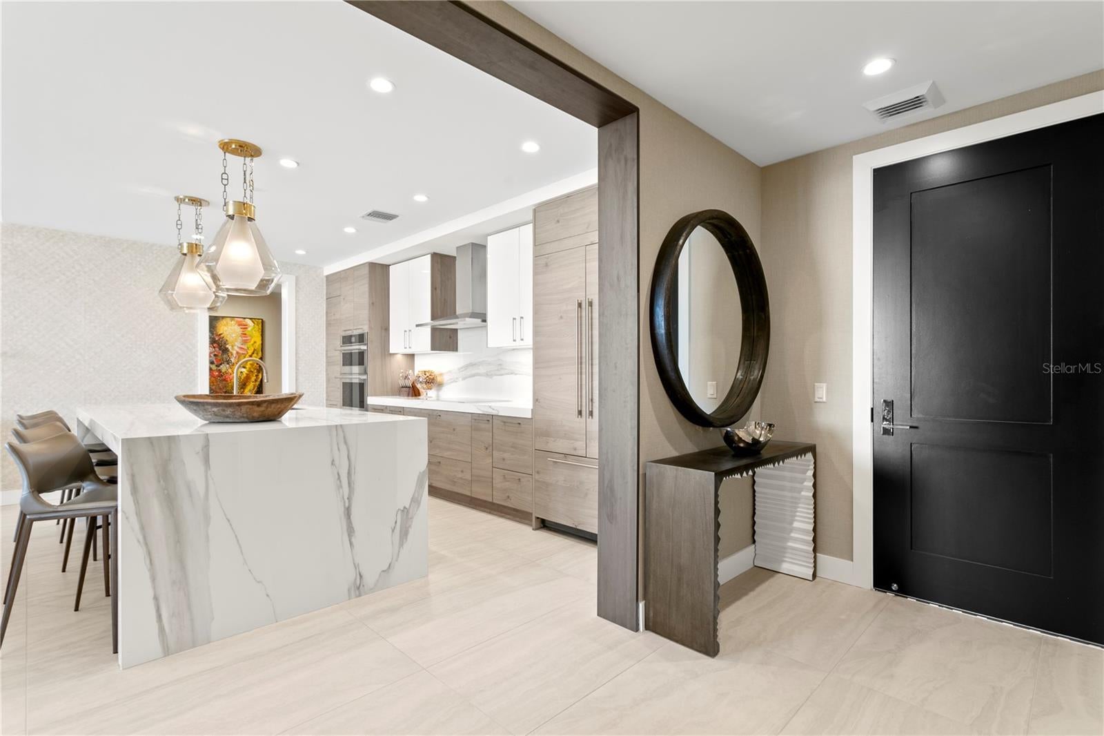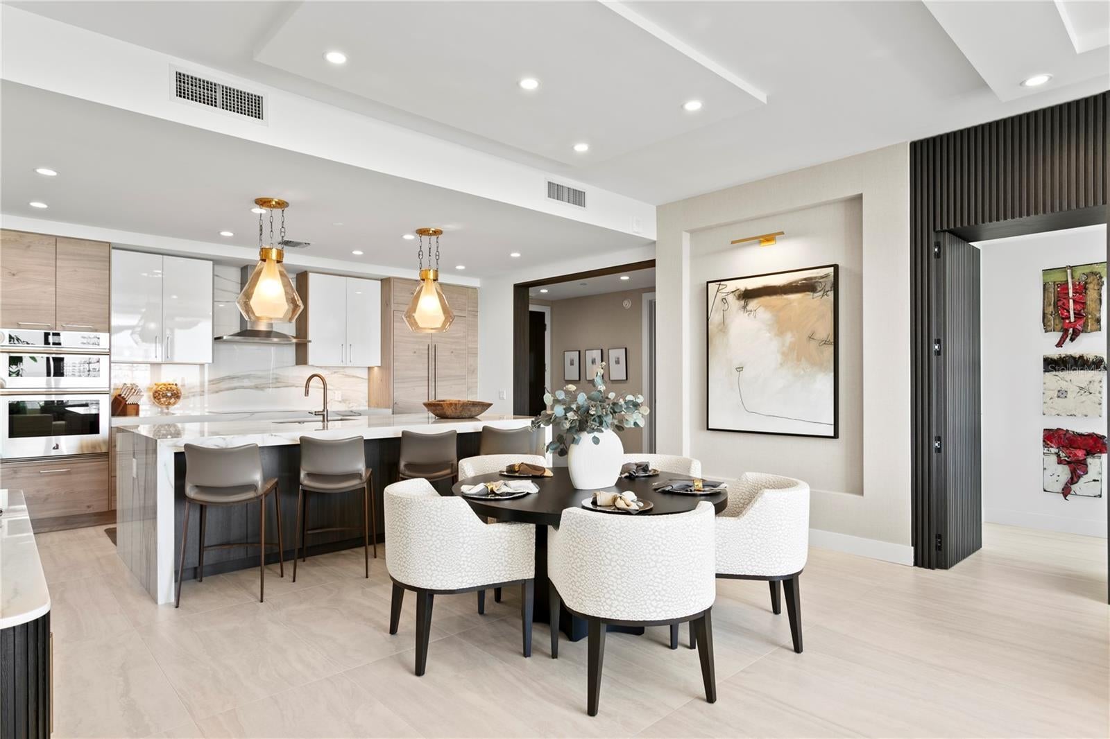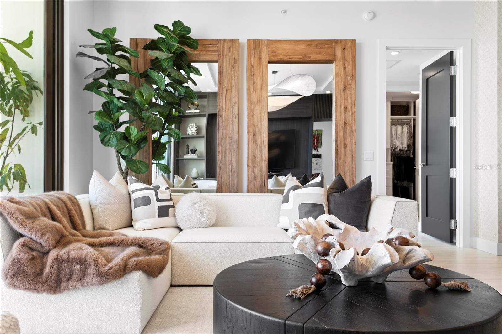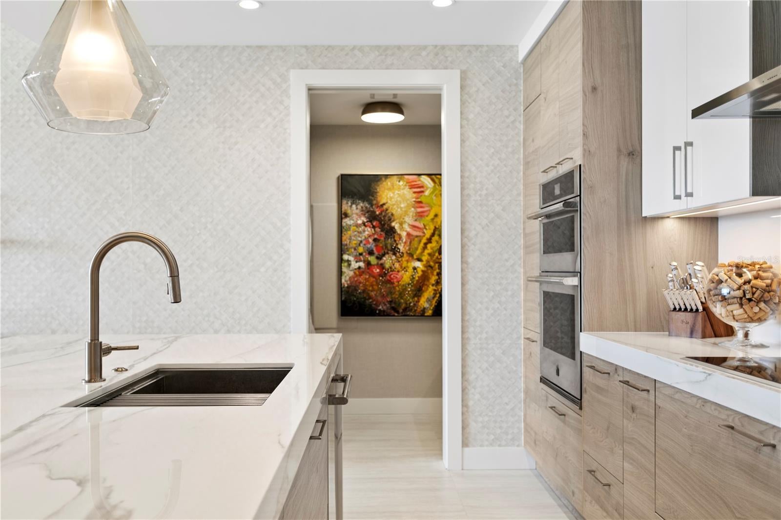 Fully Reimagined and designed in 2024, this new condo is a true masterpiece where every inch has been thoughtfully curated for the most discerning tastes. From the moment you step through the custom archway, the level of craftsmanship is evident, setting the tone for what's to come. The OPEN-CONCEPT LIVING SPACES are an absolute showstopper, featuring exquisite, HAND-SELECTED DESIGNER TOUCHES that elevate the space to another level of elegance. The main attraction is the CUSTOM MEDIA WALL WITH HIDDEN GUEST ROOM DOOR. The tone in the living room is set with THREE SILK-WRAPPED CHANDELIERS that illuminate, while a FRAMED ART WALL with TEXTURED WALLPAPER creates a bold statement. The ELEGANT TRAY CEILING with RECESSED LIGHTING enhances the sense of grandeur throughout the home. At the heart of this residence is a CHEF'S KITCHEN that is as beautiful as it is functional. The approx. 5'x11' EXPANDED ISLAND WITH A DOUBLE WATERFALL EDGE and concealed cabinetry, all WRAPPED IN SLEEK PORCELAIN, is a true work of art. The matching backsplash ties the entire space together in perfect harmony. The BUTLER'S PANTRY is a fusion of practicality and indulgence, complete with a WINE COOLER, QUARTZ COUNTERTOPS, CUSTOM CABINETRY, and laundry space, offering an unparalleled level of convenience. The DEN IS AN OASIS OF FUNCTIONALITY AND ELEGANCE, equipped with FULL-HEIGHT CUSTOM CABINETRY, an oversized chandelier that demands attention, and wallpapered accents for a refined, personalized touch. The OWNER'S SUITE OFFERS THE ULTIMATE RETREAT, combining peace and luxury with a WALLPAPERED ACCENT WALL, a DESIGNER CHANDELIER, and CUSTOM CLOSETS that are as stunning as they are spacious. The SPA-LIKE EN-SUITE BATH takes relaxation to the next level, boasting a CUSTOM LINEN CLOSET illuminated to highlight its beauty, along with three luxurious pendant lights. Every aspect of this home has been meticulously upgraded, from TILE FLOORING and LUTRON ELECTRIC BLINDS to thoughtfully curated designer finishes on walls, trim, and ceilings. As a resident of Saltaire, you'll enjoy world-class amenities including a resort-style pool, a state-of-the-art fitness center, expansive club rooms surrounded by glass that bring the outdoors in, and a pet-friendly dog park with a washing station. The 7th-floor terrace offers breathtaking panoramic views of the bay and downtown skyline, while the vibrant city life is just steps away from your front door. This is truly an extraordinary opportunity to live in a LUXURY HOME WHERE UNPARALLELED DESIGN MEETS EXTRAORDINARY CONVENIENCE. With the added peace of mind of the builder's warranty, this is a rare find in the heart of downtown.