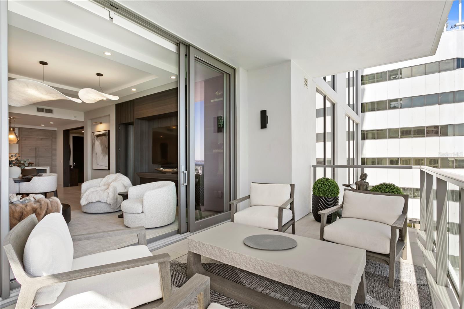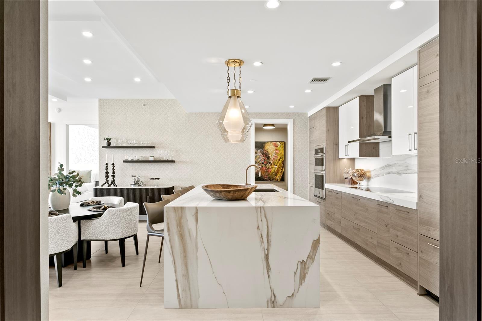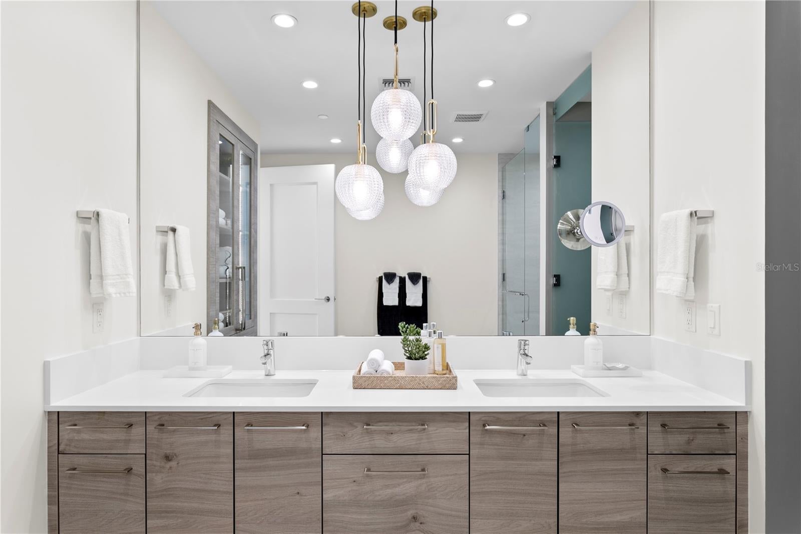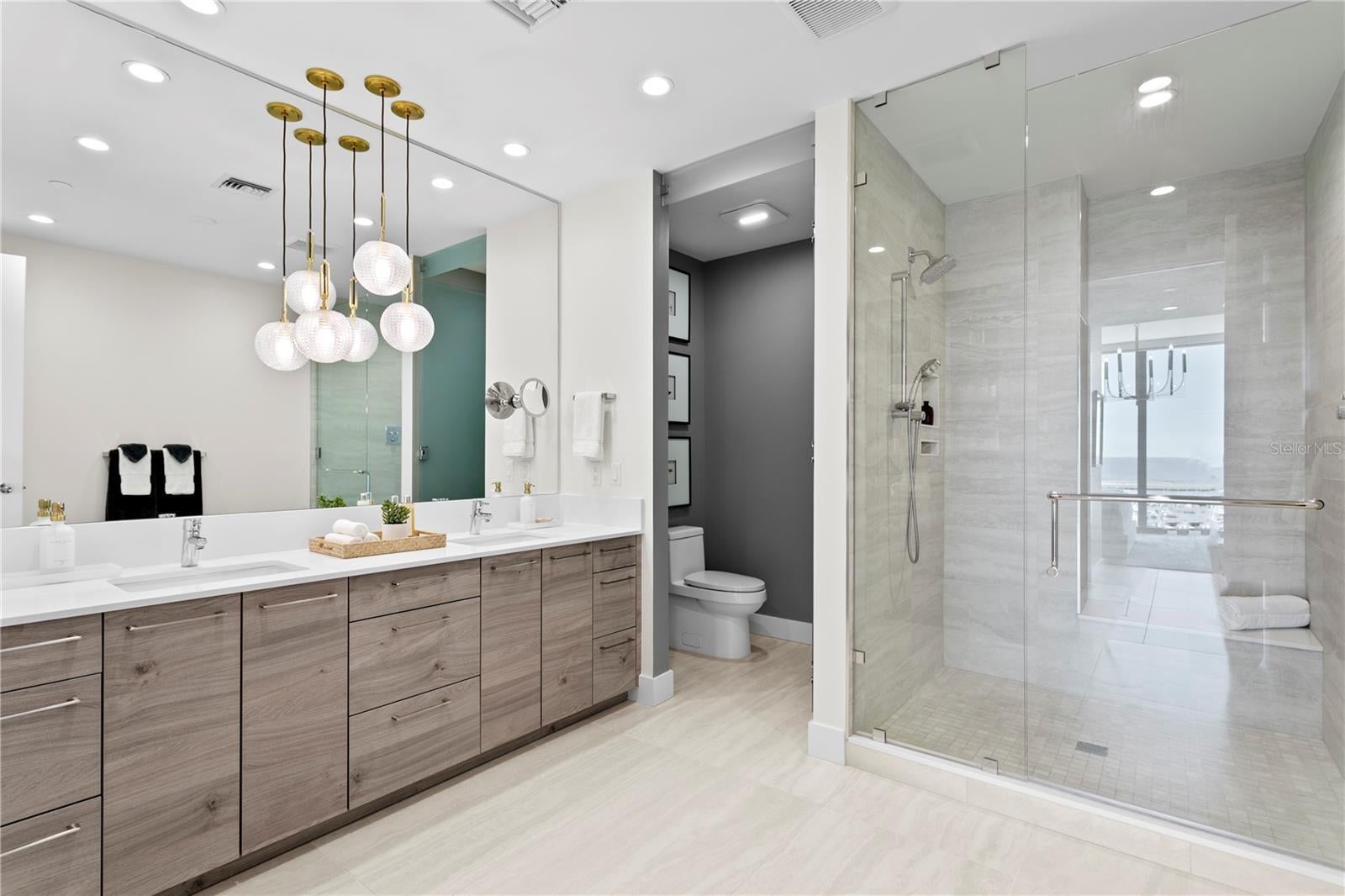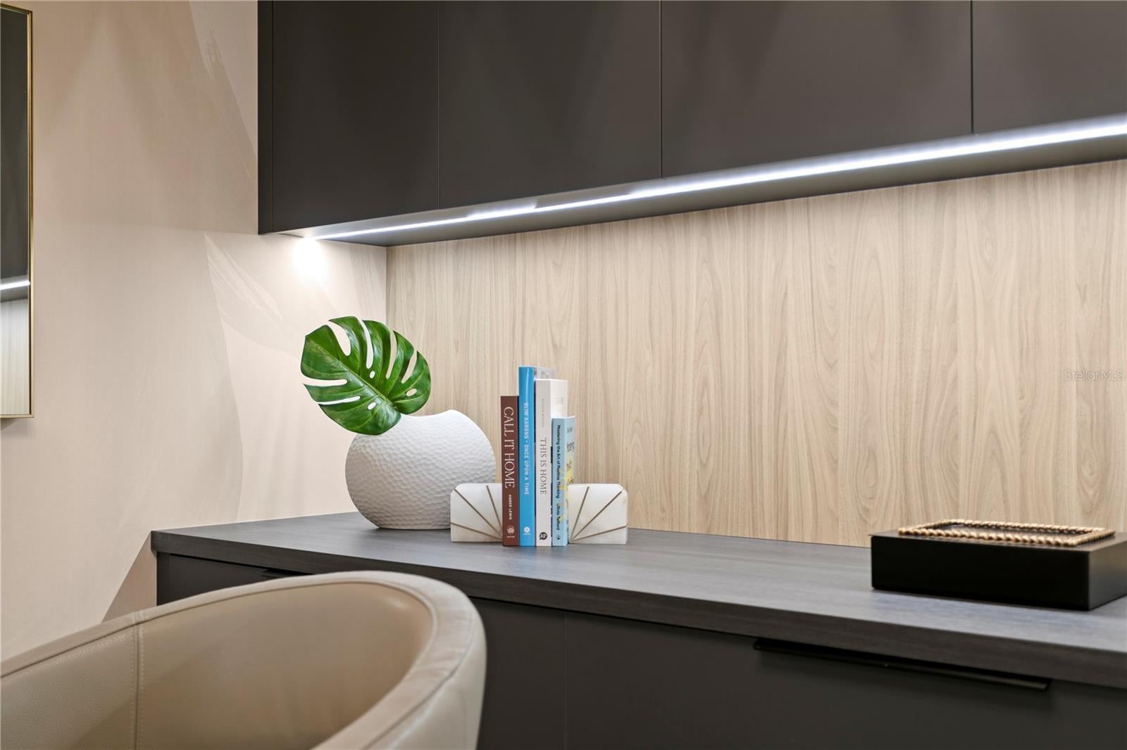 Fully Reimagined and designed in 2024, this new condo is a true masterpiece where every inch has been thoughtfully curated for the most discerning tastes. From the moment you step through the custom archway, the level of craftsmanship is evident, setting the tone for what's to come. The OPEN-CONCEPT LIVING SPACES are an absolute showstopper, featuring exquisite, HAND-SELECTED DESIGNER TOUCHES that elevate the space to another level of elegance. The main attraction is the CUSTOM MEDIA WALL WITH HIDDEN GUEST ROOM DOOR. The tone in the living room is set with THREE SILK-WRAPPED CHANDELIERS that illuminate, while a FRAMED ART WALL with TEXTURED WALLPAPER creates a bold statement. The ELEGANT TRAY CEILING with RECESSED LIGHTING enhances the sense of grandeur throughout the home. At the heart of this residence is a CHEF'S KITCHEN that is as beautiful as it is functional. The approx. 5'x11' EXPANDED ISLAND WITH A DOUBLE WATERFALL EDGE and concealed cabinetry, all WRAPPED IN SLEEK PORCELAIN, is a true work of art. The matching backsplash ties the entire space together in perfect harmony. The BUTLER'S PANTRY is a fusion of practicality and indulgence, complete with a WINE COOLER, QUARTZ COUNTERTOPS, CUSTOM CABINETRY, and laundry space, offering an unparalleled level of convenience. The DEN IS AN OASIS OF FUNCTIONALITY AND ELEGANCE, equipped with FULL-HEIGHT CUSTOM CABINETRY, an oversized chandelier that demands attention, and wallpapered accents for a refined, personalized touch. The OWNER'S SUITE OFFERS THE ULTIMATE RETREAT, combining peace and luxury with a WALLPAPERED ACCENT WALL, a DESIGNER CHANDELIER, and CUSTOM CLOSETS that are as stunning as they are spacious. The SPA-LIKE EN-SUITE BATH takes relaxation to the next level, boasting a CUSTOM LINEN CLOSET illuminated to highlight its beauty, along with three luxurious pendant lights. Every aspect of this home has been meticulously upgraded, from TILE FLOORING and LUTRON ELECTRIC BLINDS to thoughtfully curated designer finishes on walls, trim, and ceilings. As a resident of Saltaire, you'll enjoy world-class amenities including a resort-style pool, a state-of-the-art fitness center, expansive club rooms surrounded by glass that bring the outdoors in, and a pet-friendly dog park with a washing station. The 7th-floor terrace offers breathtaking panoramic views of the bay and downtown skyline, while the vibrant city life is just steps away from your front door. This is truly an extraordinary opportunity to live in a LUXURY HOME WHERE UNPARALLELED DESIGN MEETS EXTRAORDINARY CONVENIENCE. With the added peace of mind of the builder's warranty, this is a rare find in the heart of downtown.