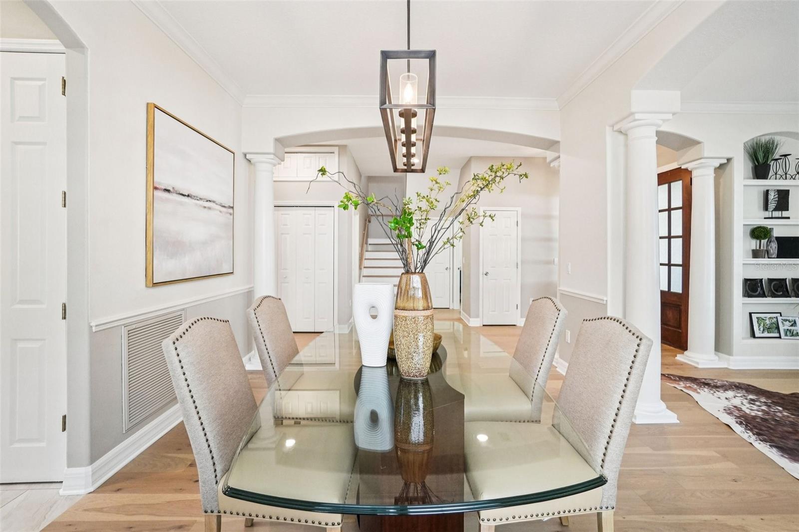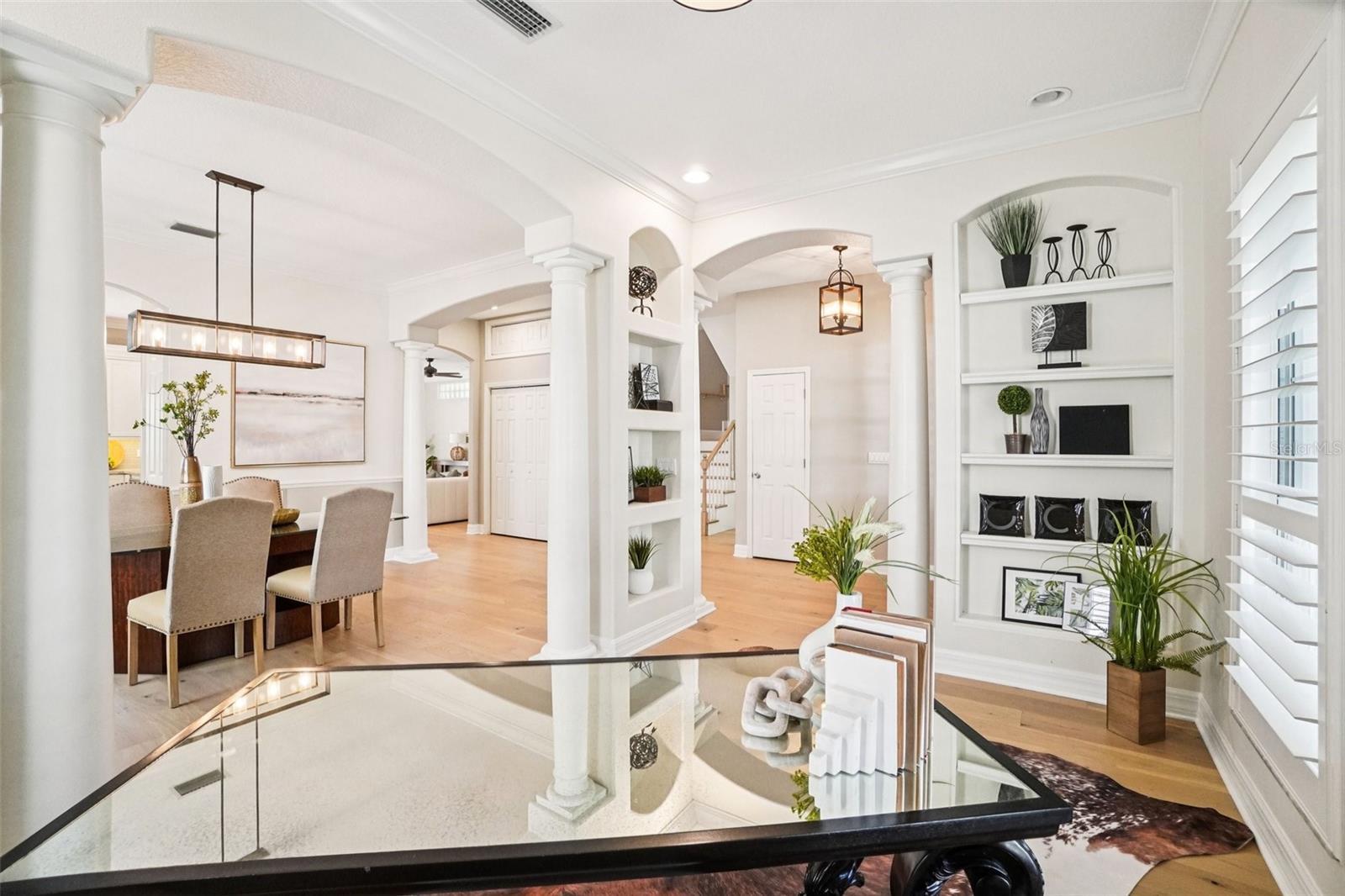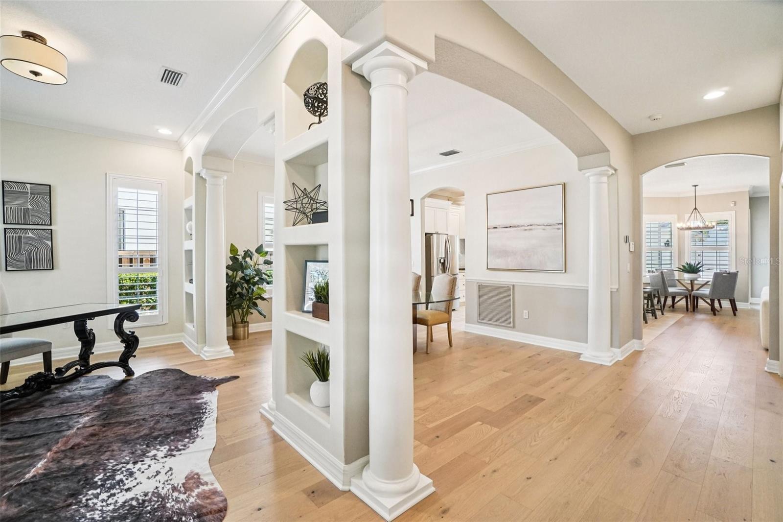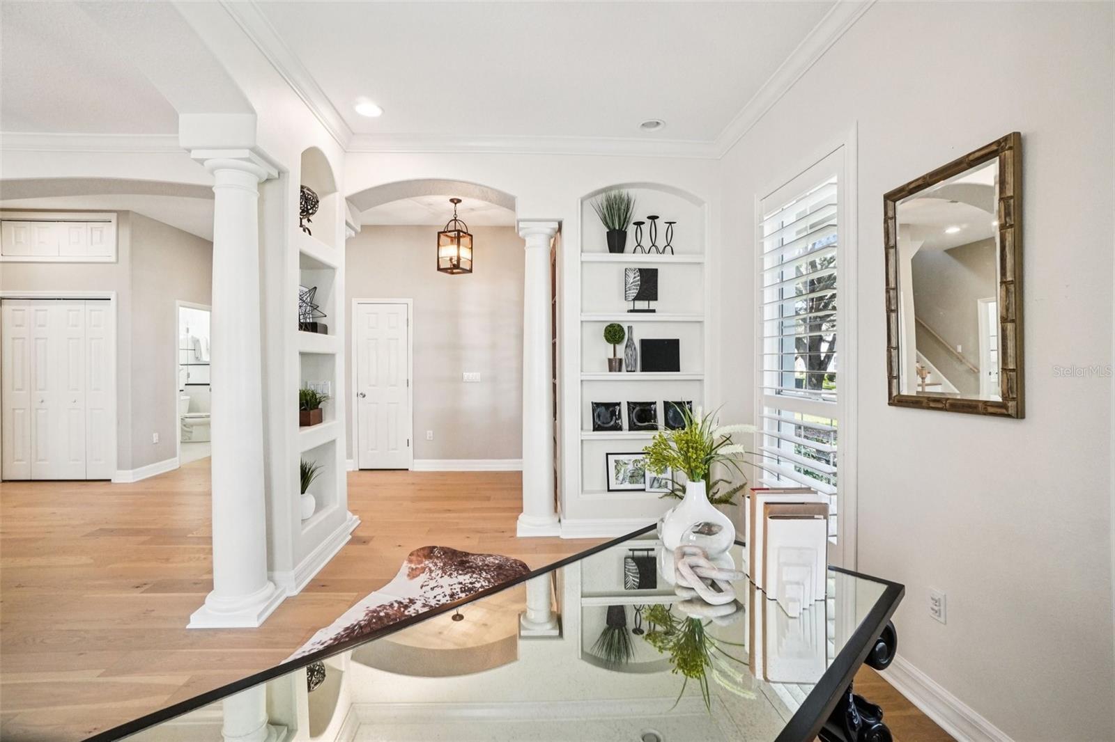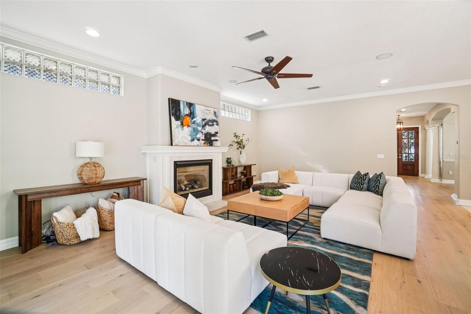 - Built-in Features, Ceiling Fans(s), Central Vaccum, Crown Molding, Kitchen/Family Room Combo, Open Floorplan, Solid Surface Counters, Split Bedroom, Tray Ceiling(s), Walk-In Closet(s), Window Treatments