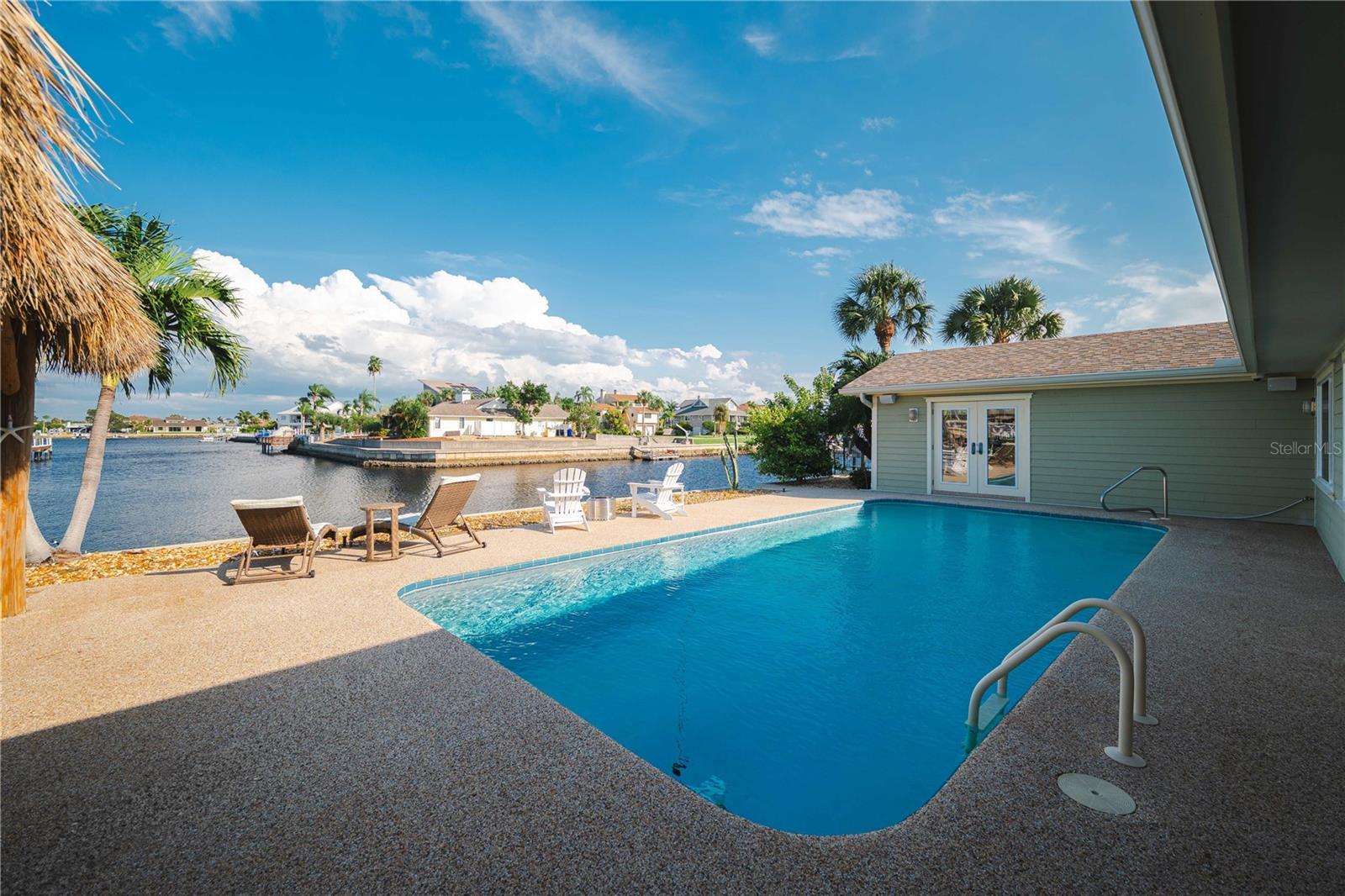 Paradise awaits at this exceptional three-bedroom, two-and-a-half-bath waterfront estate with a detached two-bedroom in-law suite on a double lot in New Port Richey. Resting proudly on 0.43 acres, this 4,018-square-foot home blends luxury, resilience and comfort—having weathered two hurricanes with no damage or flooding. Fully restored in 2017, the main home features a chef’s kitchen with vaulted beamed ceilings, granite counters, stainless steel appliances, double ovens and a spacious pantry. The expansive great room opens to tranquil waterfront views and an entertainer’s lanai. French doors lead to the primary suite, which includes a bonus room (currently used as a gym), a spa-like bath with a soaking tub, dual sinks, and custom California Closets. Outdoors, enjoy the open-air saltwater pool, a tiki hut with power and lighting and a private dock with concrete pilings and a 16,000-pound boat lift. For the car enthusiast or RV owner, the 45-by-38-foot detached garage offers storage for 4–6 cars, RV access, and a second-floor in-law suite with two bedrooms, a full kitchen, a bath and a private balcony with water views. Additional features include a two-car attached garage, solar water heater, 20 owned solar panels, plantation shutters and lush landscaping. This is luxury waterfront living—designed for boaters, RVers, and anyone who craves space, style and security.