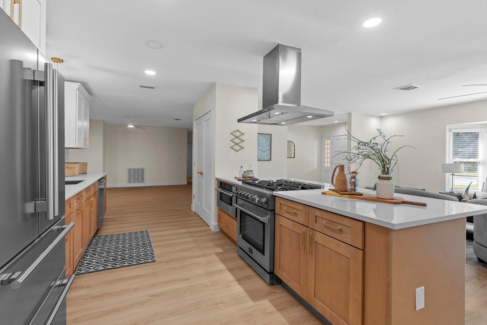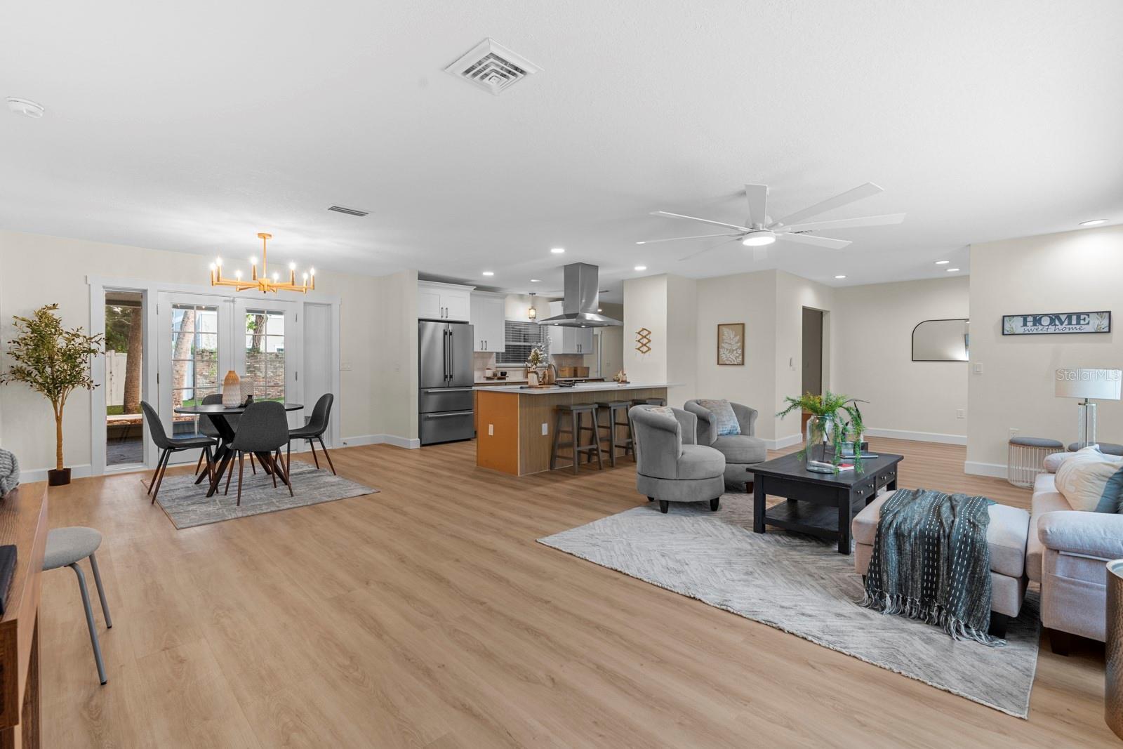 - Ceiling Fans(s), Eat-in Kitchen, Kitchen/Family Room Combo, L Dining, Living Room/Dining Room Combo, Solid Wood Cabinets, Split Bedroom, Stone Counters, Walk-In Closet(s)