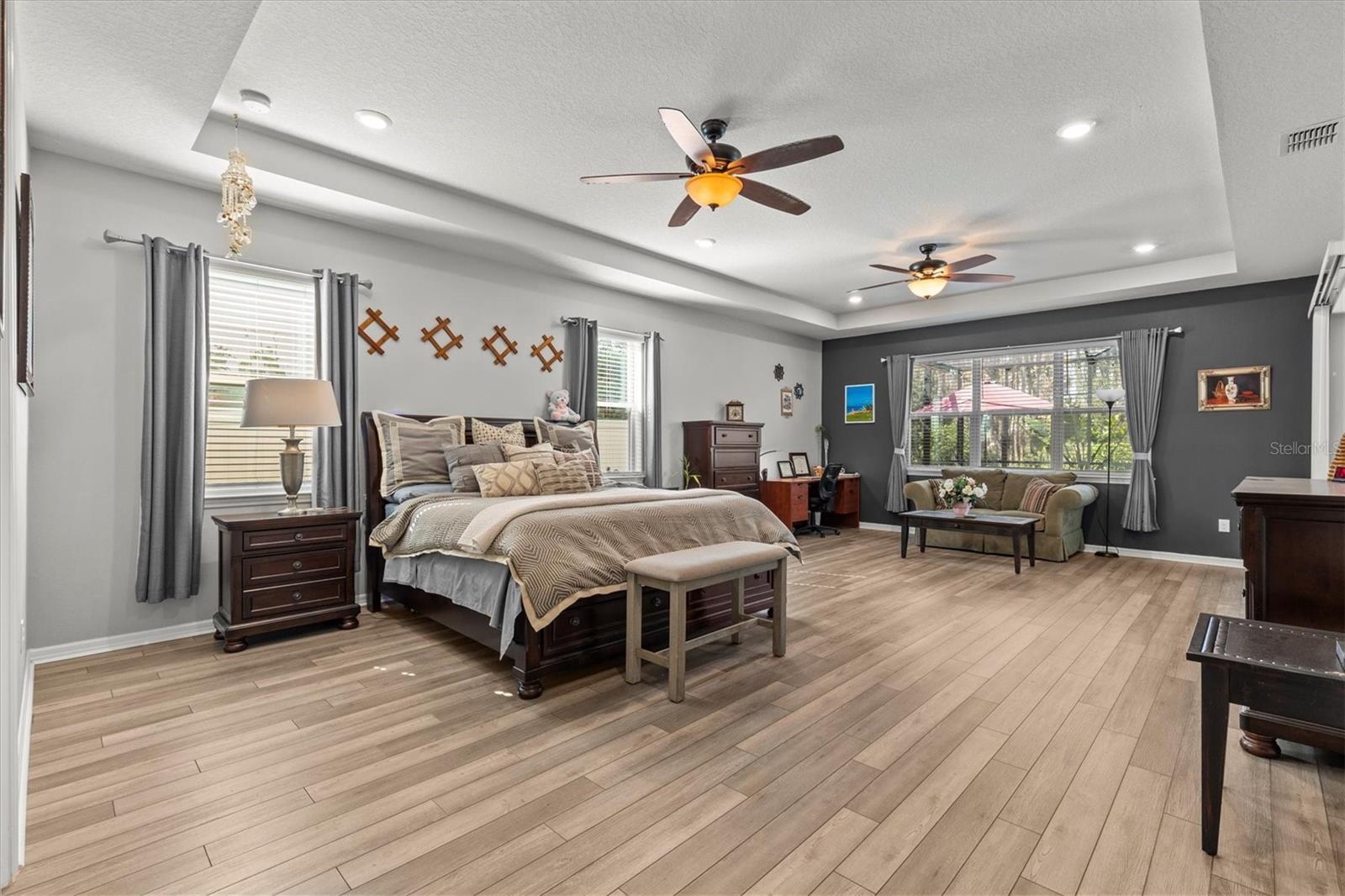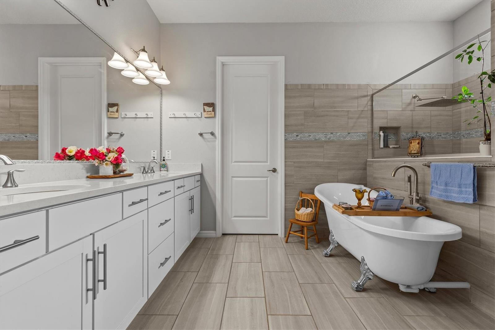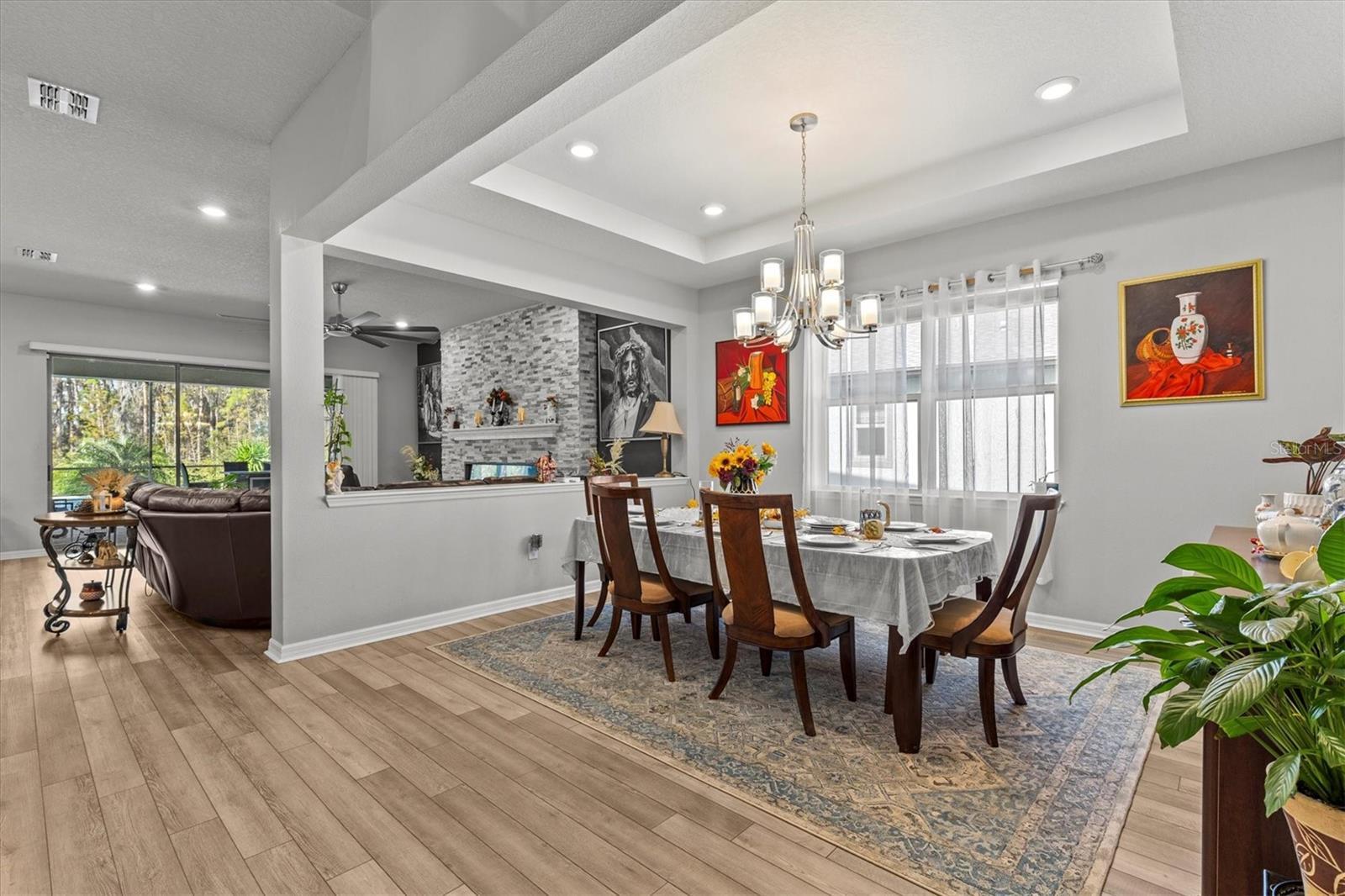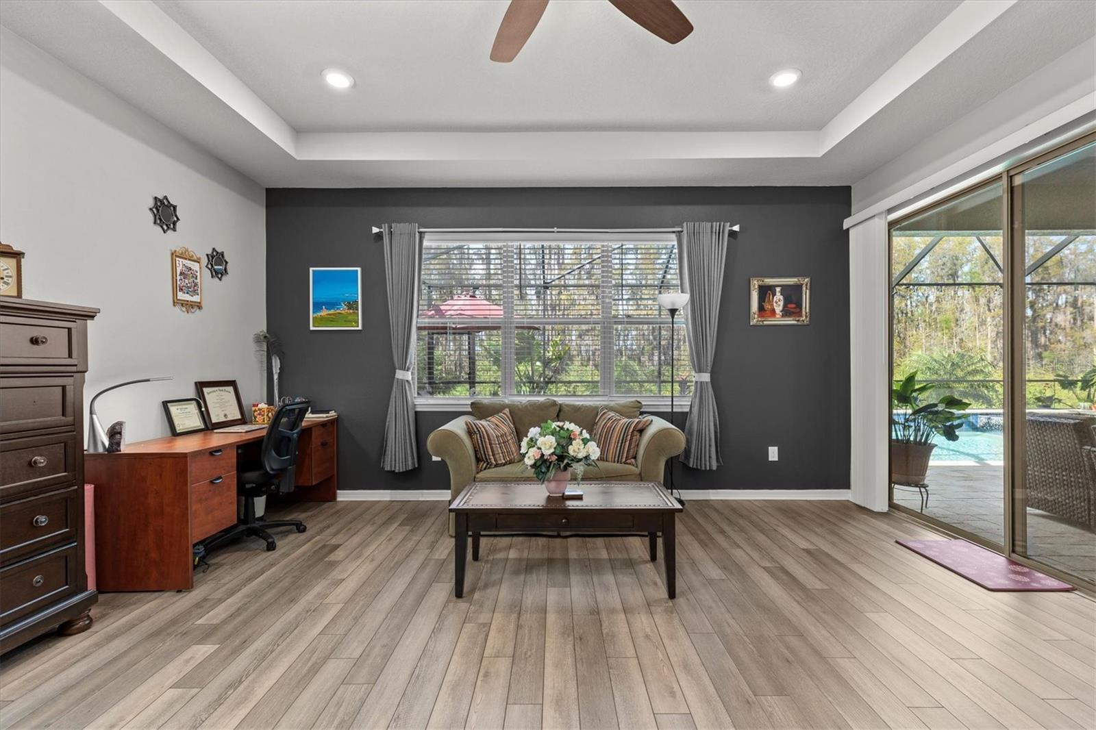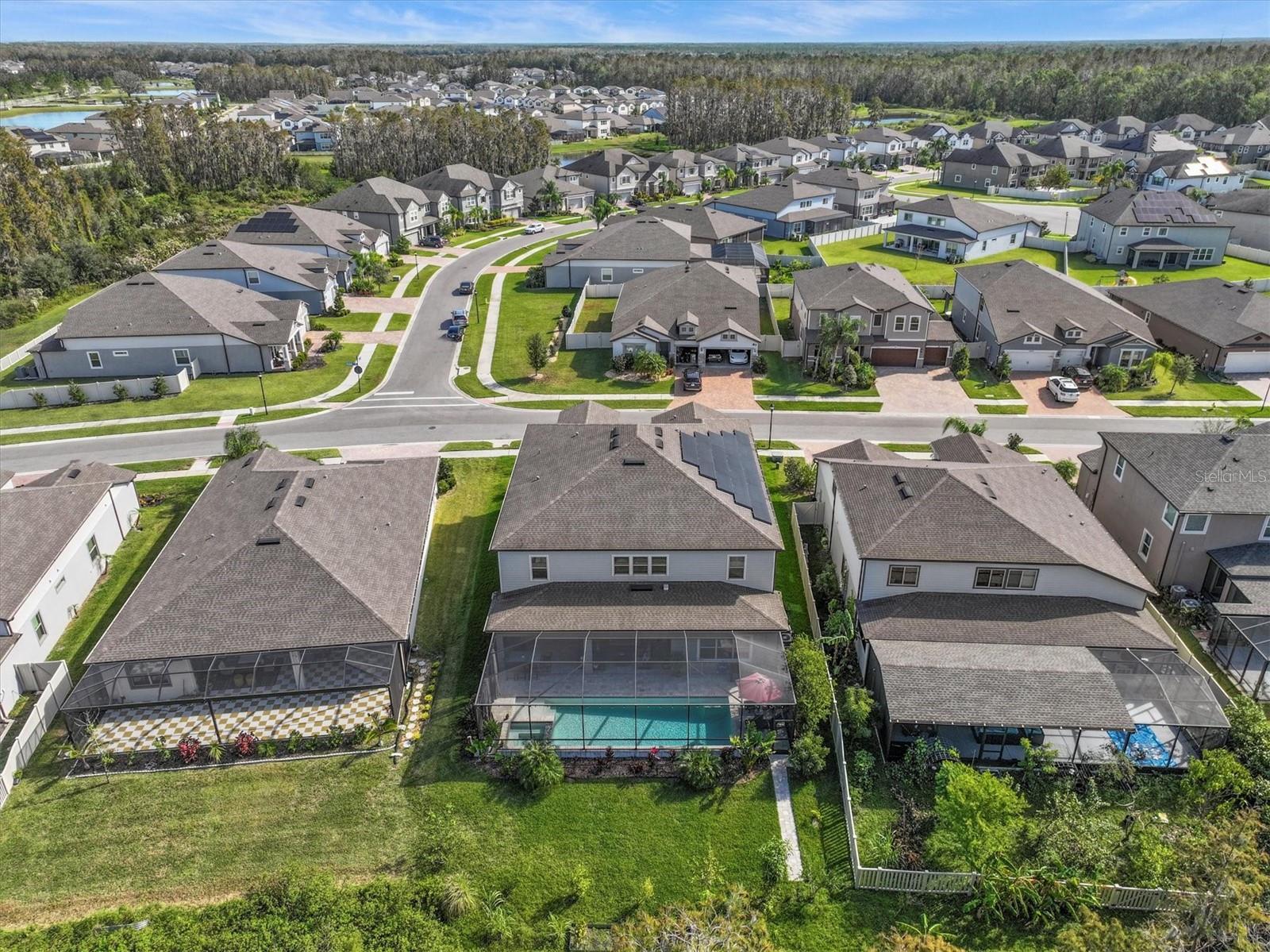 Welcome to your dream home in K-Bar Ranch of New Tampa! Built in 2020 by Pulte Homes, this one of a kind Casabella floor plan offers 6 beds, 4.5 baths, and a 3-car garage, all thoughtfully designed for modern living at over 5300sqft. This home is sure to wow with all of its added features! As you enter the foyer you’ll be greeted with ceilings at 10ft on the main floor and 9ft on the second, a flex room, powder room, and formal dining space. The luxury vinyl plank floors throughout the main floor create a cohesive and stylish look. The gourmet kitchen features quartz countertops, stainless steel appliances, spacious island seating, a cafe eating space, and the walk in pantry of your dreams! The electric fireplace really ties the living space together and can warm the room during the short Florida winters. Just outside your sliding glass doors is your brand new fully enclosed lanai, heated salt water pool and spa, and full outdoor kitchen overlooking conservation views for added privacy. A special highlight of this floor plan is the massive primary bedroom on the ground floor that features an en-suite bathroom with a walk-in shower, claw-foot tub, walk-in closet with built-ins and glass sliders that open to breathtaking views of the pool. Notice the NEW luxury vinyl plank floors and NEW stair lighting as you ascend to the second floor. The space opens up to a large loft, 5 additional bedrooms, 3 bathrooms, laundry room with utility sink, and an added Movie room! No wasted space in this home as you’ll notice the large bedrooms, walk in closets and additional hallway storage closets. The movie room is yours, featuring wood paneled walls, 5 reclining seats, and all media equipment! You’ll never have to leave! But if you must, you can grab your things from the mudroom and exit through the 3 car garage oversized garage. With epoxy flooring and additional space for storage or a golf cart. A step above the rest, this home is ready with features you won’t get from anything else on the market. Additional updates include paid off Tesla solar panels with power wall, water softener, water filtration system, in-wall pest control system and premium finishes throughout. Keep in mind that this impeccable home sustained zero damage from this hurricane season, and the power wall can power the entire home during power outages! This home combines luxury and practicality, making it the perfect place to create lasting memories. Schedule your showing today and experience the perfect blend of style, comfort, and nature! *** Buyer may be eligible for lender concession when working with preferred lender - inquire for details.** Located close to Top rated schools, Shopping centers, Wire Grass Mall, Tampa Premium Outlets, USF, Moffit Hospital, Restaurants, gym, I-75, I-275 & Much more. This neighborhood features a private community swimming pool, playground, tennis courts marked for pickleball, and walking trails. Don't miss your opportunity to buy this beautiful move-in-ready house.