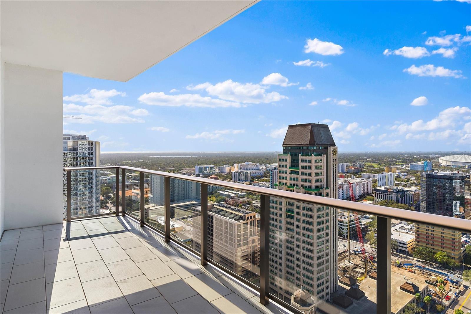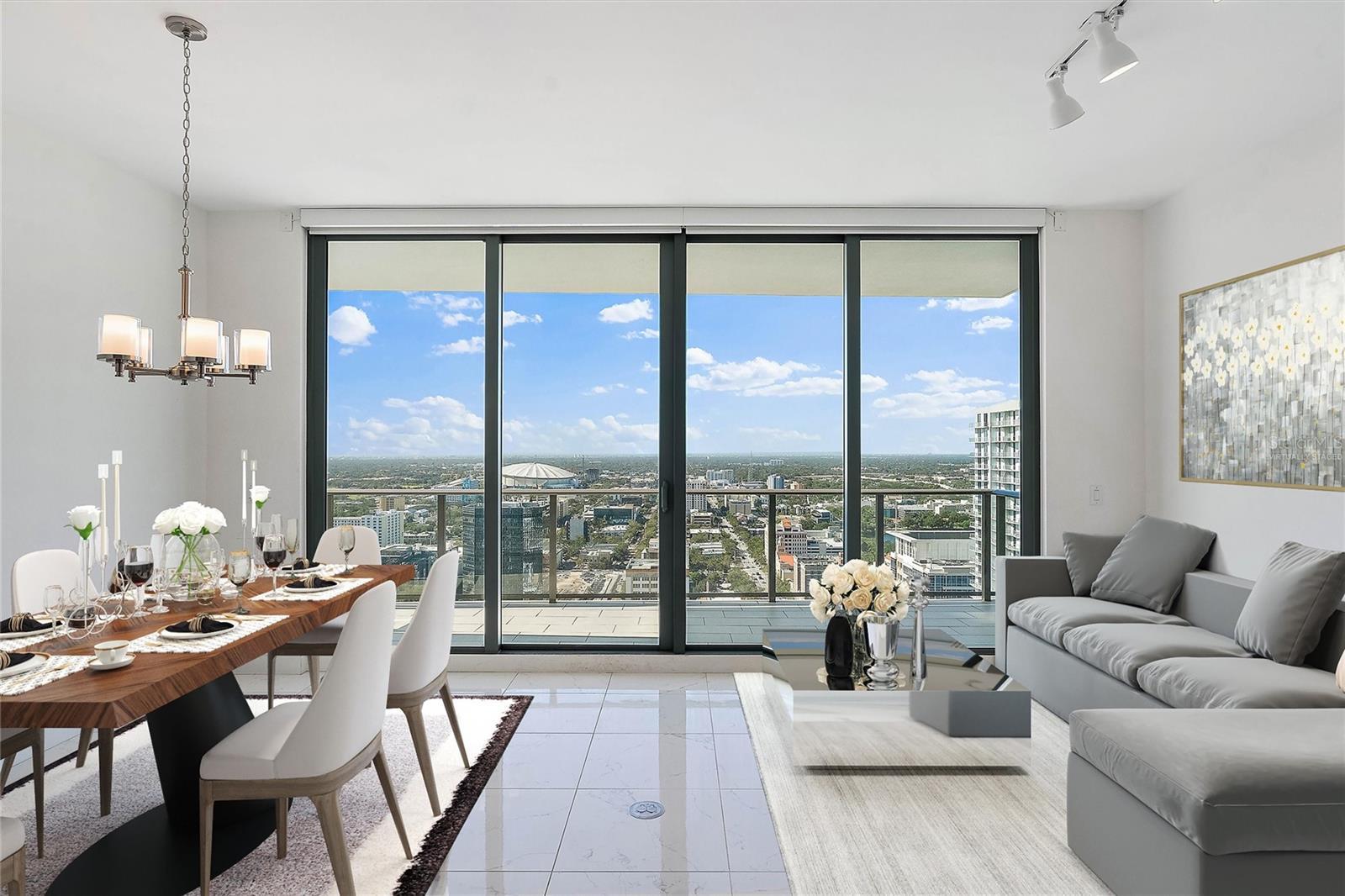 One or more photo(s) has been virtually staged. Live in prestige and style in this 2-bed, 2.5-bath luxury residence perched high in the sky with sprawling city and sunset views. Filled with fresh modern finishes throughout, this condo exudes the downtown vibes. Floor-to-ceiling windows light up the open living and dining space, perfect for entertaining guests. The spectacular city views don't stop there as both bedrooms feature west-facing walls of glass offering stunning vistas from every room. The owner's suite is generously sized and features a spacious walk-in closet & ensuite bath with dual vanities. The chef's kitchen is highlighted with premium stainless-steel Jenn-Air appliances including an induction cooktop. Your expansive private terrace provides a relaxing outdoor space to enjoy the beautiful weather while taking in the shimmering city lights at night and technicolor sunsets over the Gulf. Additional upgrades include porcelain tile flooring throughout and convenient electric blinds. As a resident of the affluent ONE St. Petersburg building, you will enjoy the finest amenities and a property management staff with 24-hr security that is second to none. Amenities include a Formal Social Room, Game Room, Club Room, and Library. The 40,000 SF resort-styled outdoor amenities deck includes a 75' lap pool, cabanas, spa, lush landscaping, outdoor kitchen, fire pits and abundant lounge seating. The 5,000 SF fitness & yoga center rivals the best gyms in the area. Located in the heart of downtown, you are only minutes away from an array of different cuisine options, world-renowned museums, bars & nightlife, sports arenas, waterfront parks, shopping, the New St. Pete Pier and more.