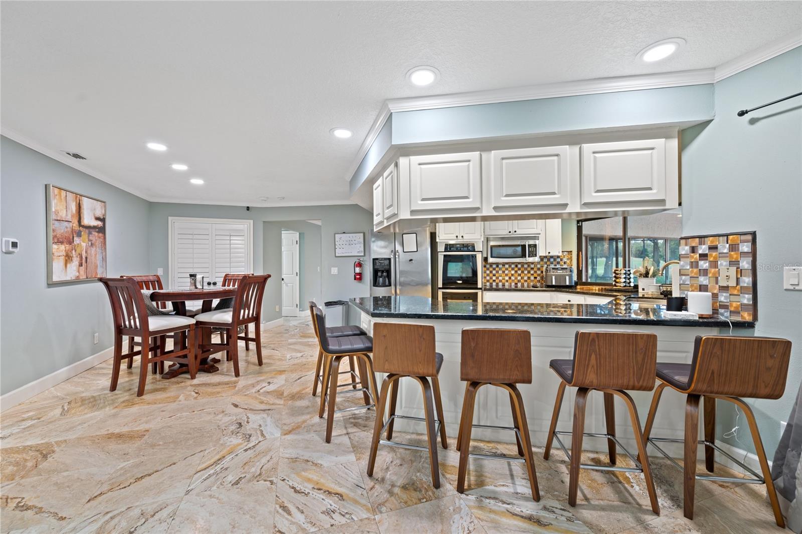 - Ceiling Fans(s), Crown Molding, Eat-in Kitchen, Kitchen/Family Room Combo, Living Room/Dining Room Combo, Open Floorplan, Primary Bedroom Main Floor, Solid Surface Counters, Split Bedroom, Walk-In Closet(s), Wet Bar, Window Treatments