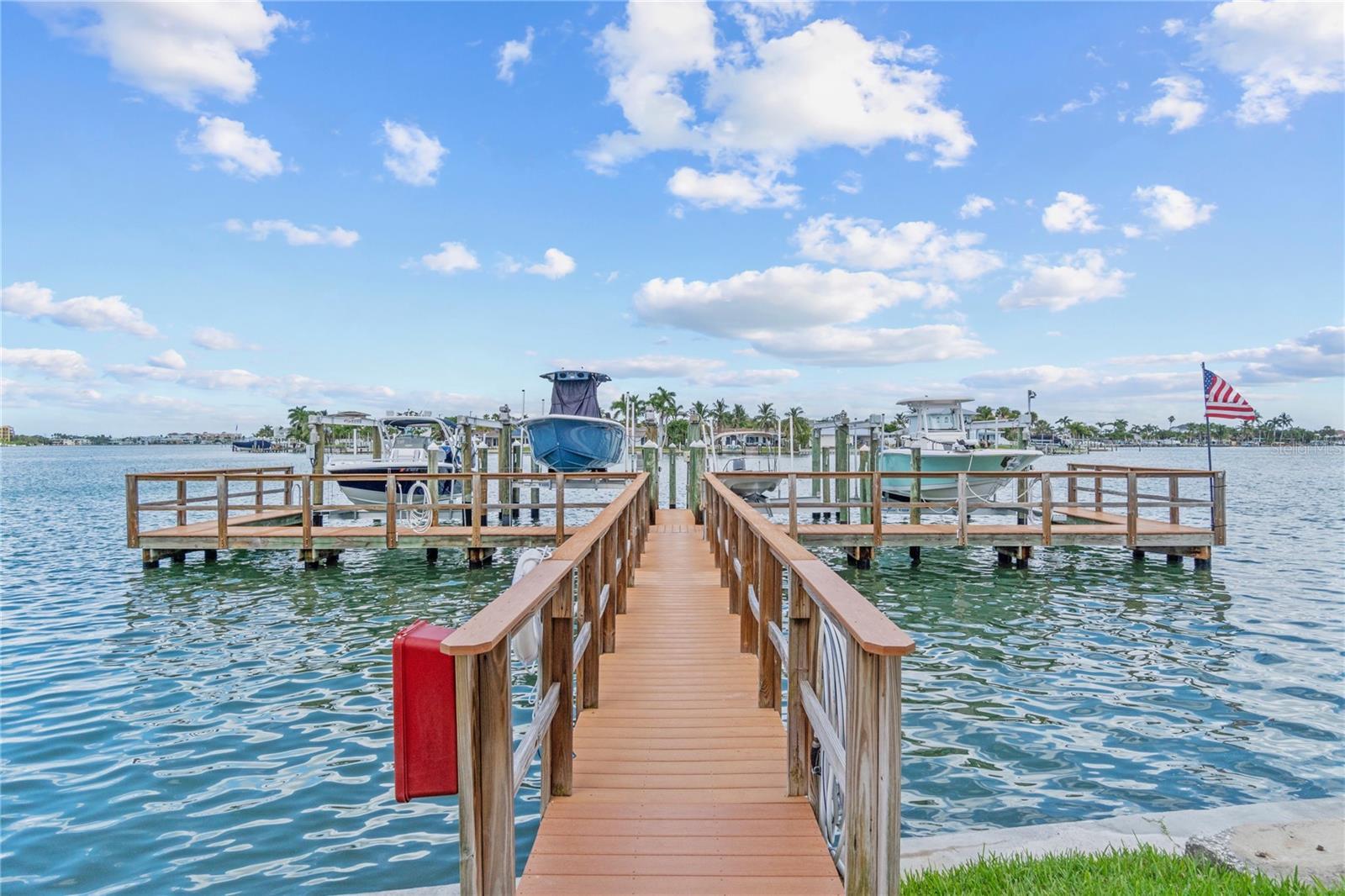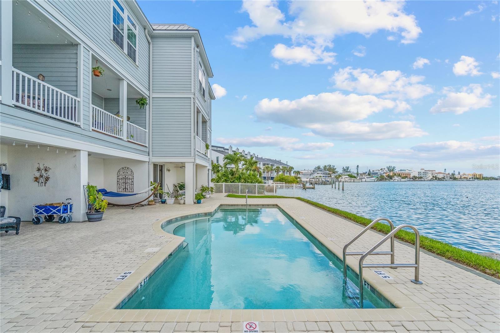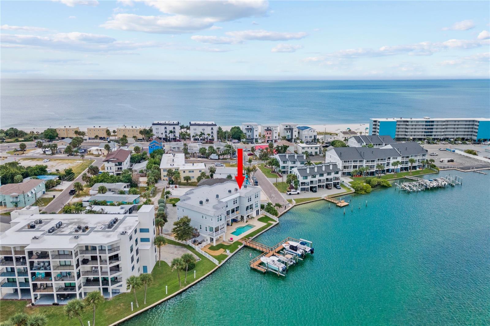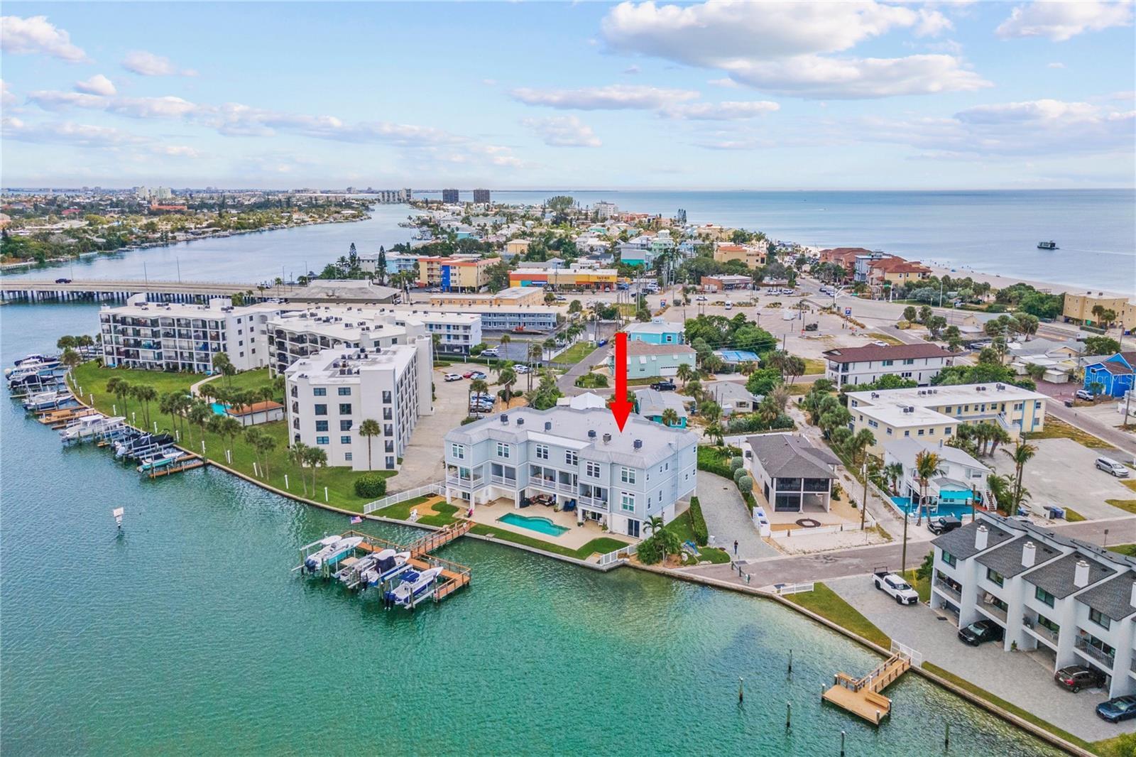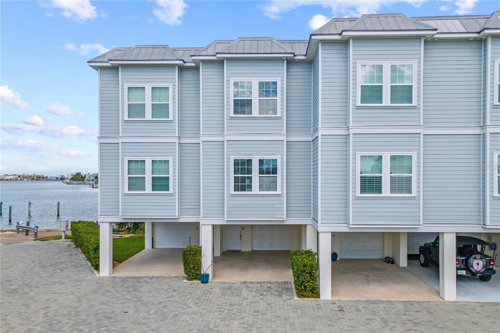 Charming waterfront townhome meets coastal serenity! Nestled at the peaceful end of a cul-de-sac on Treasure Island, this stunning residence at Bella Casa Townhomes captures the essence of sophisticated coastal living. One of only six exclusive units, this waterfront townhome offers beachy interiors, sweeping unobstructed views of Boca Ciega Bay, and the beach just a 5 minute stroll away. Situated directly on Devil’s Elbow Straight, a wide and picturesque stretch of Boca Ciega Bay, this home invites you to embrace life on the water. The community dock and seawall provide perfect spots for fishing or launching a paddle board, and a public boat launch is conveniently located just one block away (community slips can be rented or purchased from other owners when available). Inside, the home’s 10-foot ceilings and expansive windows showcase the beauty of the bay from every level. The kitchen is located on the second floor, where you’ll find granite countertops and painted cabinetry, complemented by stainless steel appliances. The host-friendly design flows effortlessly to the dining/ living area creating a seamless connection to the balcony. The 1st guest bedroom is also located on this level, adjacent to a full bathroom that can easily be enclosed for use as a guest or transient bath. On the 3rd floor, experience the most beautiful sunsets from the west-facing 2nd guest bedroom with double closets, ceiling fan and en-suite bathroom. Down the hall, the primary retreat offers tranquil water views, a spacious vanity with dual sinks, a spa-style soaking/jacuzzi tub, a separate shower, and a private commode room. Throughout the home, luxury vinyl plank flooring in the bedrooms, hallways, and stairs adds warmth and durability, while tile continues through all wet and living areas for easy maintenance. From your covered 2nd floor balcony, enjoy serene sunrises overlooking the water, or unwind in the evening with the colors of the sun setting over the gulf. Downstairs, the extended one-car garage, with direct interior access to the unit, has plenty of room for storage under the stairs. The garage can double as a cabana or entertainment space with its sliding doors leading out to the private covered patio with pavers just steps from the pool. Recent upgrades: New roof (2025), New hurricane-rated front door (2025), cleaned/re-grouted/resealed pavers (2025), new AC blower motor & UV light sanitizer system (2025), flooring on both staircases, updated guest bathrooms, upgraded fixtures throughout and new combo ventless washer/dryer. This property can be rented for three months or longer, making it an excellent choice for both investors and permanent residents seeking a refined coastal lifestyle. This community is also pet friendly so bring your furry friends! This home is perfectly positioned to offer both tranquility and convenience. It's within walking distance to the beach, grocery stores, pharmacies, beach bars, and some of Treasure Island’s finest waterfront restaurants. Also an easy 30-minute drive to Tampa International Airport, St. Pete–Clearwater International Airport, and the award-winning Fort De Soto Park. With panoramic bay views from every level, modern upgrades, and timeless coastal charm, this exceptional townhome is more than a residence - it’s a lifestyle defined by water, light, and ease. This home offers the very best of waterfront living on Florida’s Gulf coast - a true gem on an island full of treasures!