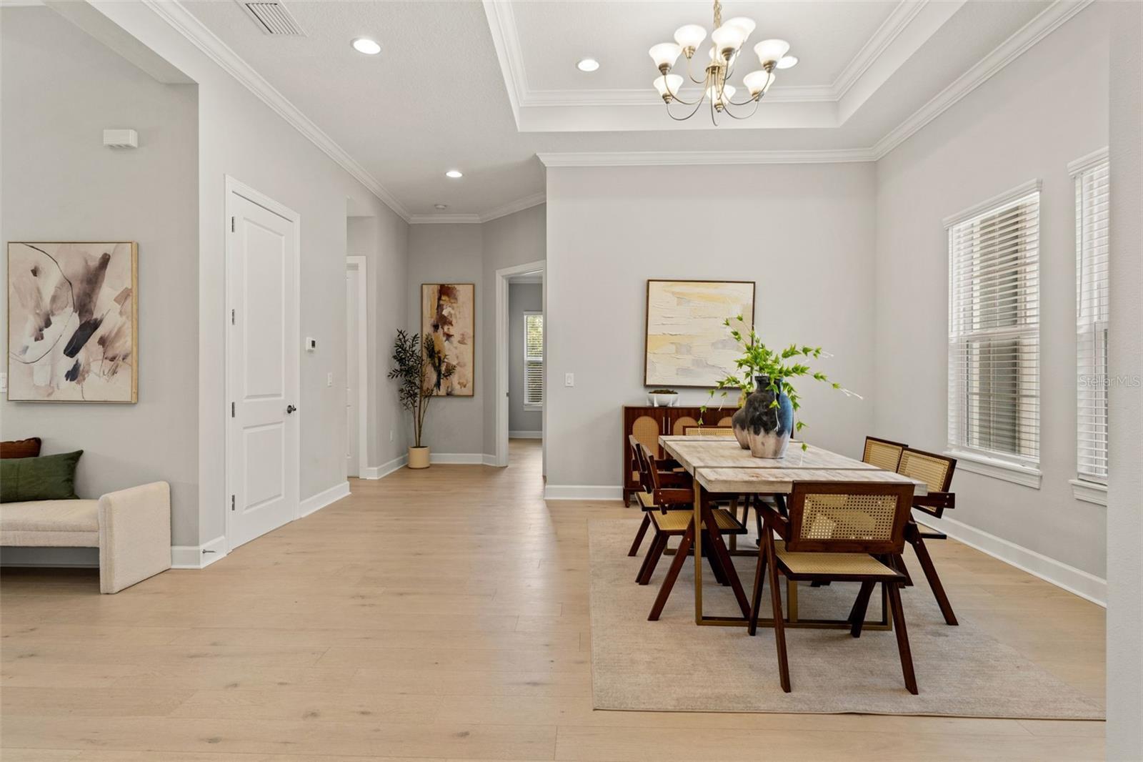 - Built-in Features, Ceiling Fans(s), Crown Molding, Eat-in Kitchen, High Ceilings, Kitchen/Family Room Combo, Living Room/Dining Room Combo, Open Floorplan, Primary Bedroom Main Floor, Smart Home, Solid Surface Counters, Solid Wood Cabinets, Split Bedroom, Thermostat, Tray Ceiling(s), Walk-In Closet(s), Window Treatments