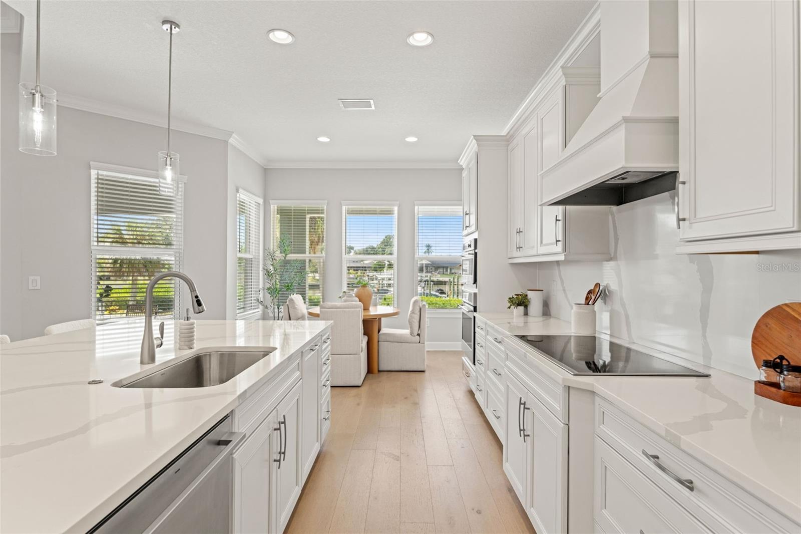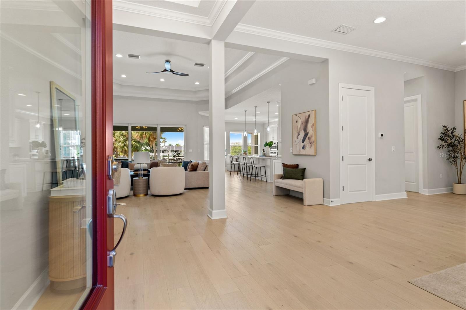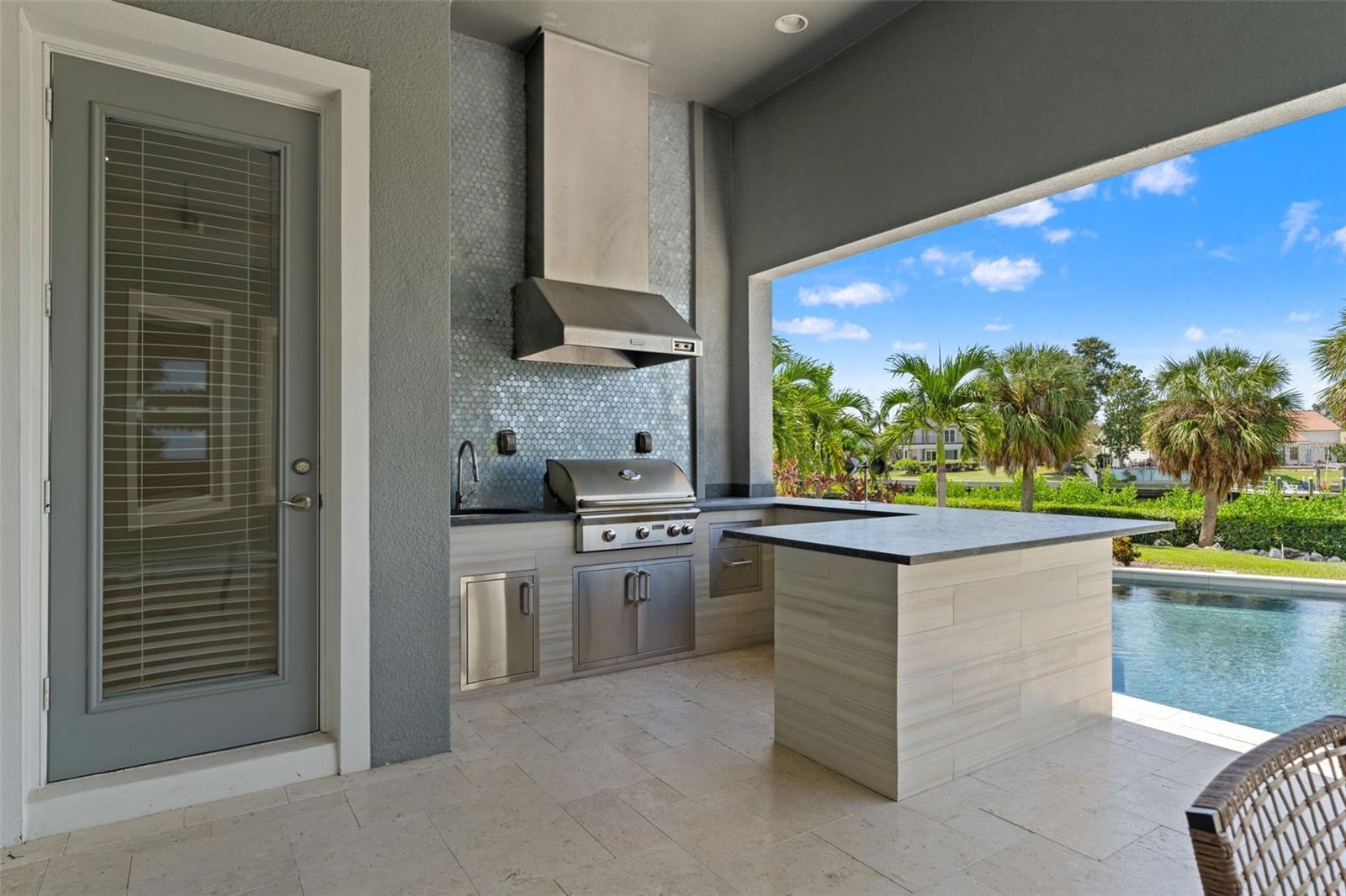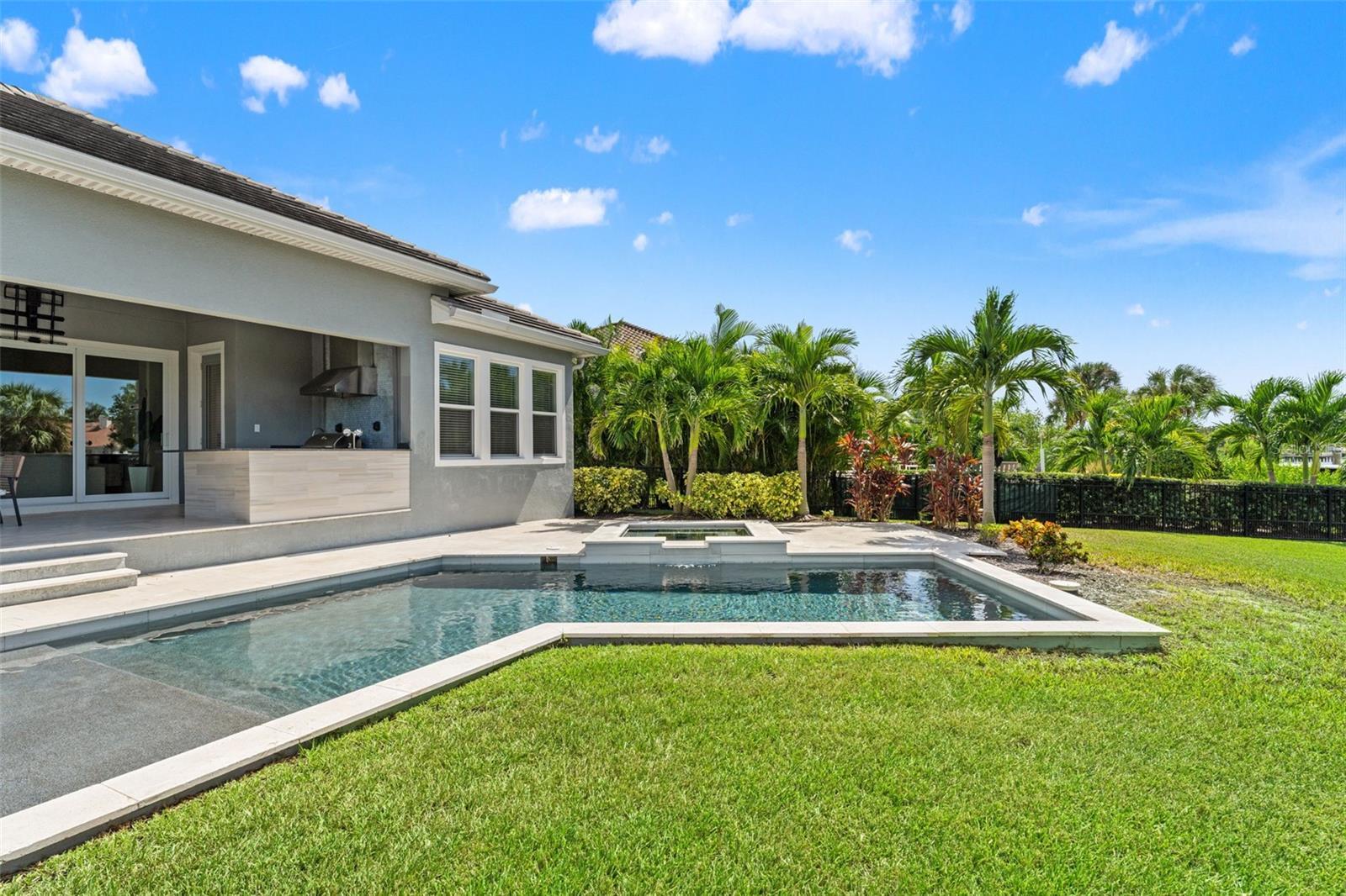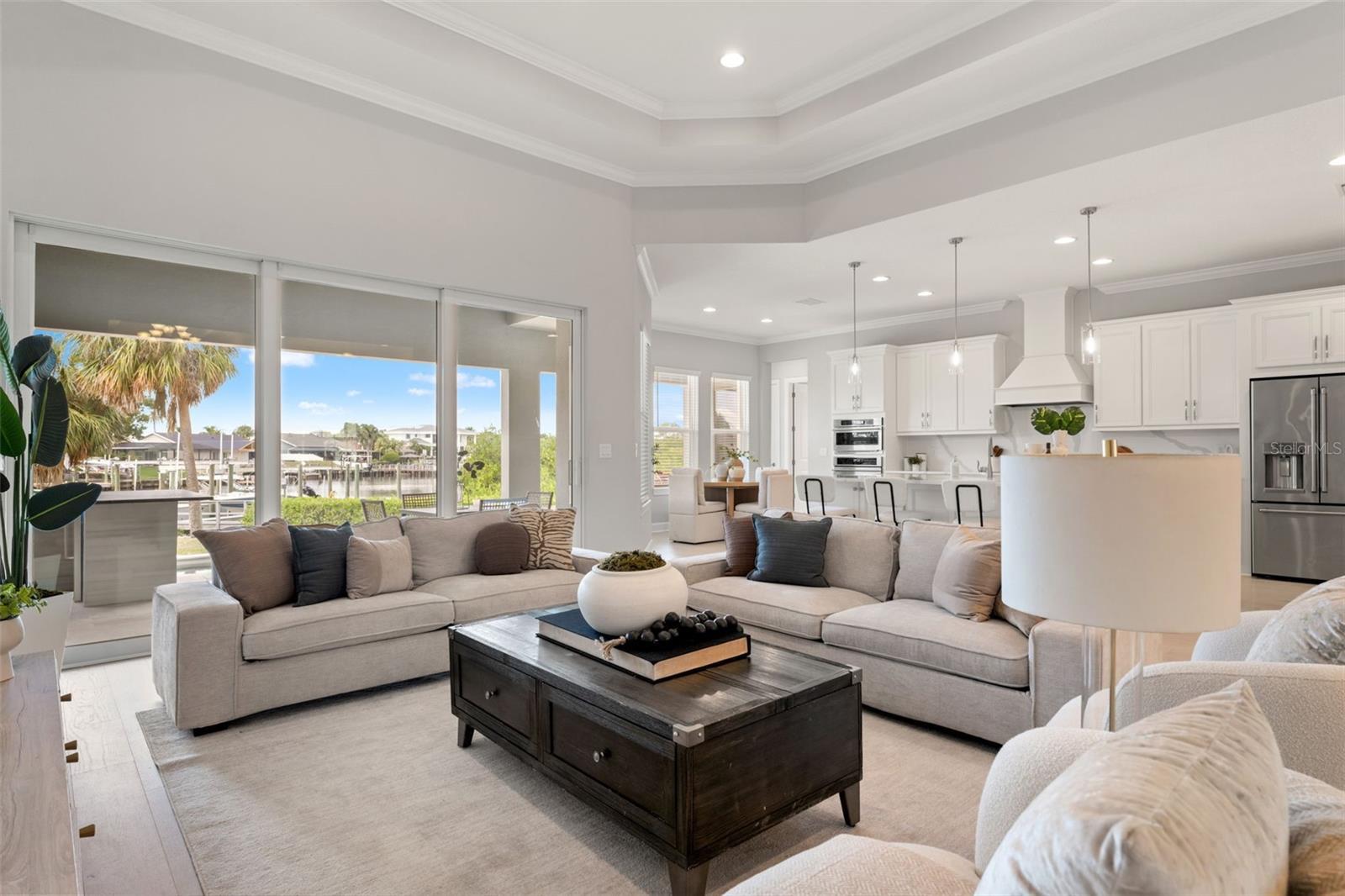 Experience the best of refined coastal living at 4148 Rocky Shores Drive, an exquisite one-story estate tucked within the exclusive gated community of The Cove at Rocky Shores. Perfectly positioned across from Rocky Point Golf Course, this home offers elegance, sophistication, and a lifestyle of peace, privacy, and recreation—all without the worry of flooding. Every detail of this four-bedroom plus office residence has been meticulously designed for luxury and functionality. From the moment you arrive, hurricane impact windows, solid-core 8-foot doors, tray ceilings, and extensive crown molding showcase exceptional craftsmanship. The open-concept layout is elevated by engineered hardwood floors and recessed lighting throughout, while the split floor plan ensures privacy for family and guests alike. One wing features spacious guest bedrooms with a Hollywood-style Jack and Jill bath—ideal for visitors or in-laws. The heart of the home is a true chef’s dream. The gourmet kitchen boasts quartz countertops, Monogram and Café appliances, and an impressive double microwave and convection wall oven setup. A butler’s pantry with built-in wine fridge adds extra prep and storage space, seamlessly connecting the kitchen to the dining and living areas. Expansive sliding glass doors open fully to create a stunning indoor-outdoor flow, leading to an outdoor living area designed for year-round enjoyment. The custom outdoor kitchen features Fire Magic professional-grade appliances, a propane grill, sink, and refrigerator—perfect for al fresco dining and entertaining. Overlooking the water, the heated saltwater pool and spa invite relaxation, complete with a sun shelf and dedicated pool bath for convenience. The expansive backyard provides panoramic water views and lush, low-maintenance landscaping, while the covered patio areas offer shaded comfort under the Florida sun. The primary suite is a serene retreat featuring a spacious sitting area, massive walk-in shower, and built-in Jacuzzi tub for a true spa-like experience. Ample storage and thoughtful design touches are found throughout the home, blending comfort and sophistication. The three-car garage is equally impressive, with epoxy flooring, flood vents, and a Tesla charging station—marrying practicality with style. For boating enthusiasts, an approved dock permit is included, offering a future opportunity for direct water access. 4148 Rocky Shores Drive combines modern amenities, architectural beauty, and timeless comfort. With its ideal location, luxury finishes, and meticulous attention to detail, this home offers a rare opportunity to live the quintessential Tampa Bay lifestyle—refined, relaxed, and unforgettable.