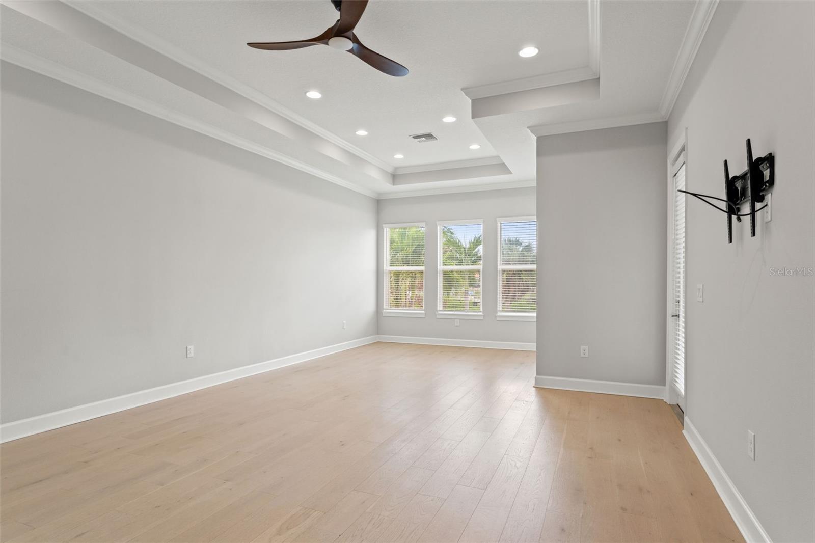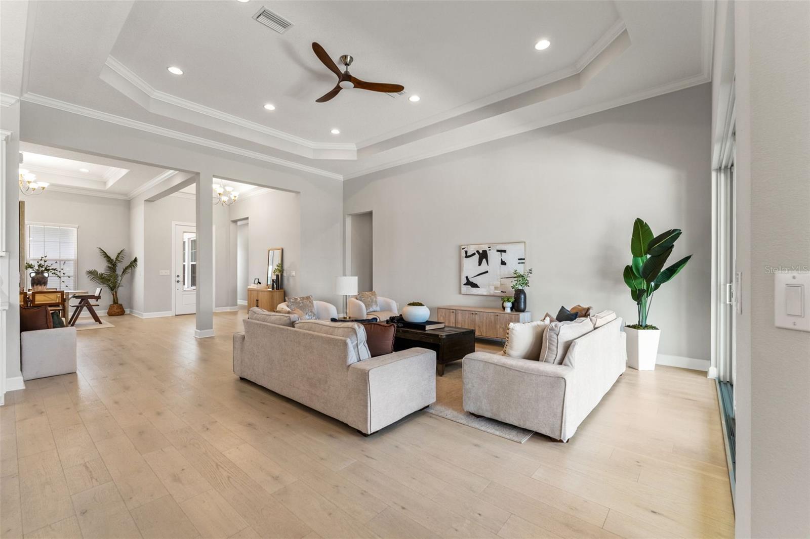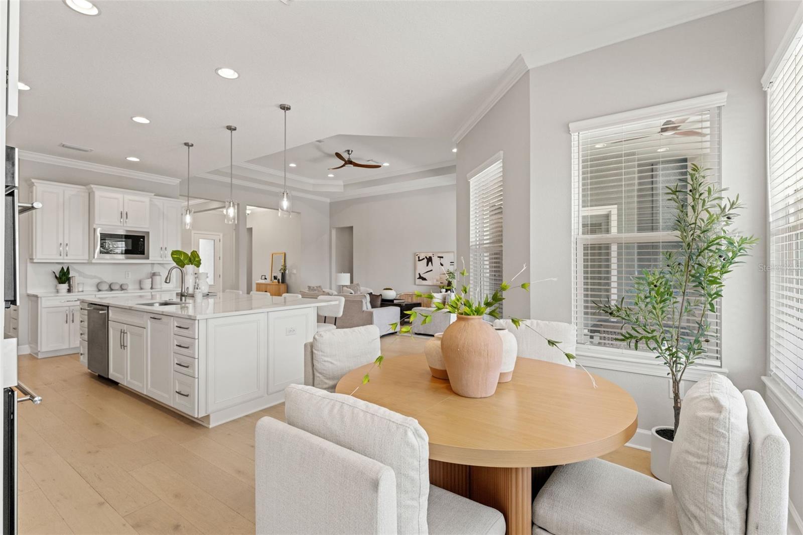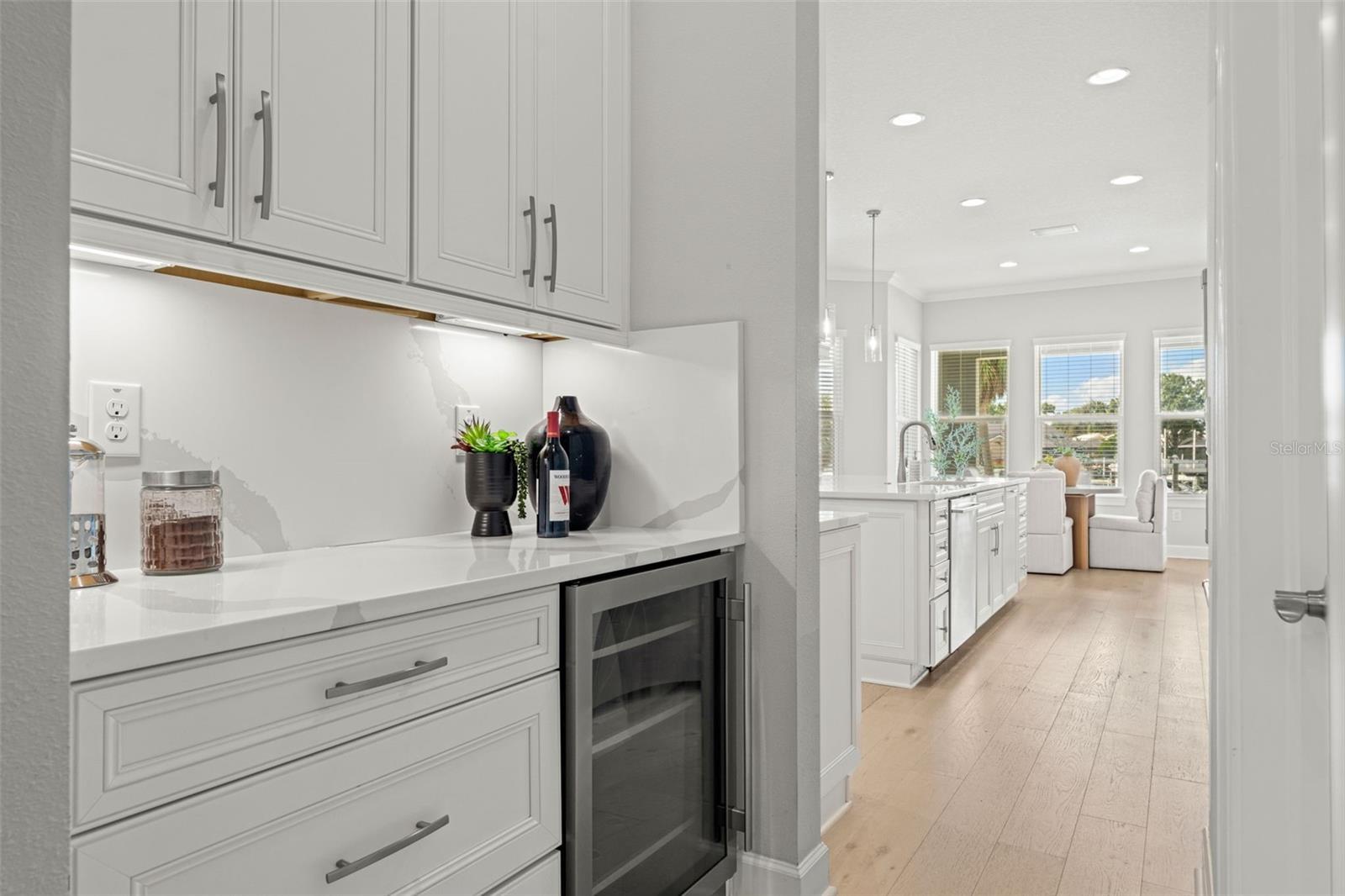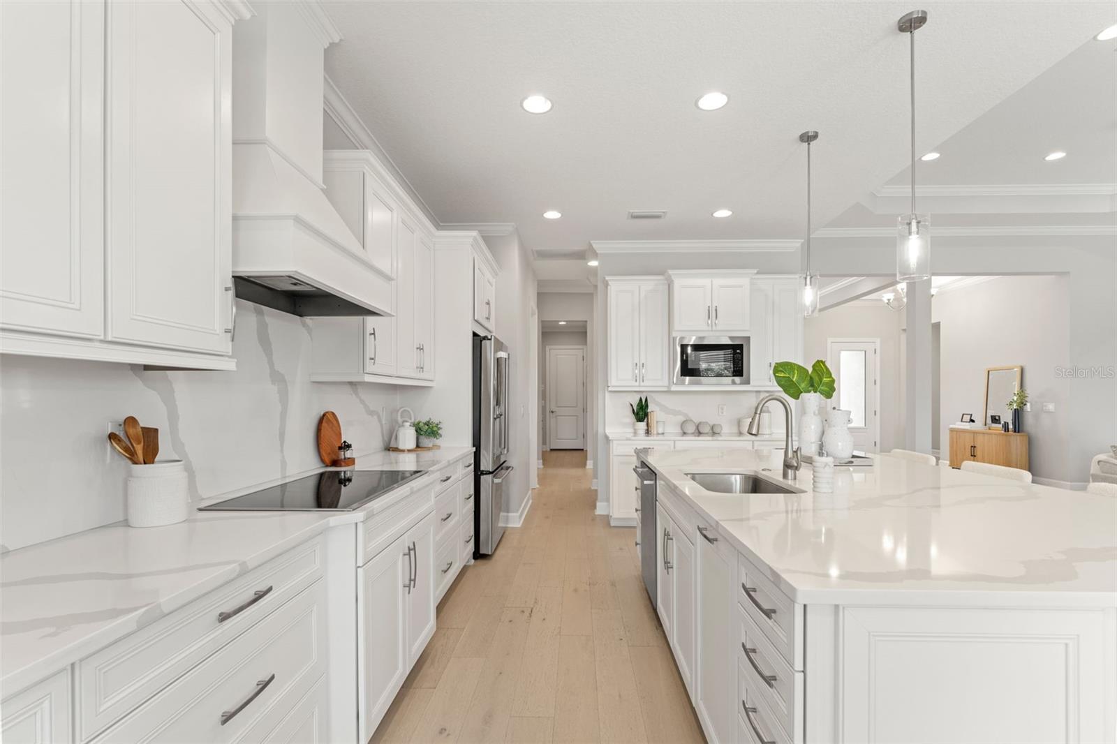 Experience the best of refined coastal living at 4148 Rocky Shores Drive, an exquisite one-story estate tucked within the exclusive gated community of The Cove at Rocky Shores. Perfectly positioned across from Rocky Point Golf Course, this home offers elegance, sophistication, and a lifestyle of peace, privacy, and recreation—all without the worry of flooding. Every detail of this four-bedroom plus office residence has been meticulously designed for luxury and functionality. From the moment you arrive, hurricane impact windows, solid-core 8-foot doors, tray ceilings, and extensive crown molding showcase exceptional craftsmanship. The open-concept layout is elevated by engineered hardwood floors and recessed lighting throughout, while the split floor plan ensures privacy for family and guests alike. One wing features spacious guest bedrooms with a Hollywood-style Jack and Jill bath—ideal for visitors or in-laws. The heart of the home is a true chef’s dream. The gourmet kitchen boasts quartz countertops, Monogram and Café appliances, and an impressive double microwave and convection wall oven setup. A butler’s pantry with built-in wine fridge adds extra prep and storage space, seamlessly connecting the kitchen to the dining and living areas. Expansive sliding glass doors open fully to create a stunning indoor-outdoor flow, leading to an outdoor living area designed for year-round enjoyment. The custom outdoor kitchen features Fire Magic professional-grade appliances, a propane grill, sink, and refrigerator—perfect for al fresco dining and entertaining. Overlooking the water, the heated saltwater pool and spa invite relaxation, complete with a sun shelf and dedicated pool bath for convenience. The expansive backyard provides panoramic water views and lush, low-maintenance landscaping, while the covered patio areas offer shaded comfort under the Florida sun. The primary suite is a serene retreat featuring a spacious sitting area, massive walk-in shower, and built-in Jacuzzi tub for a true spa-like experience. Ample storage and thoughtful design touches are found throughout the home, blending comfort and sophistication. The three-car garage is equally impressive, with epoxy flooring, flood vents, and a Tesla charging station—marrying practicality with style. For boating enthusiasts, an approved dock permit is included, offering a future opportunity for direct water access. 4148 Rocky Shores Drive combines modern amenities, architectural beauty, and timeless comfort. With its ideal location, luxury finishes, and meticulous attention to detail, this home offers a rare opportunity to live the quintessential Tampa Bay lifestyle—refined, relaxed, and unforgettable.