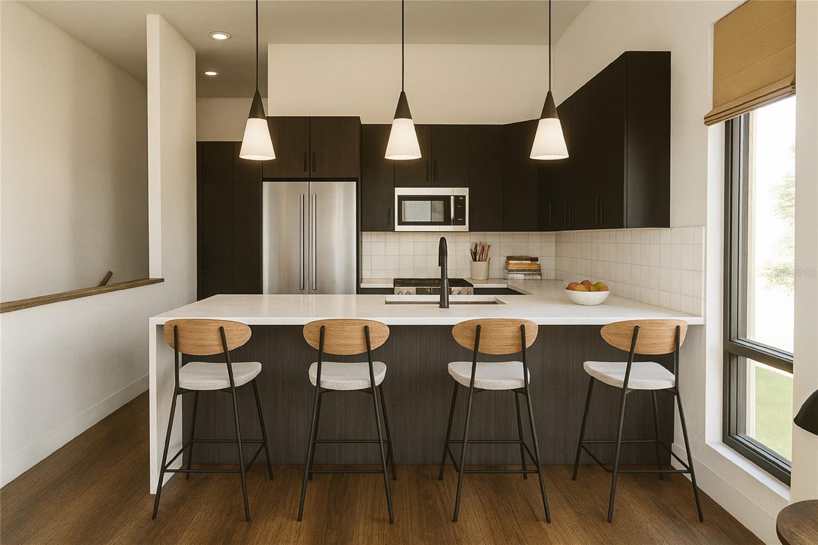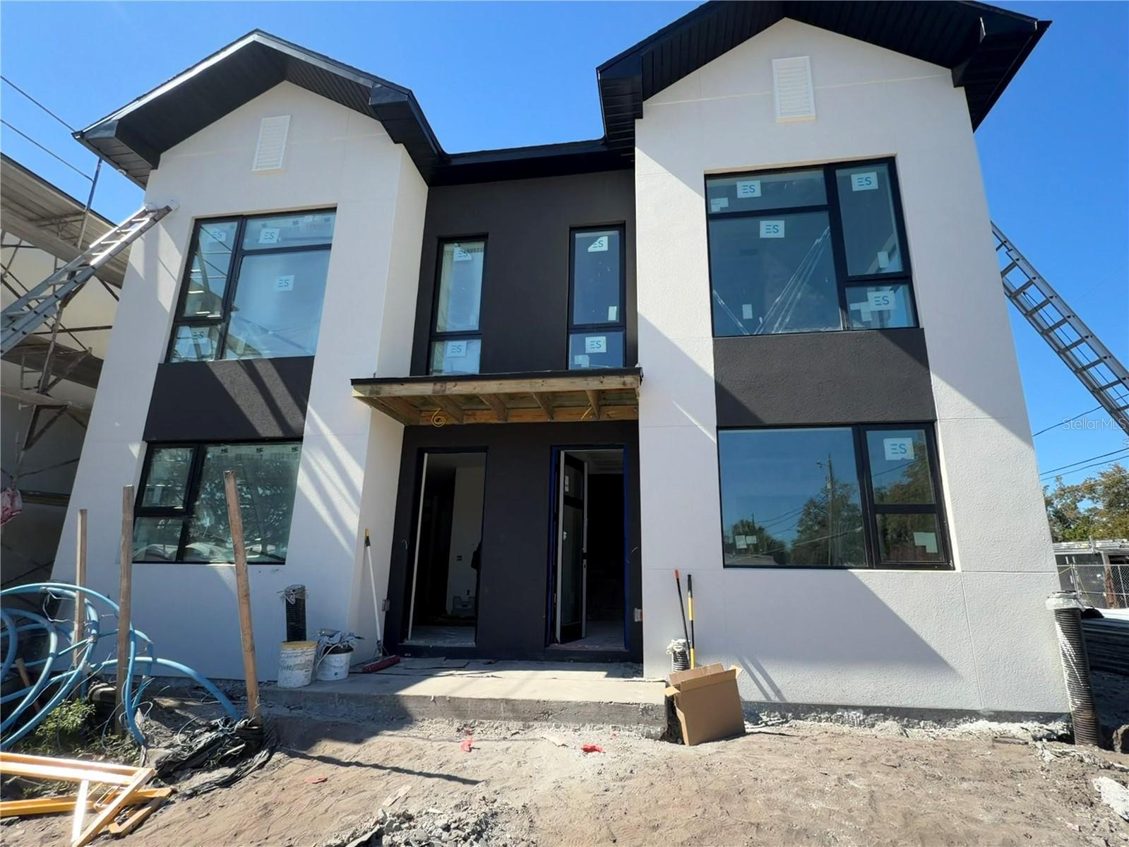 Under Construction. Est completion APRIL 2026. Welcome to Junction Townhomes, where elevated design, exceptional volume, and superior construction set a new standard for modern townhome living in the heart of Central Oak, St. Pete. A thoughtfully elevated approach to new construction—every element has been intentionally designed for comfort, function and refined contemporary style. This two-story three-bedroom residence offers open, light-filled interiors with 9’3” ceilings on the main level and dramatic 11’7” ceilings on the second floor, creating a sense of scale rarely found in townhome living. Oversized ES aluminum impact-rated windows and an 8’ WinDoor front entry with Schlage keyless access flood the home with natural light while providing durability, security, and efficiency. The striking Metropolitan Essence design scheme balances bold elegance and refined simplicity with deep blacks, soft greys, and clean architectural lines. The Skyview layout welcomes you on the first level with a spacious bonus living room, guest bath, laundry, and two bedrooms—ideal for flexible living or work-from-home space. Upstairs, the main living area unfolds into a generous 26’ x 16’ great room, perfect for relaxed living and stylish entertaining. The custom-designed kitchen features sleek European-inspired cabinetry, 3 cm quartz countertops, stainless steel appliances, matte black Delta faucet, Tob Knobs cabinet hardware, and curated Kichler lighting for a polished, high-end finish. The primary suite is a true retreat with a walk-in closet and spa-inspired en-suite bath featuring porcelain tile, quartz countertops, double undermount sinks, a custom tile shower surround, 3/8” frameless glass enclosure, and Kohler framed mirrors. Built with an interior upgraded insulation package, these homes offer enhanced comfort and sound attenuation. Each three-bedroom home includes a private patio and one assigned parking space. Nestled among brick-lined streets, historic Craftsman homes, and mature oak trees, Junction Townhomes are ideally located along the SunRunner rapid transit line with easy access to downtown St. Petersburg and the beach. Block construction on both levels, impact-rated windows and doors, and a NON-FLOOD zone location provide peace of mind and long-term durability. Schedule your showing today!