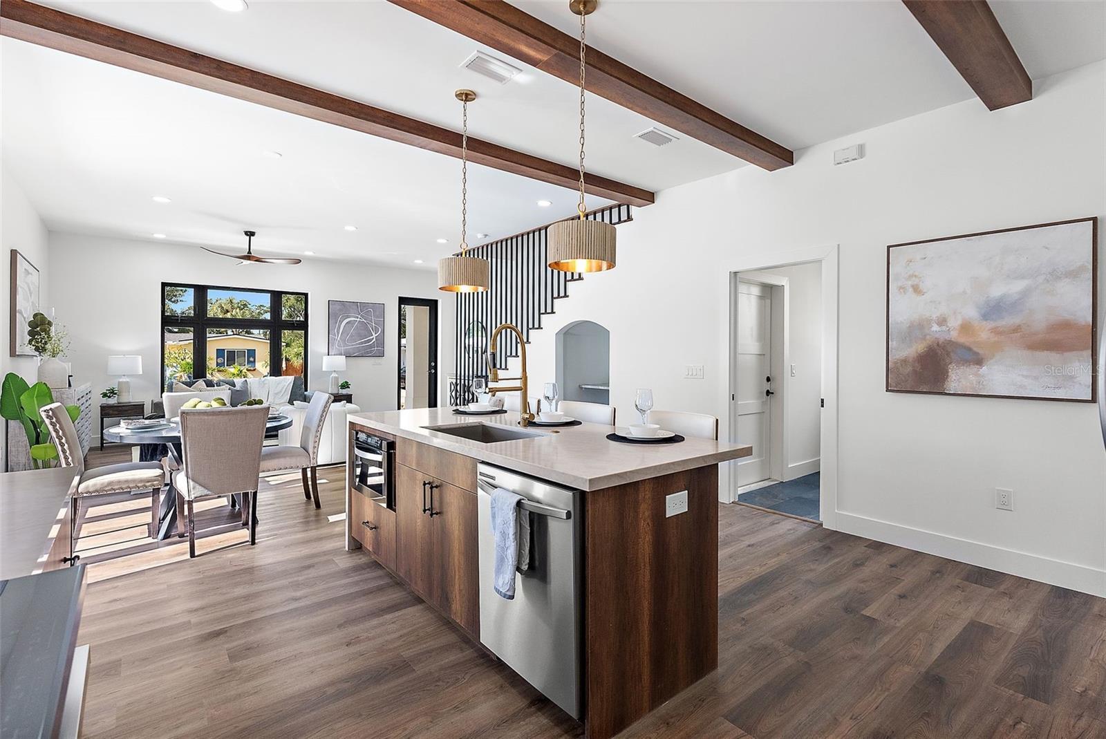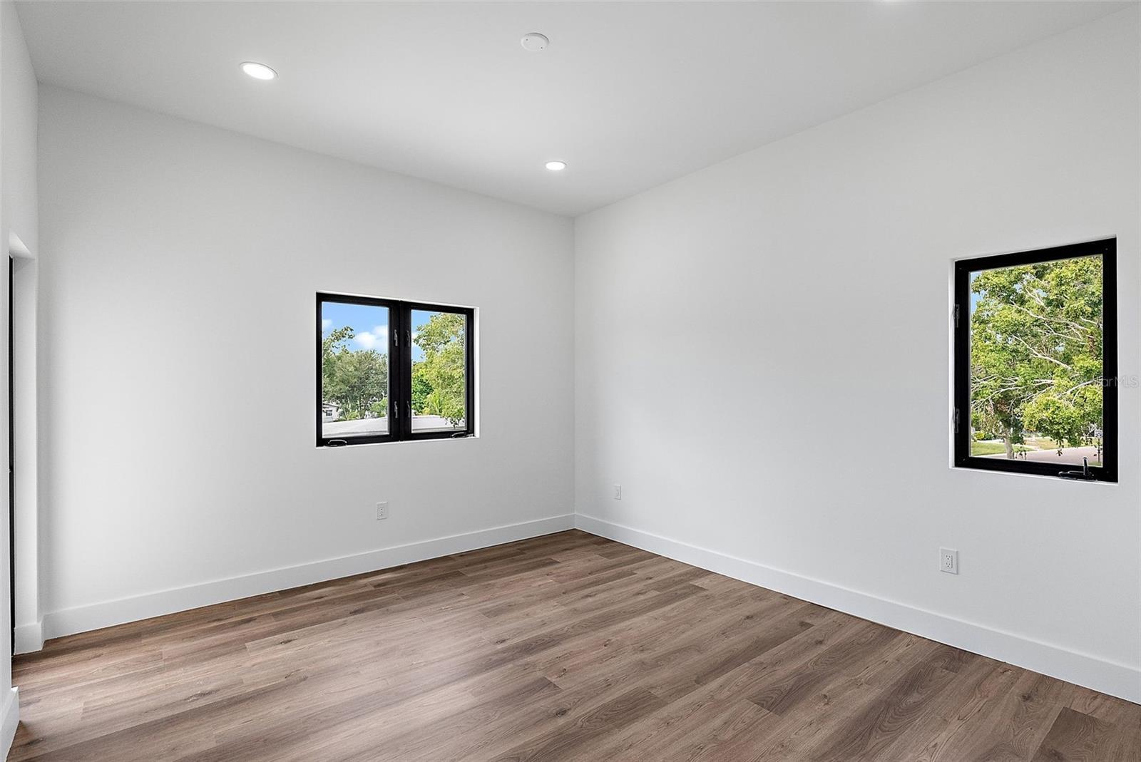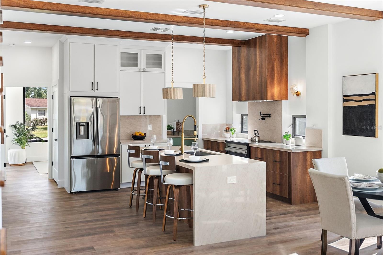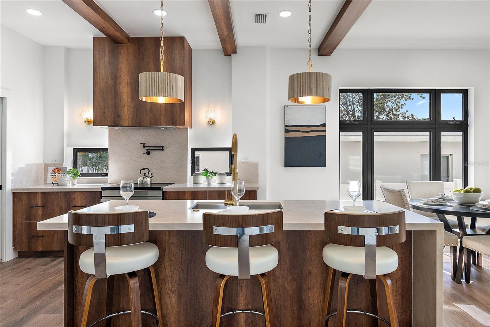 Builder offering $20,000 credit at closing toward rate buy-down and/or closing costs (call for details). Step into modern coastal luxury in this brand-new, all-concrete block 4-bedroom, 3.5-bath home on a corner lot, thoughtfully designed and elevated for peace of mind. High-end finishes and exceptional craftsmanship are showcased throughout, including black-framed hurricane-impact windows and doors, luxury vinyl plank flooring, recessed LED lighting, and upgraded 8-foot doors on both levels, creating a bright and sophisticated atmosphere. The open-concept living area centers around a showstopping designer kitchen featuring waterfall-edge quartz countertops with breakfast bar seating, custom wood cabinetry, stainless steel appliances, pot filler faucet, exposed wood beam accents, and statement lighting. A separate prep kitchen adds valuable storage and workspace—ideal for entertaining or everyday convenience. The primary suite is a true retreat, offering a spacious layout, private walk-out covered balcony, large walk-in closet with built-in storage, and a spa-inspired bath with freestanding soaking tub, beautifully tiled walk-in shower with gold fixtures, and a custom dual-sink vanity. Three of the four bedrooms include walk-in closets, and each bathroom features high-end tile work and designer finishes. Additional highlights include an interior laundry room with custom tile accent wall, covered front porch, upstairs balcony with pergola roof, irrigated landscaping, one-car garage, and a large side yard—perfect for pets or outdoor living. The home is backed by a comprehensive 1-2-10 year builder warranty for added peace of mind. Ideally located in North St. Petersburg, close to retail corridors, parks, golf courses, area beaches, and Tampa International Airport, this exceptional new construction home perfectly combines style, quality, and modern comfort.