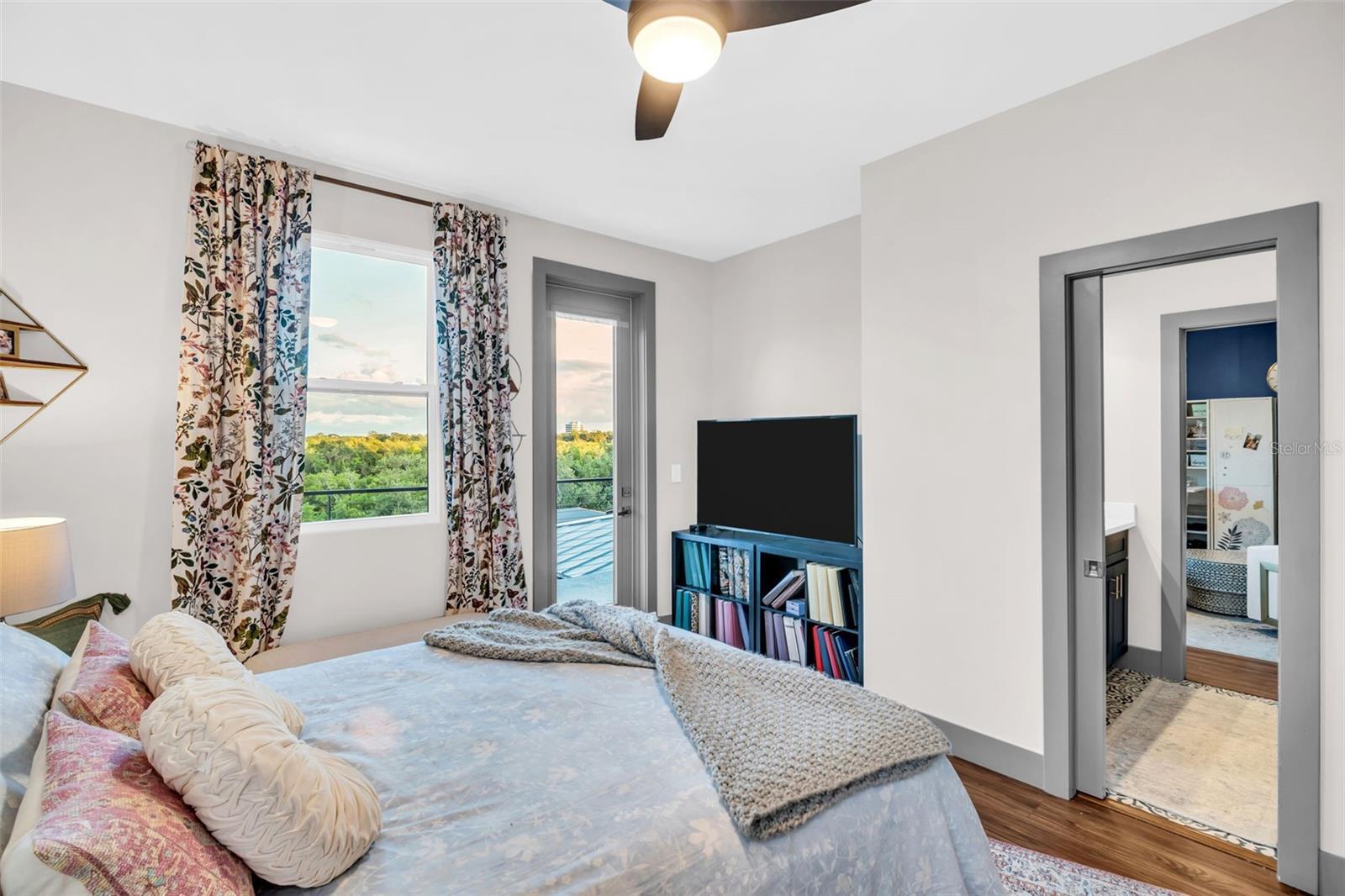 - Ceiling Fans(s), Eat-in Kitchen, Elevator, High Ceilings, Kitchen/Family Room Combo, Open Floorplan, Primary Bedroom Main Floor, Solid Surface Counters, Solid Wood Cabinets, Split Bedroom, Thermostat, Walk-In Closet(s), Wet Bar