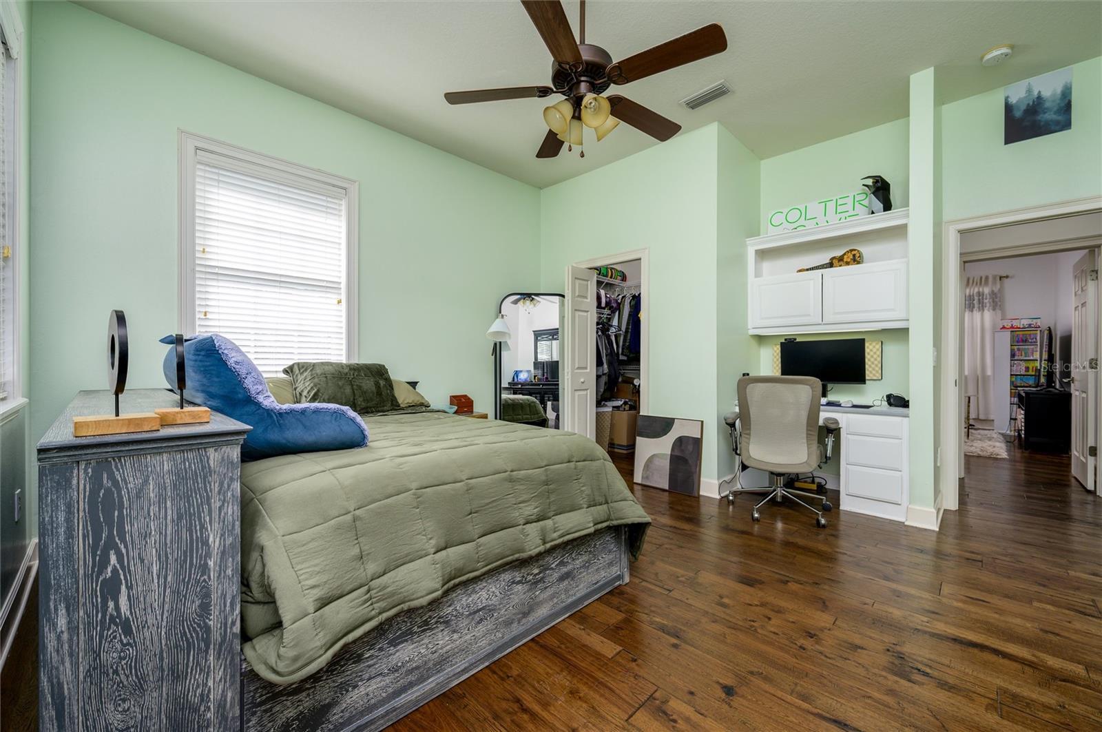 - Ceiling Fans(s), Crown Molding, Eat-in Kitchen, High Ceilings, Kitchen/Family Room Combo, Primary Bedroom Main Floor, Solid Surface Counters, Solid Wood Cabinets, Thermostat, Walk-In Closet(s)