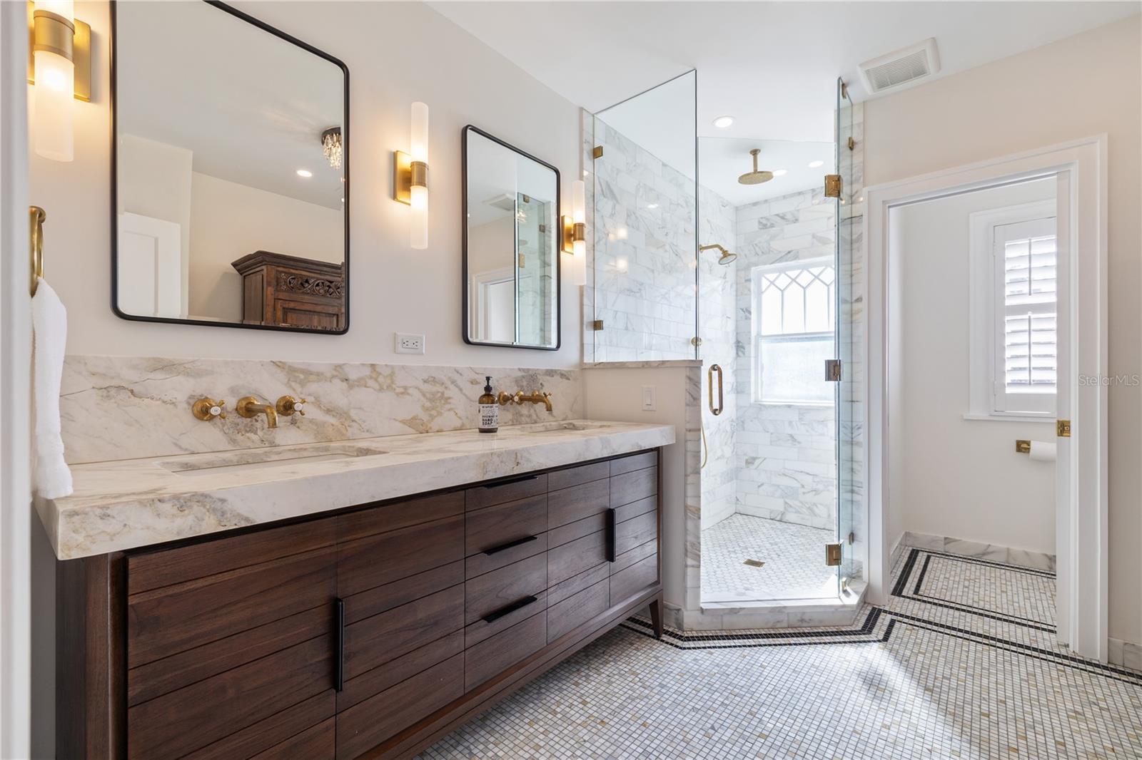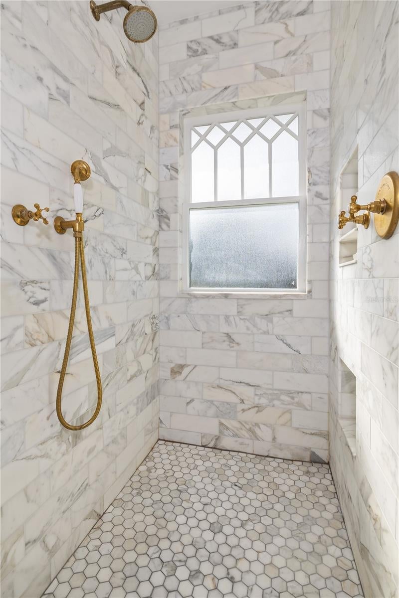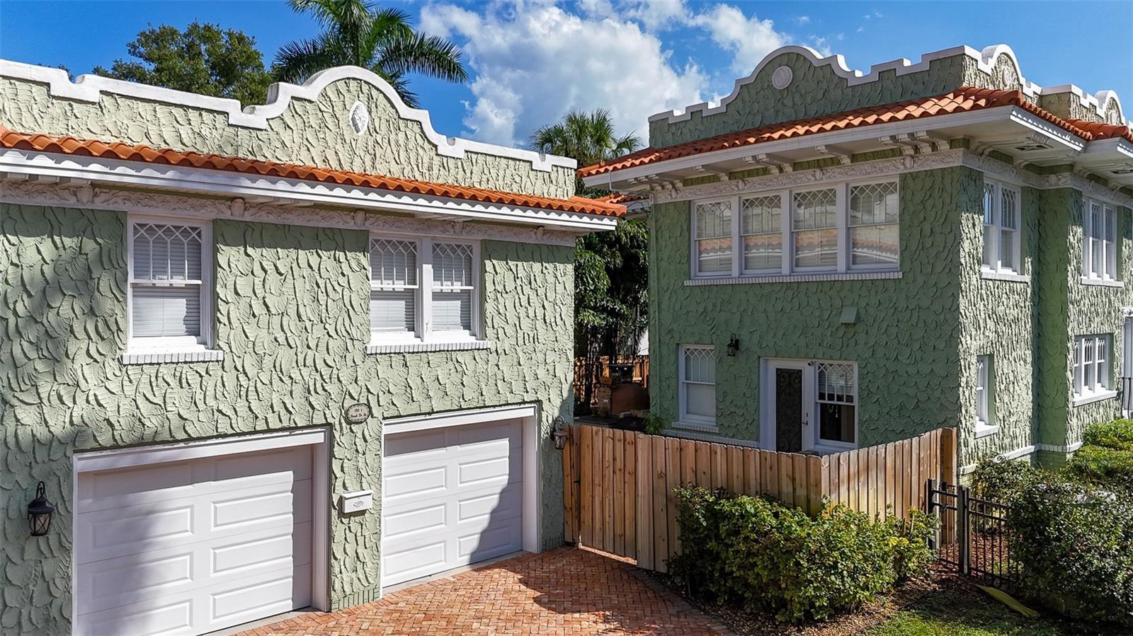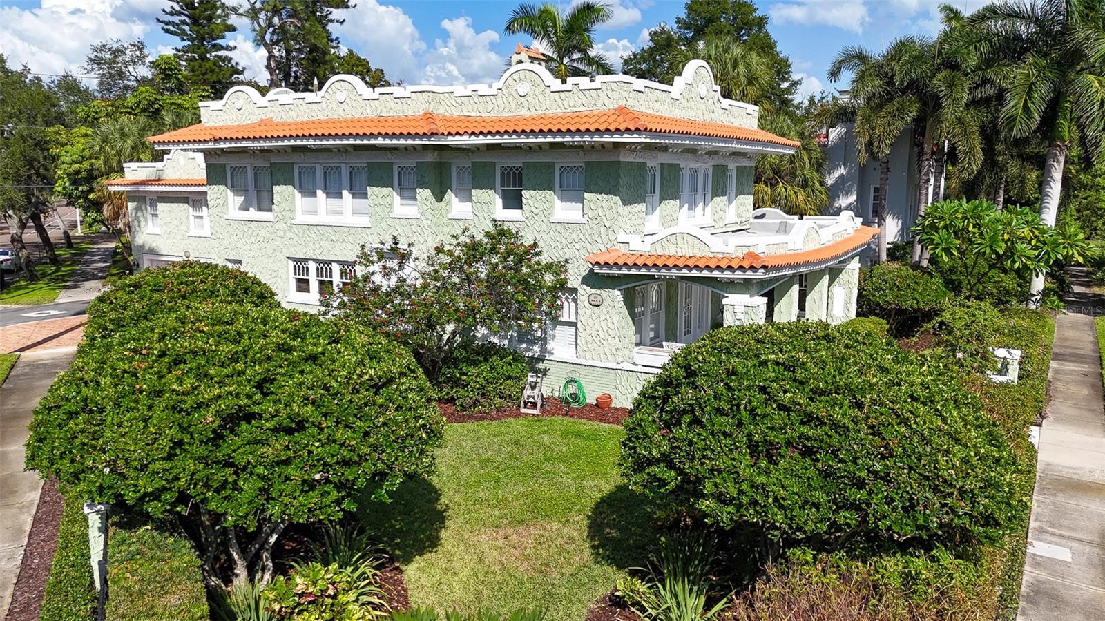 Known locally as The Cake House, this timeless Mediterranean masterpiece is one of Old Northeast’s iconic historic residences, a century-old architectural gem originally designed by the same architect behind Dunedin’s famed Fenway Hotel. On a prized corner lot along picturesque Beach Drive, the home blends Havana-inspired design and 1920s craftsmanship with thoughtful modern luxury updates throughout. Showcasing original interior and exterior brick, refinished hardwood floors, detailed millwork and a distinctive pagoda-style roofline, the property radiates warmth, history and sophistication. Inside, a light-filled tranquil sunroom opens to flexible dining and living areas pre-wired for audio/visual, ideal for entertaining. The main level includes a formal dining room, and a full butler’s pantry with bar functionality off the chef’s updated kitchen, featuring a movable island and period details that honor the home’s heritage. The enclosed laundry room includes a washer and dryer, with an adjacent mudroom and indoor tankless water heater. The luxurious primary suite is a sanctuary of elegance, complete with crown molding, a California closet system, dual vanities, and an oversized walk-in shower clad in Calacatta marble with opulent fixtures and abundant natural light. Guest accommodations are equally inviting, with spacious bedrooms, dual closets, and beautifully updated baths that harmonize with the home’s character. Outdoor living is elevated with a private Mediterranean-style courtyard featuring a custom wood-fired kitchen, gazebo dining pavilion and restored original deck pillars surrounded by lush new landscaping. Every detail invites relaxation and connection. Additional highlights include updated electrical and copper plumbing, new under-home ductwork (2024), a newly installed CPVC water main to the street and ongoing air conditioner maintenance for peace of mind. The detached two-car garage accompanies a fully equipped one-bedroom, one-bath ADU with kitchen, washer/dryer, and private entry, ideal for guests, extended family or income opportunity. Set on a 7,920-square-foot lot in one of St. Petersburg’s celebrated neighborhoods, 1311 Beach Drive NE is a rare blend of architectural authenticity and modern livability. Every improvement has been permitted, curated and meticulously maintained, offering a once-in-a-generation opportunity to own one of Old Northeast’s beloved landmarks.