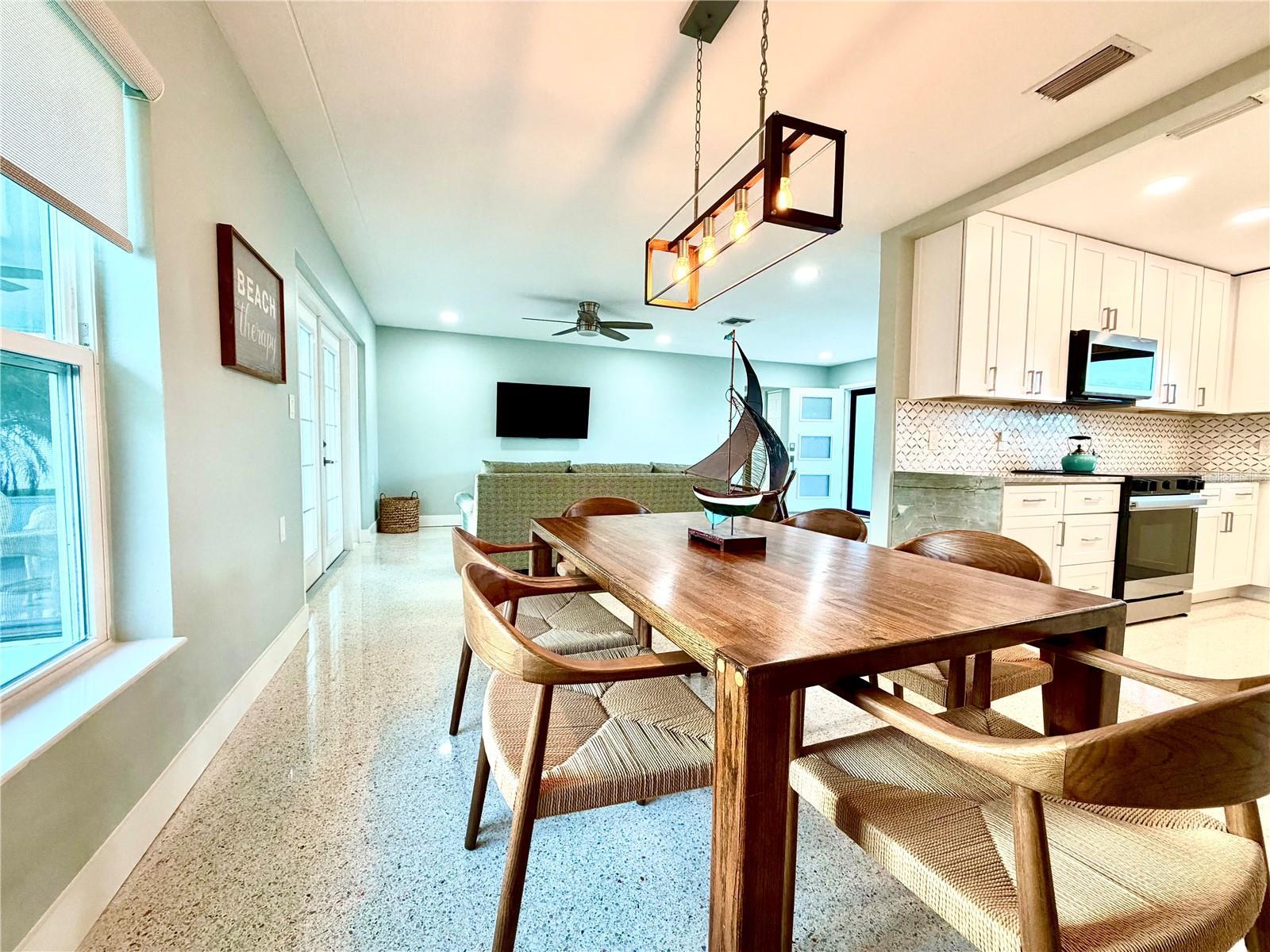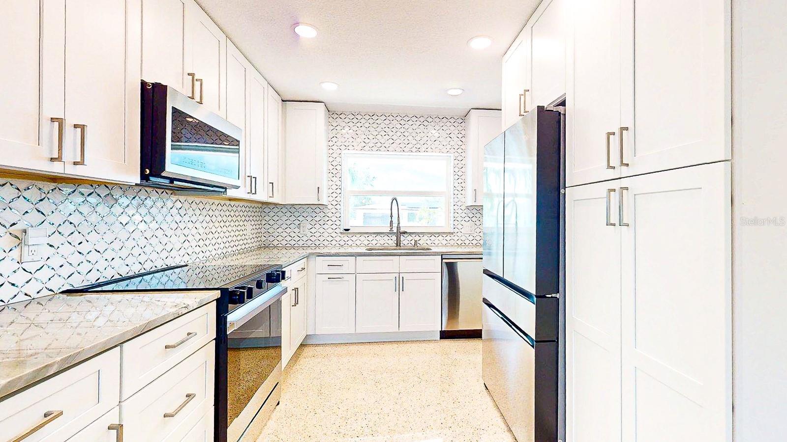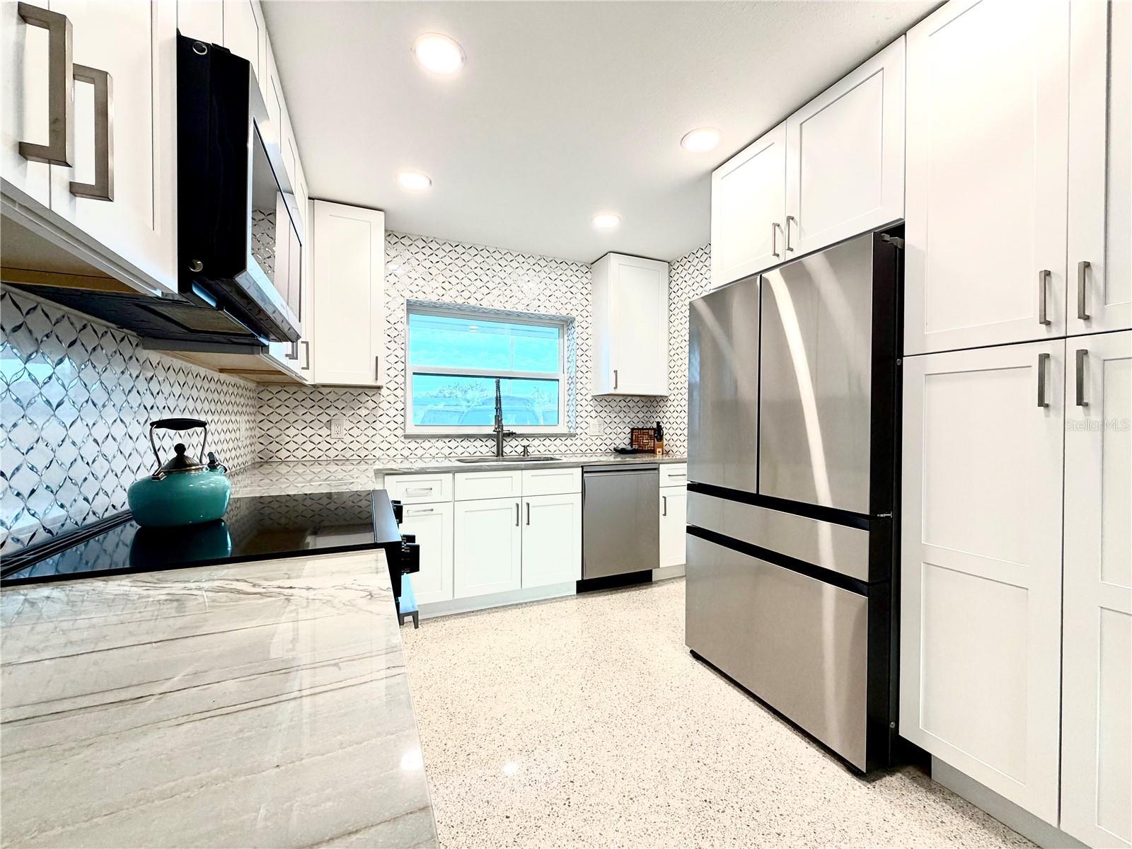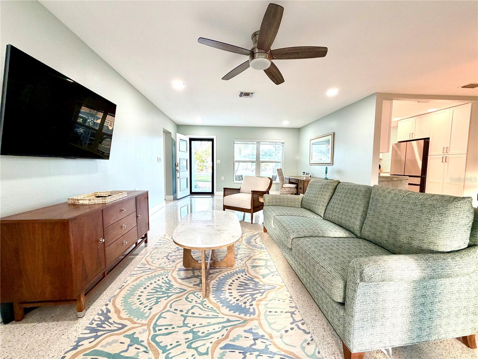 Location, Location, Location! Welcome to your perfect beach escape in Treasure Island. Nestled in a quiet neighborhood just moments from the beach, this beautifully renovated 2-bedroom, 2-bathroom home offers an open-concept layout with high end finishes, gleaming terrazzo floors, a spacious living and dining area, and a stunning new kitchen featuring quartzite countertops, solid wood cabinetry, a mother-of-pearl backsplash, and Samsung appliances. The stylish primary suite boasts a modern en suite bath with an oversized walk-in shower, smart led lighting mirrored cabinet, while the second bedroom features room for two beds and closet system, the guest bathroom is appointed with a beautiful stone top, solid wood cabinetry, and a soaking tub/shower combo, all bathrooms are appointed with Kohler fixtures. Enjoy hurricane-rated windows and doors, a large screened terrace under the roofline, and a fully fenced large backyard—perfect for relaxing or entertaining. Parking includes a circular driveway and a deep one-car garage with Tesla charger, laundry and utility tub. Conveniently located just 4 min from the beach, public tennis and pickleball courts, a dog park, and Publix grocery store on the island, plus only 15 minutes to vibrant downtown St. Pete and 40 minutes to Tampa International Airport. Close to St. Pete’s top beaches, dining, shopping, and water activities, this one pet friendly home is in a golf cart friendly, welcoming community. Walk through right now with the Matterport virtual reality tour!