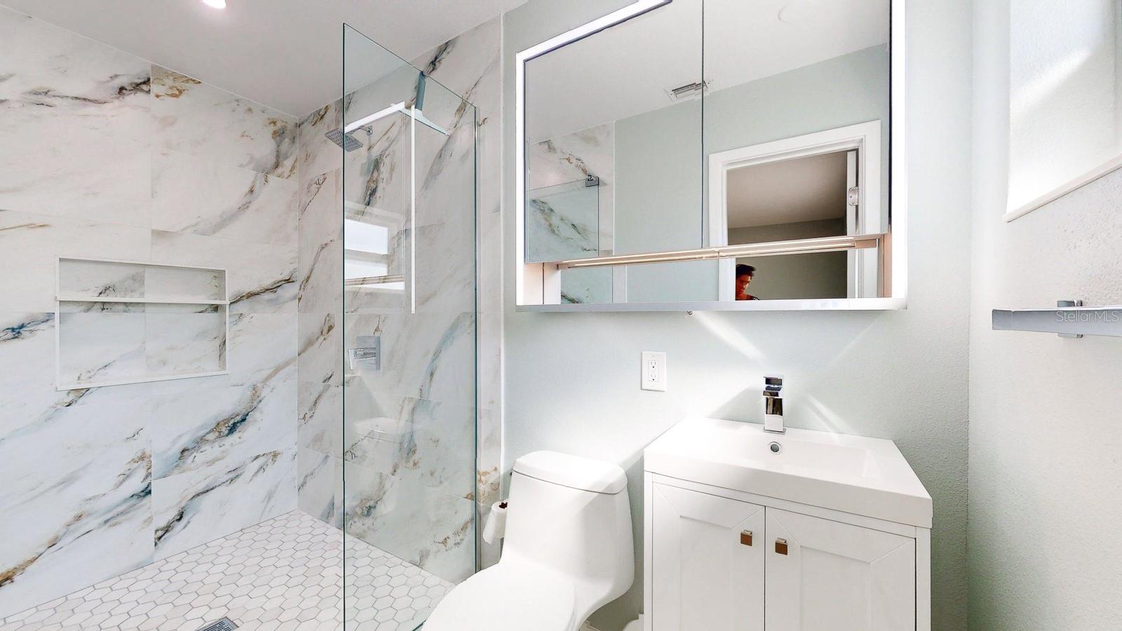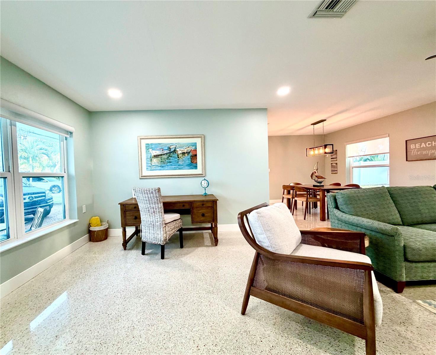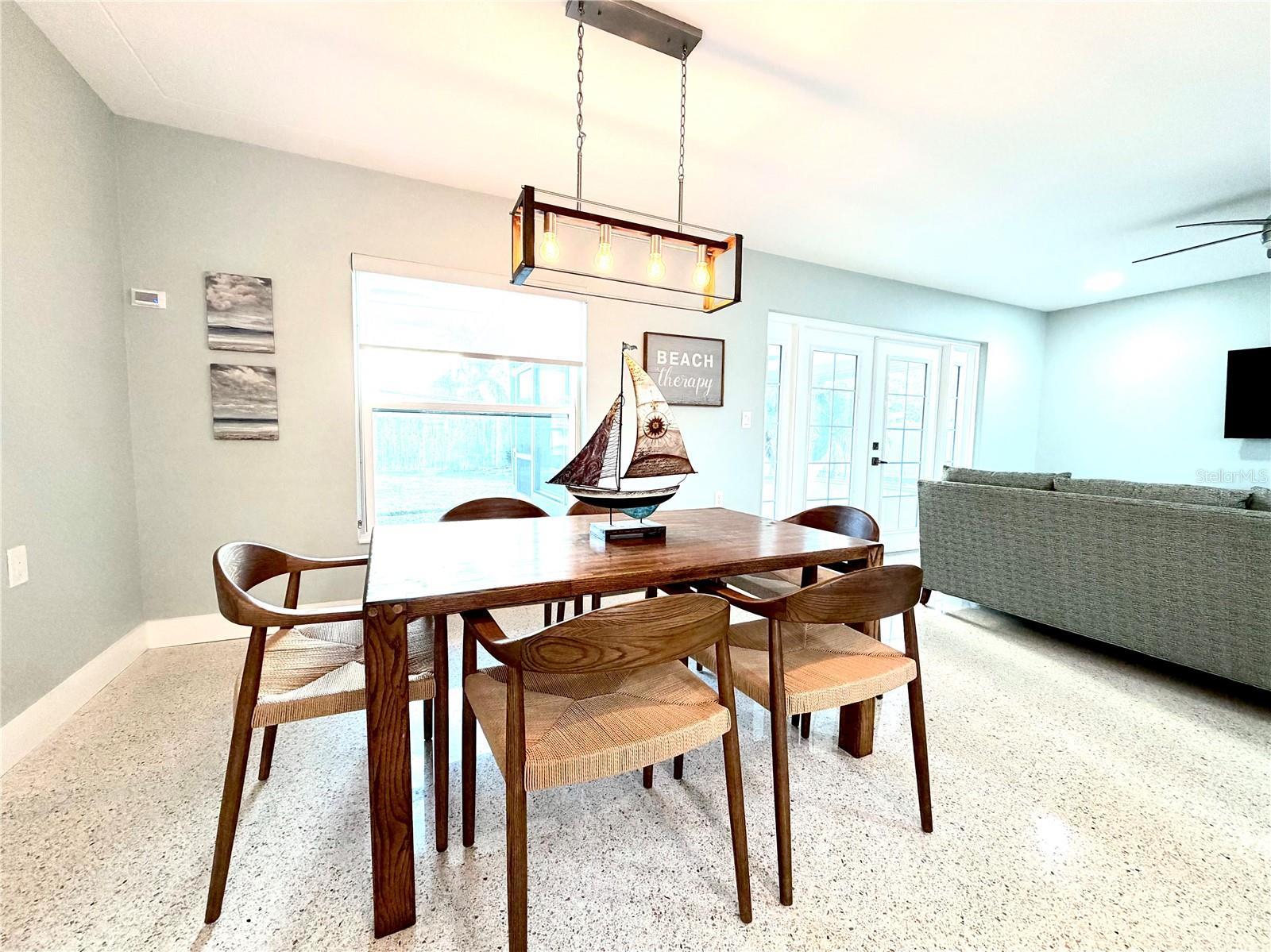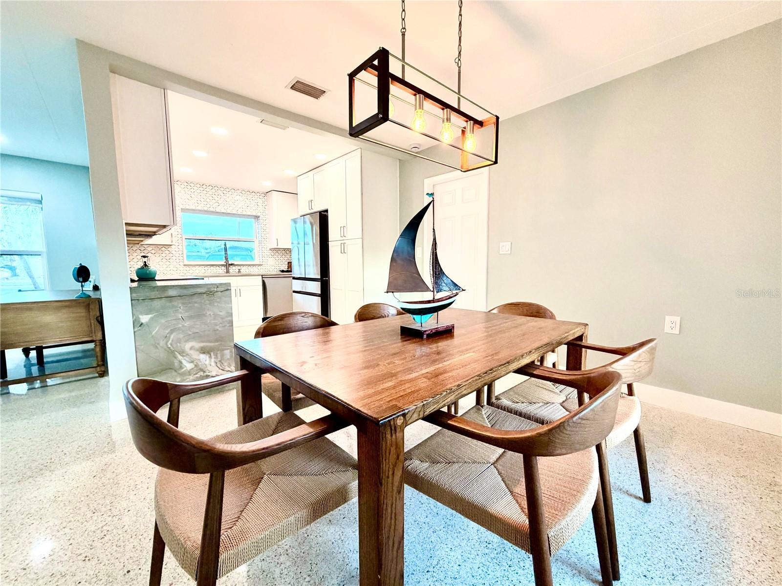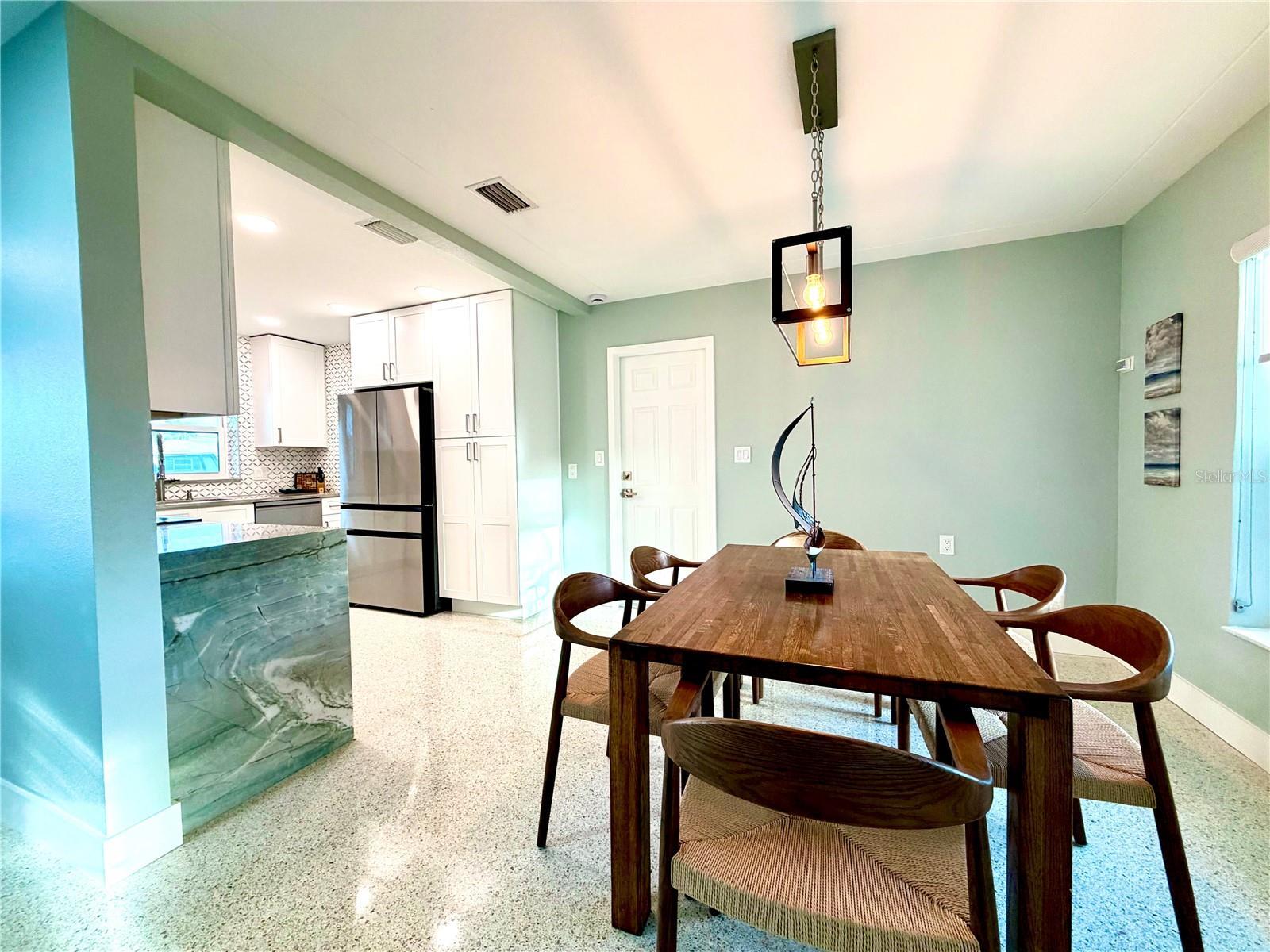 Location, Location, Location! Welcome to your perfect beach escape in Treasure Island. Nestled in a quiet neighborhood just moments from the beach, this beautifully renovated 2-bedroom, 2-bathroom home offers an open-concept layout with high end finishes, gleaming terrazzo floors, a spacious living and dining area, and a stunning new kitchen featuring quartzite countertops, solid wood cabinetry, a mother-of-pearl backsplash, and Samsung appliances. The stylish primary suite boasts a modern en suite bath with an oversized walk-in shower, smart led lighting mirrored cabinet, while the second bedroom features room for two beds and closet system, the guest bathroom is appointed with a beautiful stone top, solid wood cabinetry, and a soaking tub/shower combo, all bathrooms are appointed with Kohler fixtures. Enjoy hurricane-rated windows and doors, a large screened terrace under the roofline, and a fully fenced large backyard—perfect for relaxing or entertaining. Parking includes a circular driveway and a deep one-car garage with Tesla charger, laundry and utility tub. Conveniently located just 4 min from the beach, public tennis and pickleball courts, a dog park, and Publix grocery store on the island, plus only 15 minutes to vibrant downtown St. Pete and 40 minutes to Tampa International Airport. Close to St. Pete’s top beaches, dining, shopping, and water activities, this one pet friendly home is in a golf cart friendly, welcoming community. Walk through right now with the Matterport virtual reality tour!
