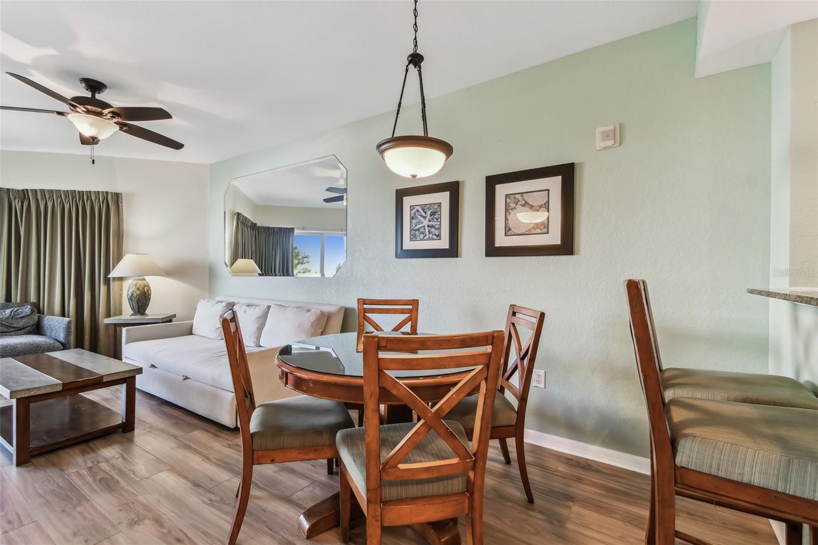 - Ceiling Fans(s), Living Room/Dining Room Combo, Solid Surface Counters, Split Bedroom, Window Treatments