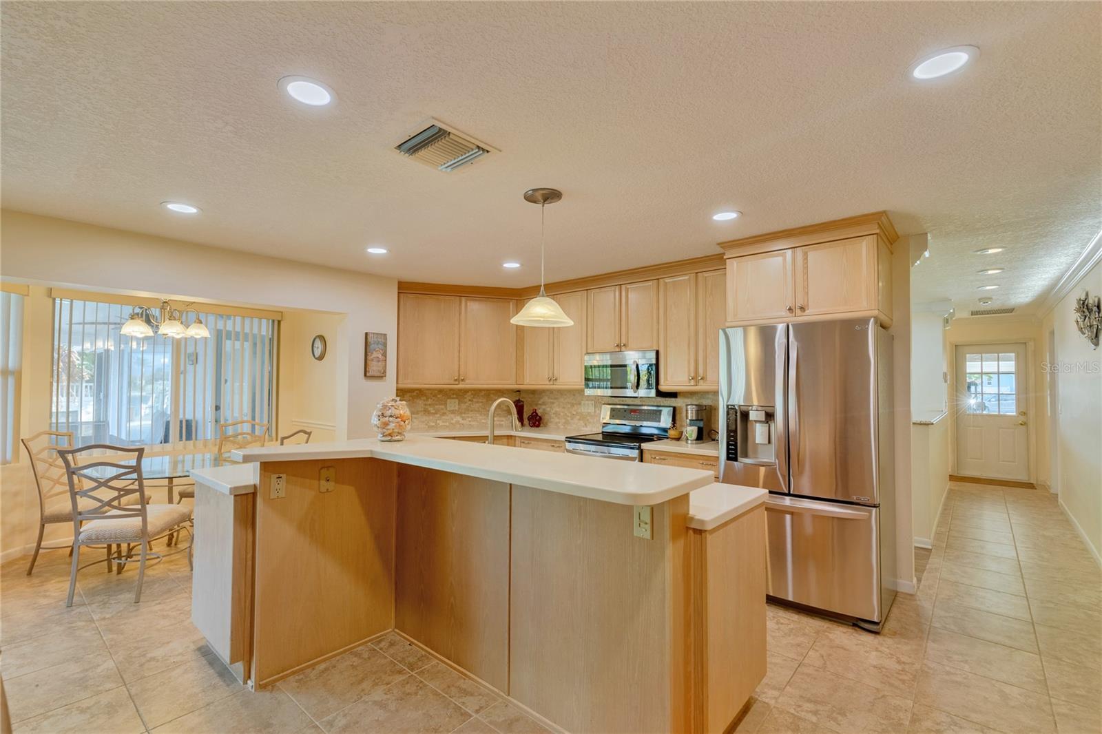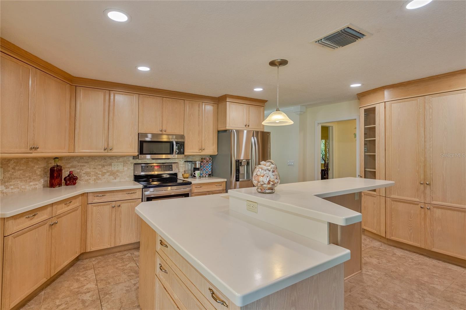 - Built-in Features, Ceiling Fans(s), Central Vaccum, Crown Molding, Dry Bar, Eat-in Kitchen, Kitchen/Family Room Combo, L Dining, Living Room/Dining Room Combo, Open Floorplan, Primary Bedroom Main Floor, Solid Surface Counters, Solid Wood Cabinets, Thermostat, Walk-In Closet(s), Wet Bar